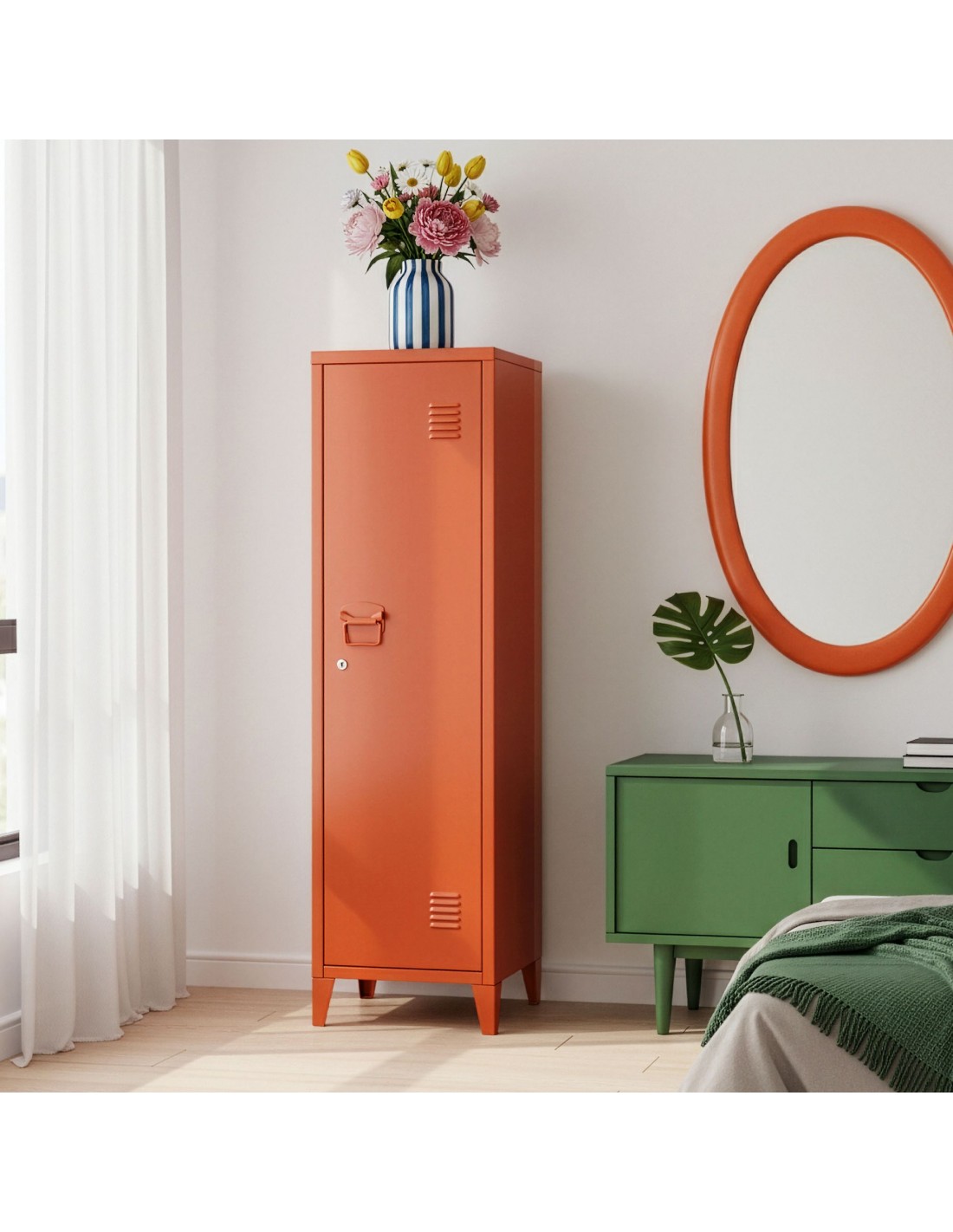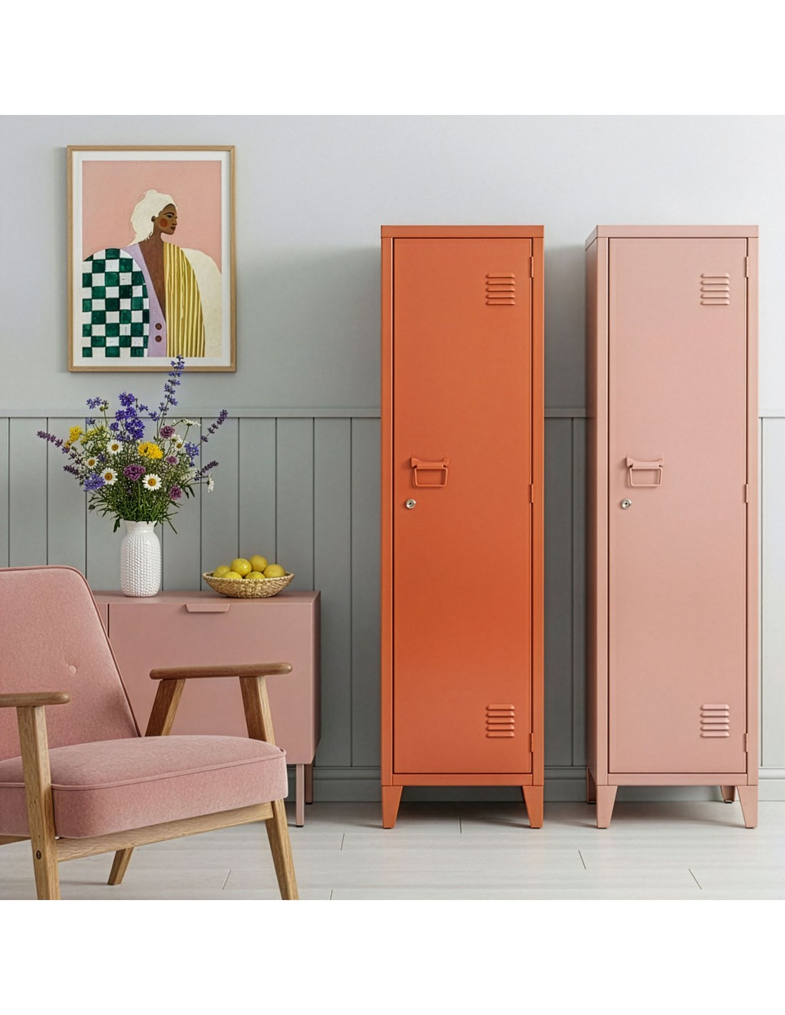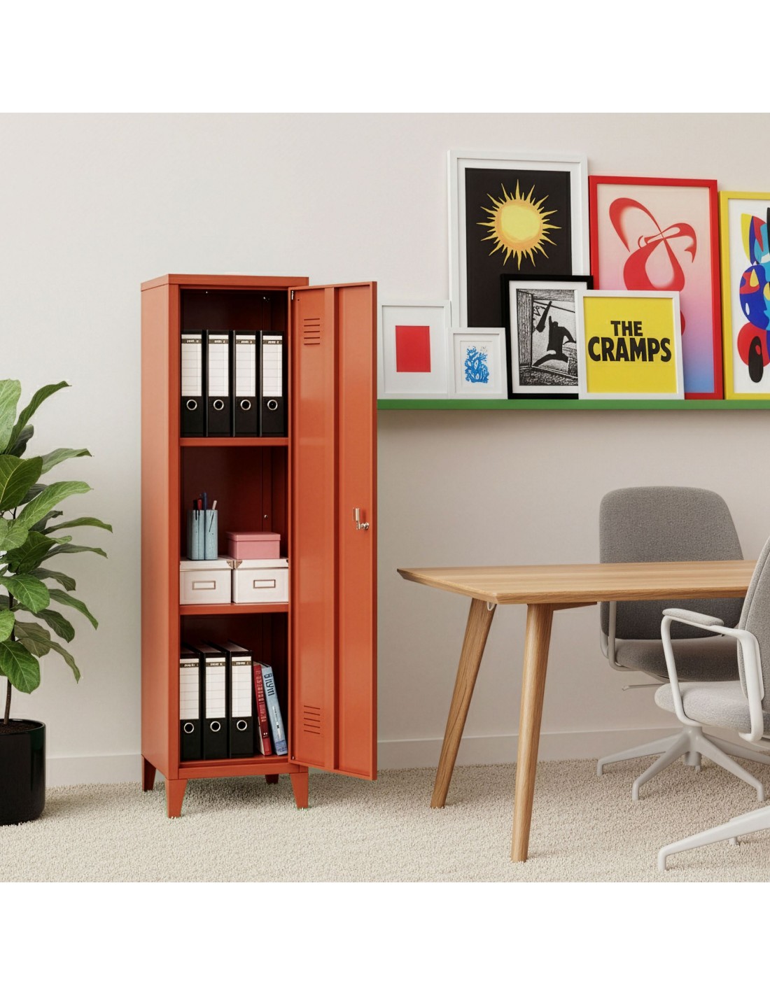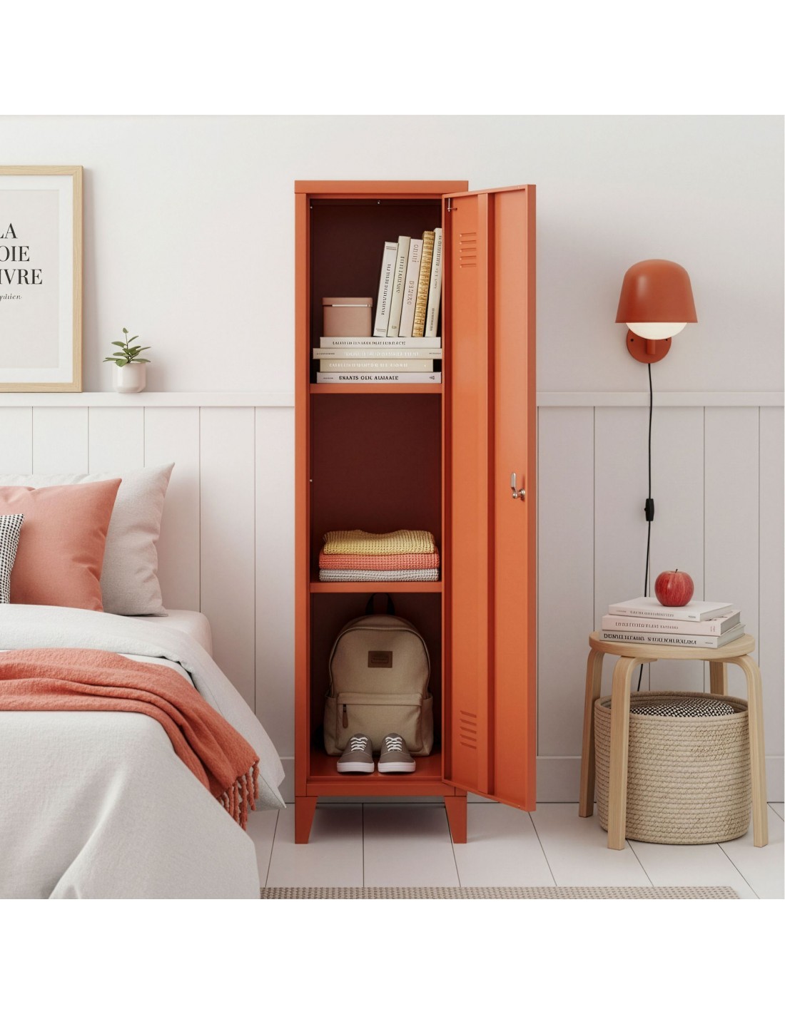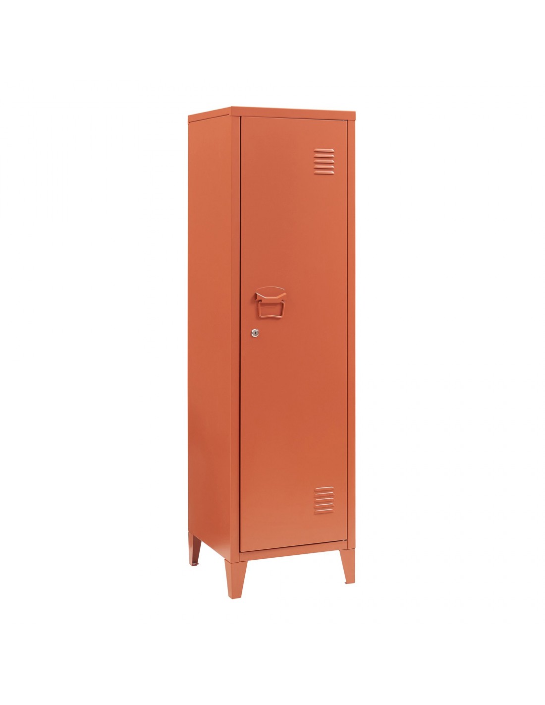 Kurik garderobeskab udført i et design af murstensrød lakeret metal. Garderobeskabet måler 137 cm i højden og 38 x 38 cm i bredde og dybde og indeholder 3 hylderum.