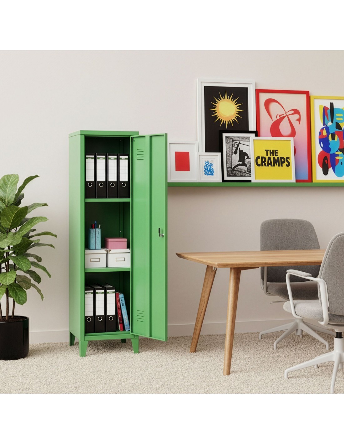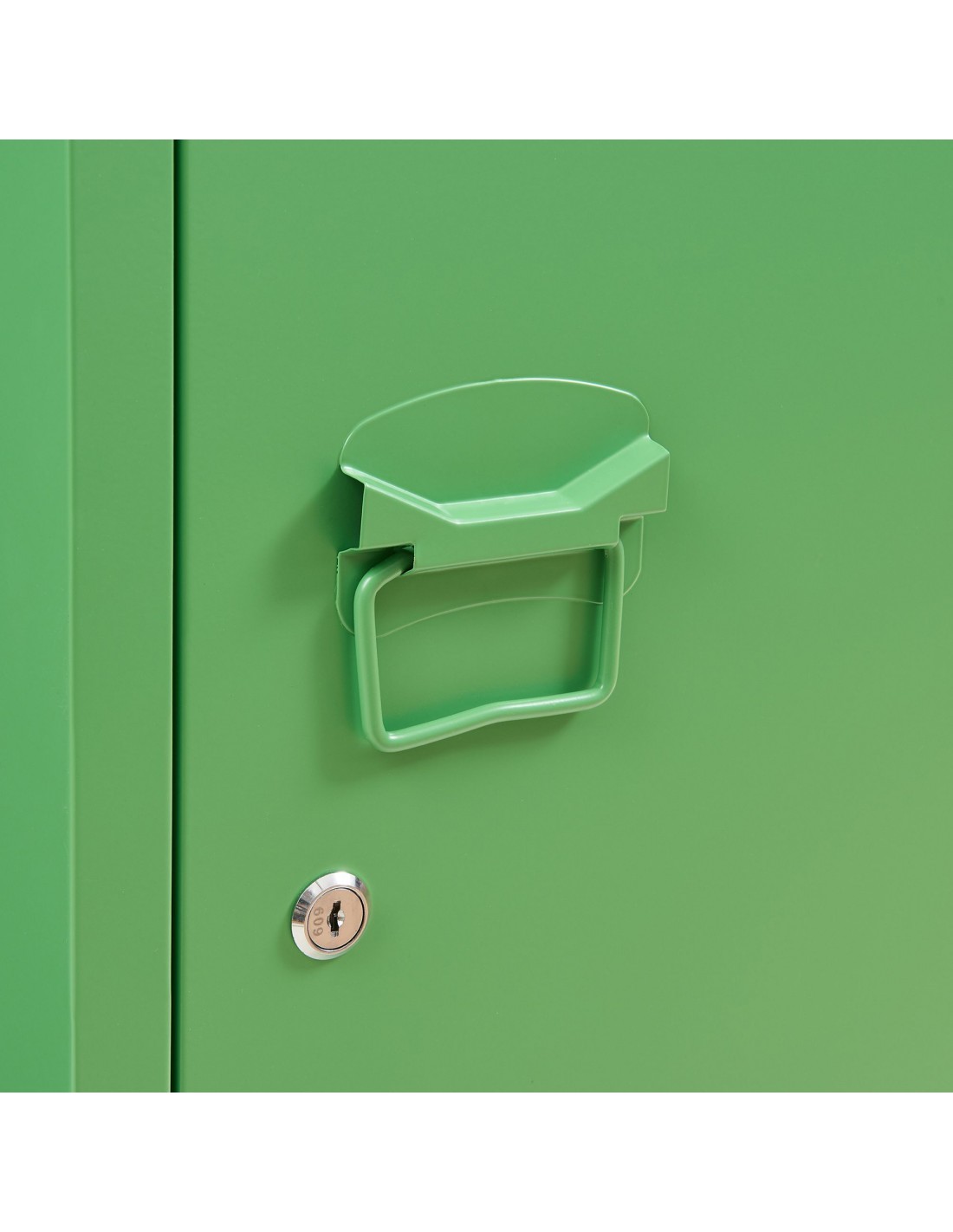 Kurik garderobeskab udført i et design af æblegrøn lakeret metal. Garderobeskabet måler 137 cm i højden og 38 x 38 cm i bredde og dybde og indeholder 3 hylderum.
