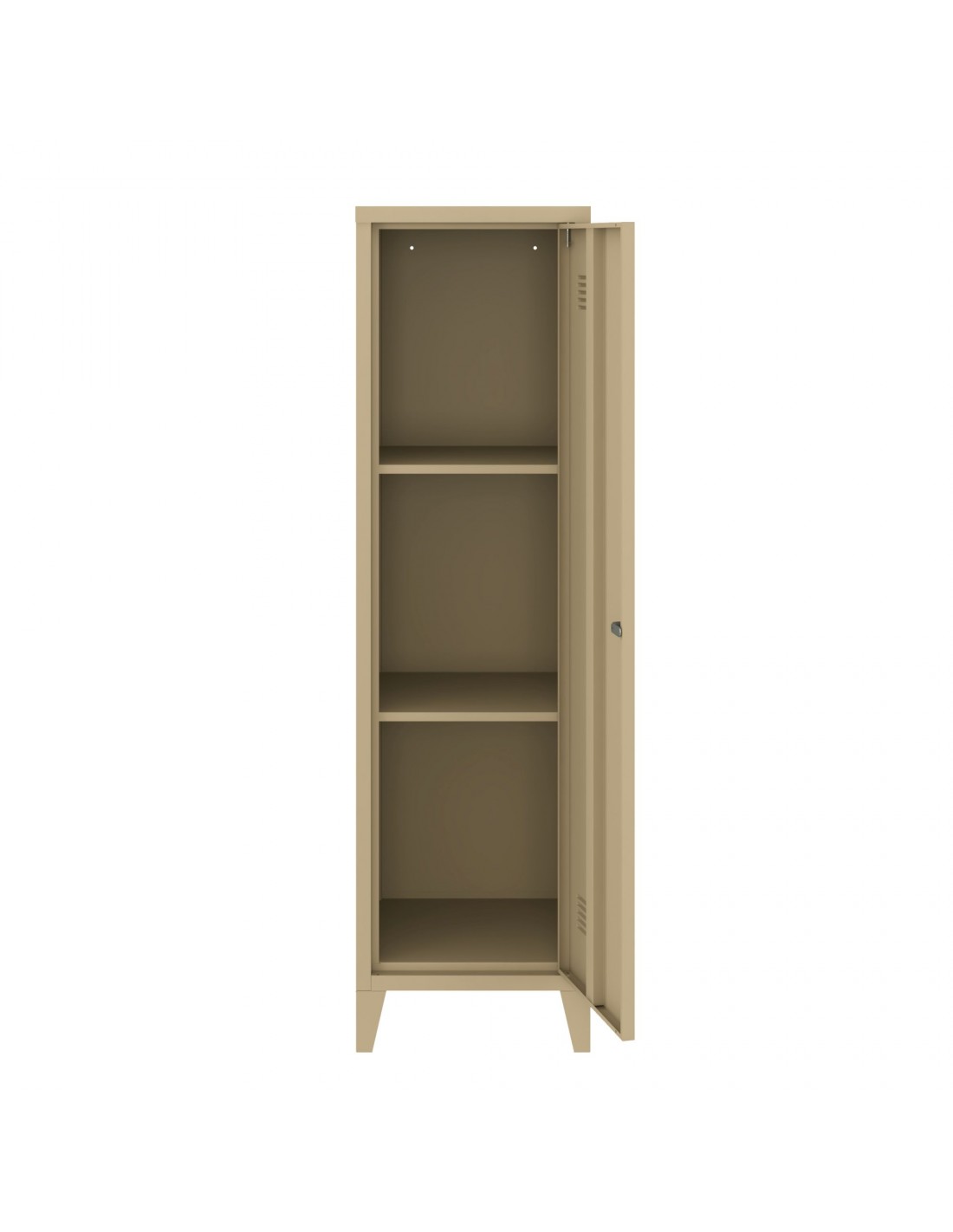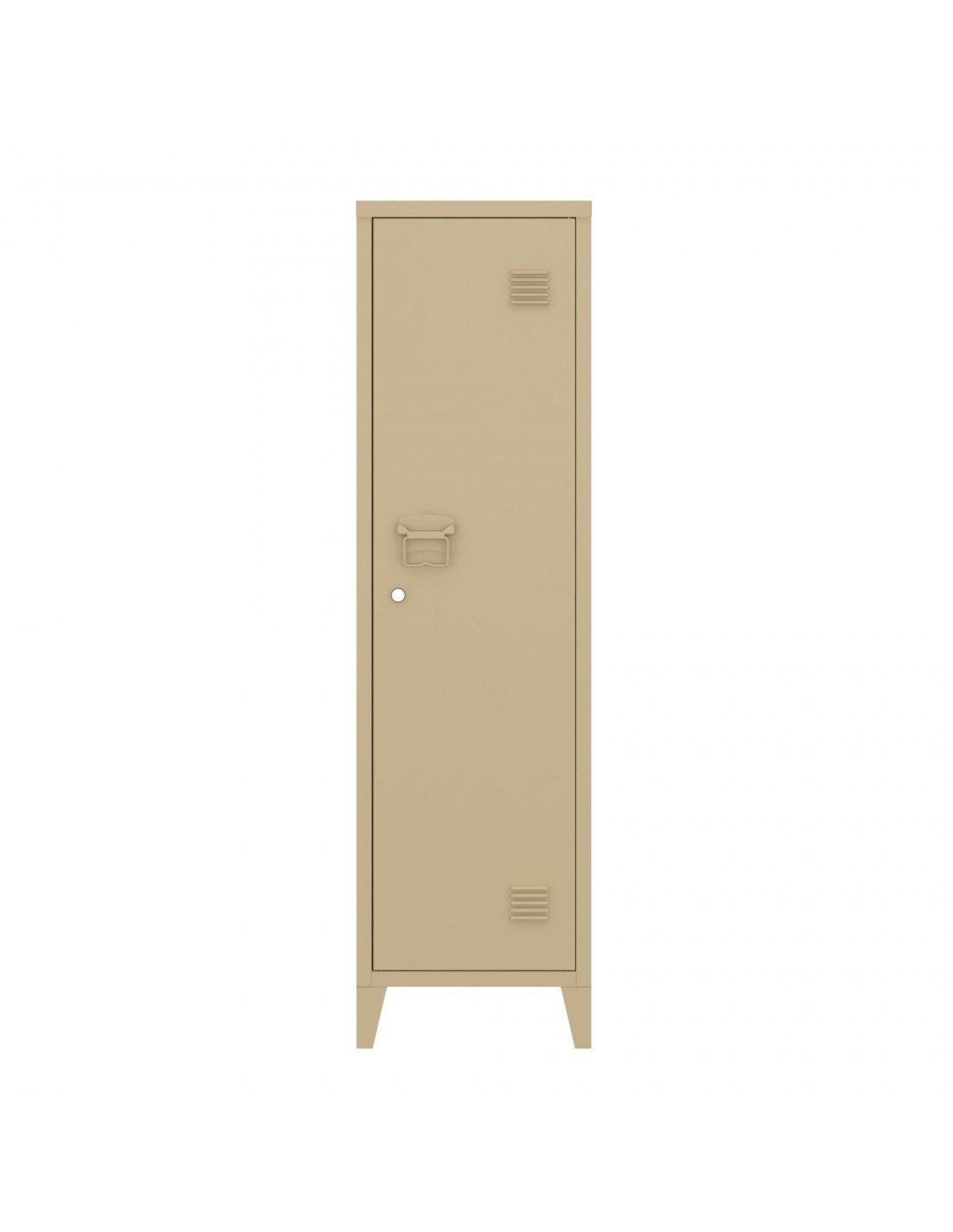 Kurik garderobeskab udført i et design af kamelbrun lakeret metal. Garderobeskabet måler 137 cm i højden og 38 x 38 cm i bredde og dybde og indeholder 3 hylderum.