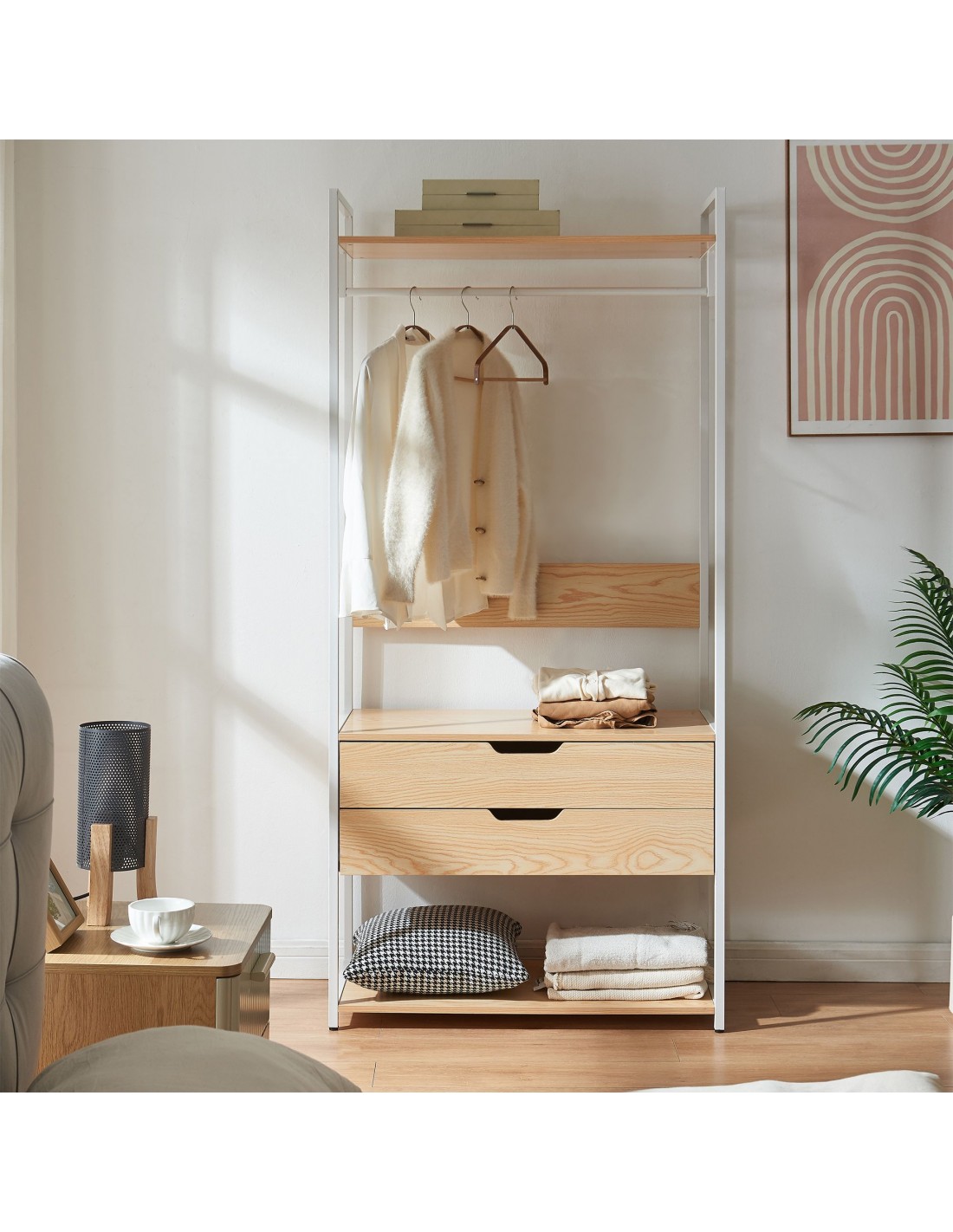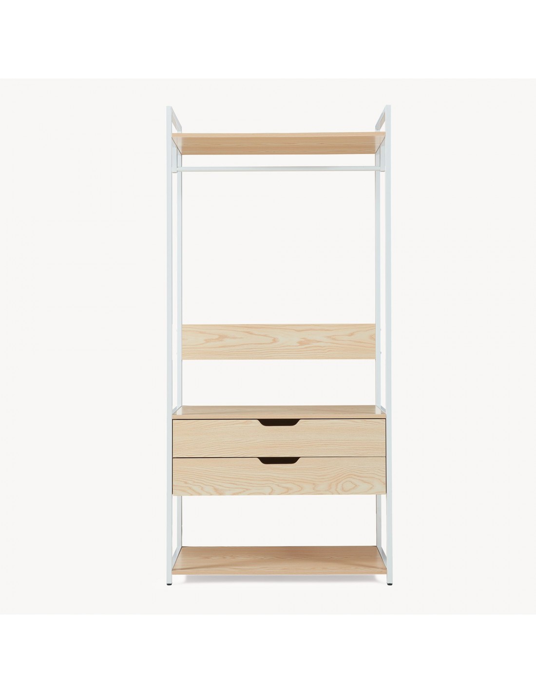 Garderobe udført i et design af hvidlakeret metal og naturfarvet møbelplade. Garderoben måler 180 cm i højden og 84 x 40 cm i bredde og dybde. Denne garderobe kommer med 2 skuffer.