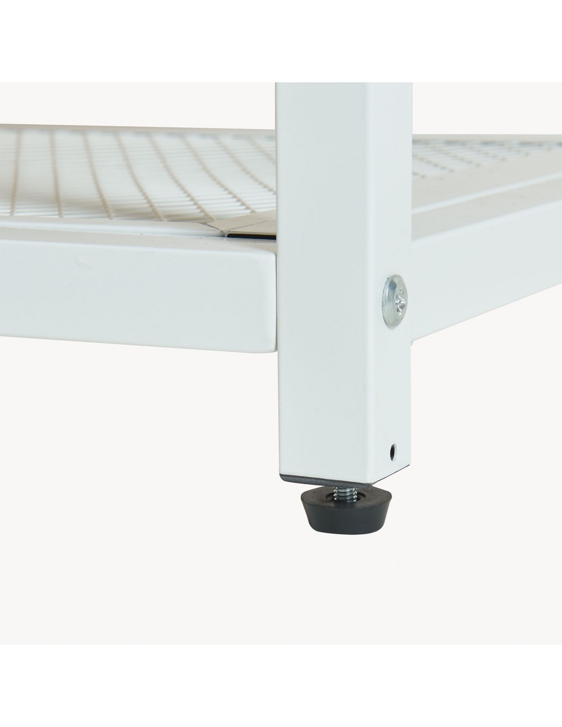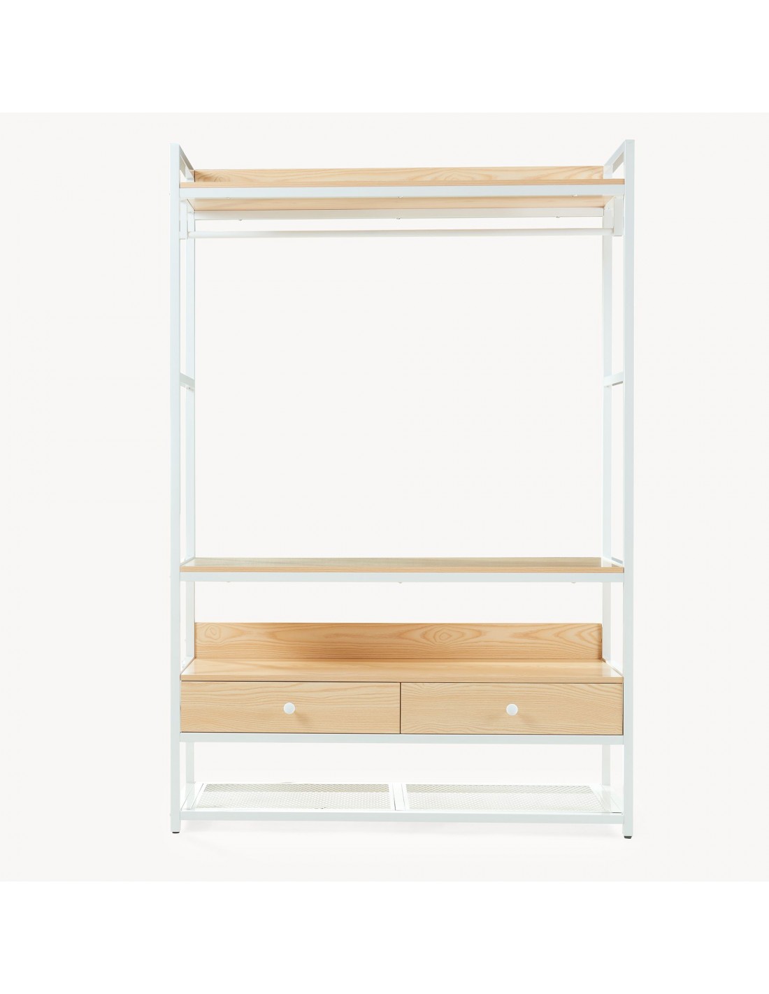 Garderobe udført i et design af hvidlakeret metal og naturfarvet møbelplade. Garderoben måler 180 cm i højden og 120 x 40 cm i bredde og dybde. Denne garderobe kommer med 1 skohylde, 2 skuffer og 3 hylder.