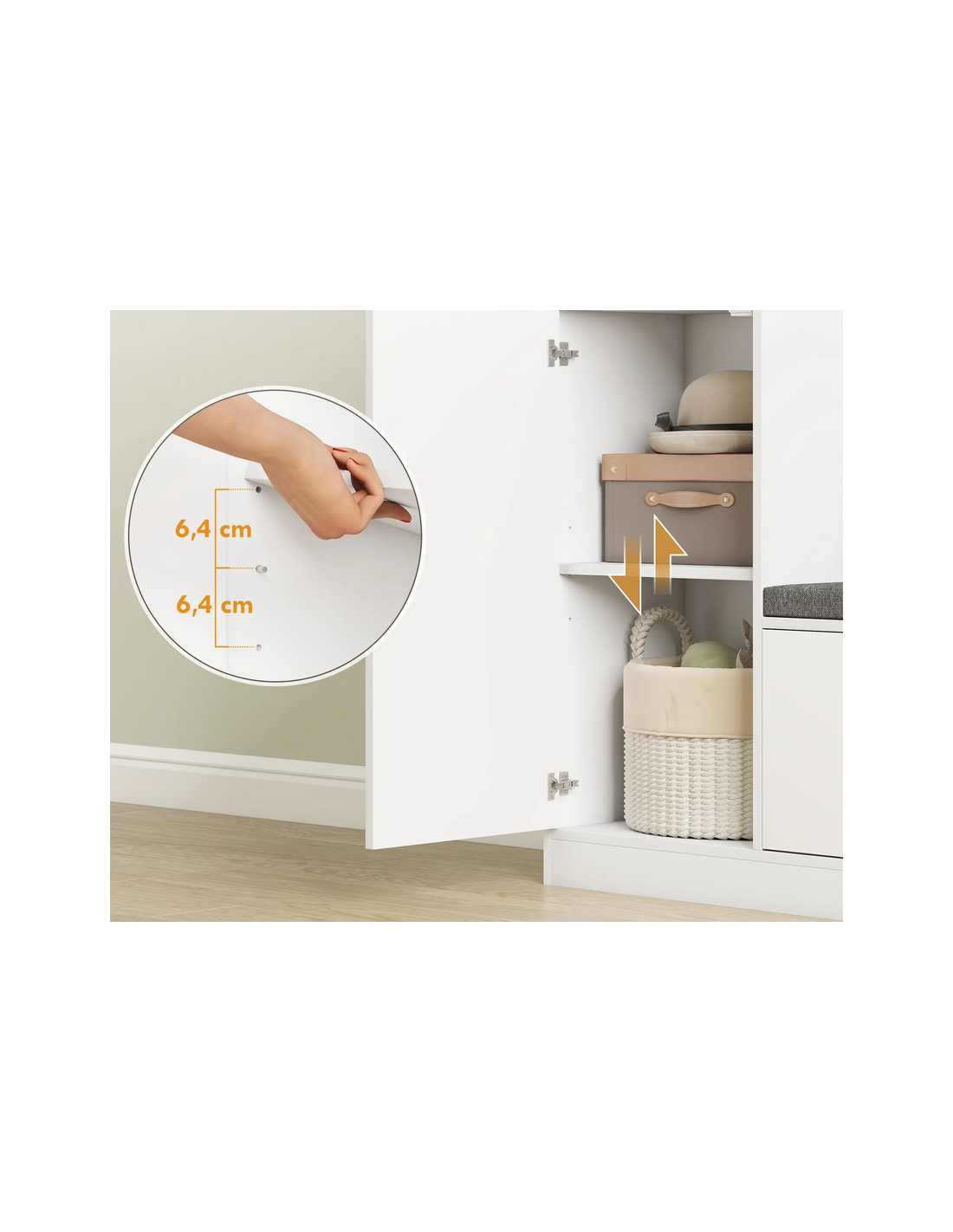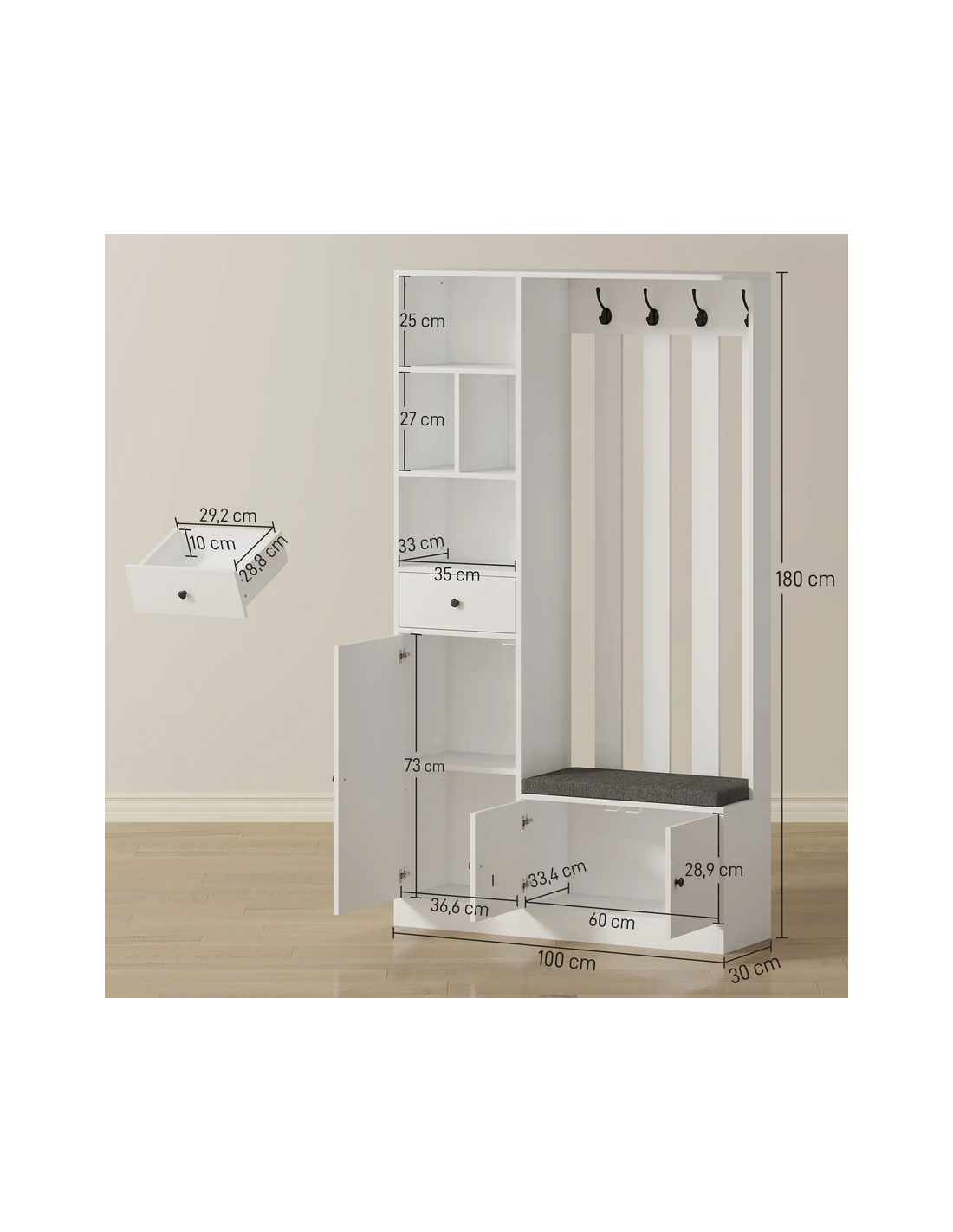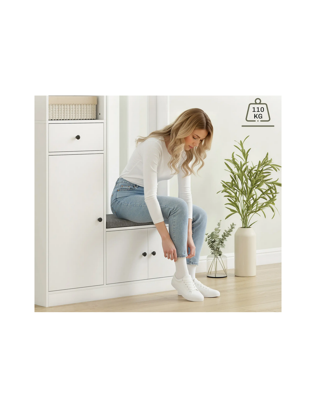 Garderobe udført i et design af hvid MDF og møbelplade med siddehynde i grå skumfyldt polyester. Garderoben måler 180 cm i højden og 100 x 30 cm i bredde og dybde og byder på opbevaring af både overtøj og sko.