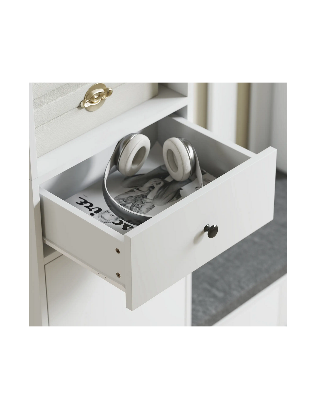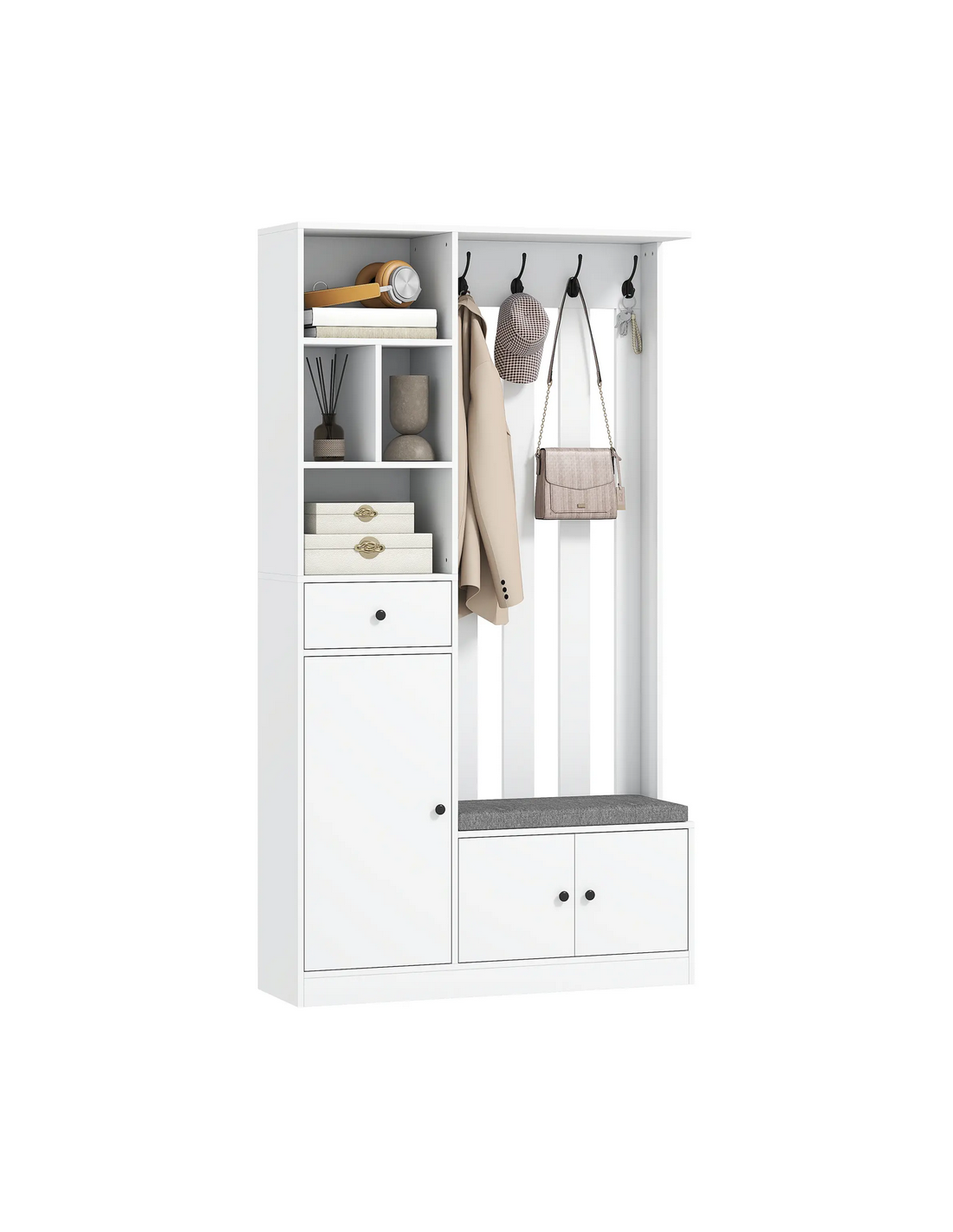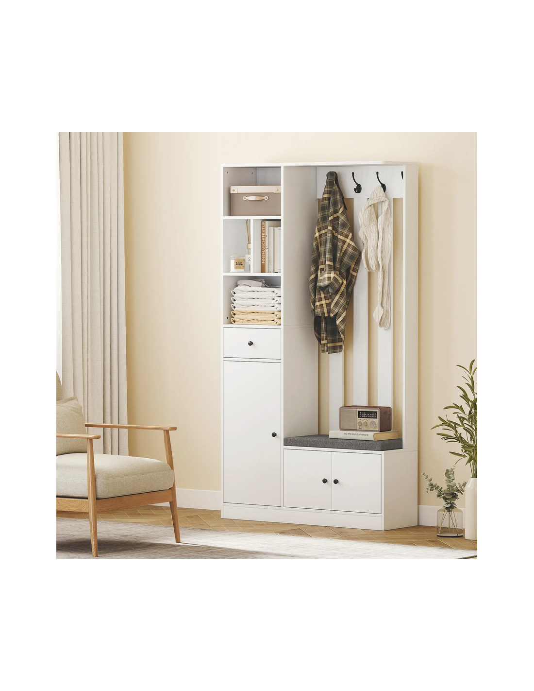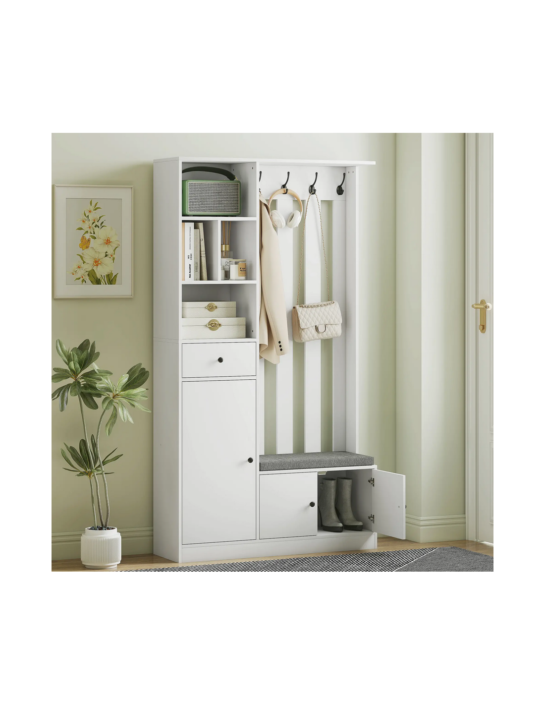 Garderobe udført i et design af hvid MDF og møbelplade med siddehynde i grå skumfyldt polyester. Garderoben måler 180 cm i højden og 100 x 30 cm i bredde og dybde og byder på opbevaring af både overtøj og sko.