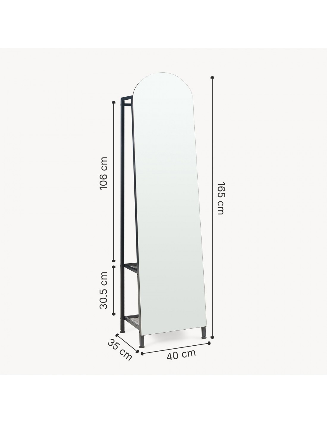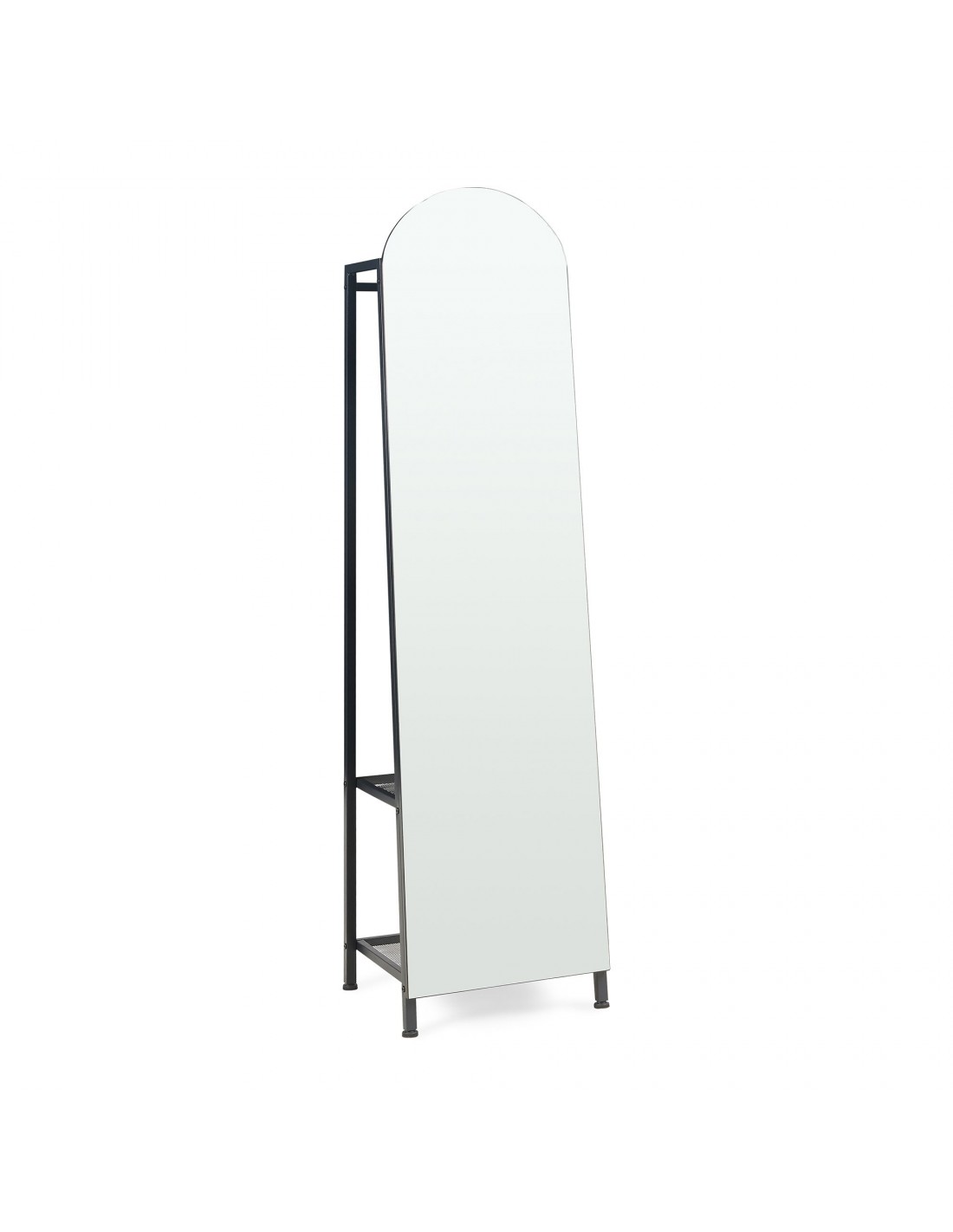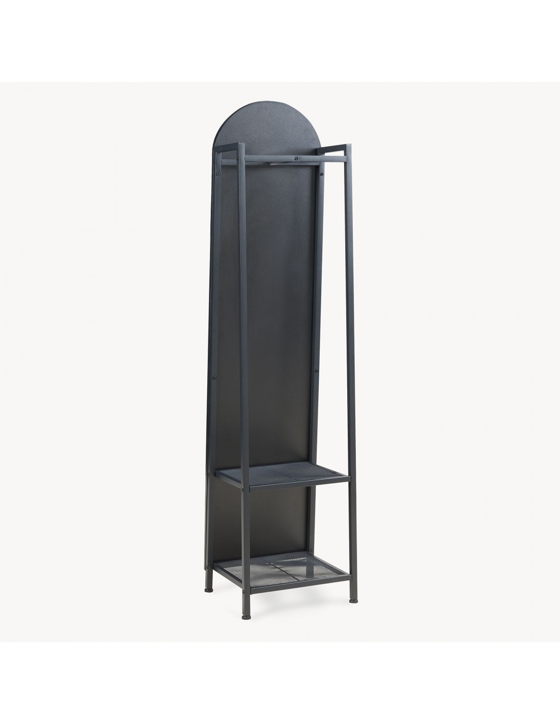 Gulvspejl med hylder og bøjlestang, udført i et design af sortlakeret metal. Spejlet måler 165 cm i højden og 40 x 35 cm i bredde og dybde.