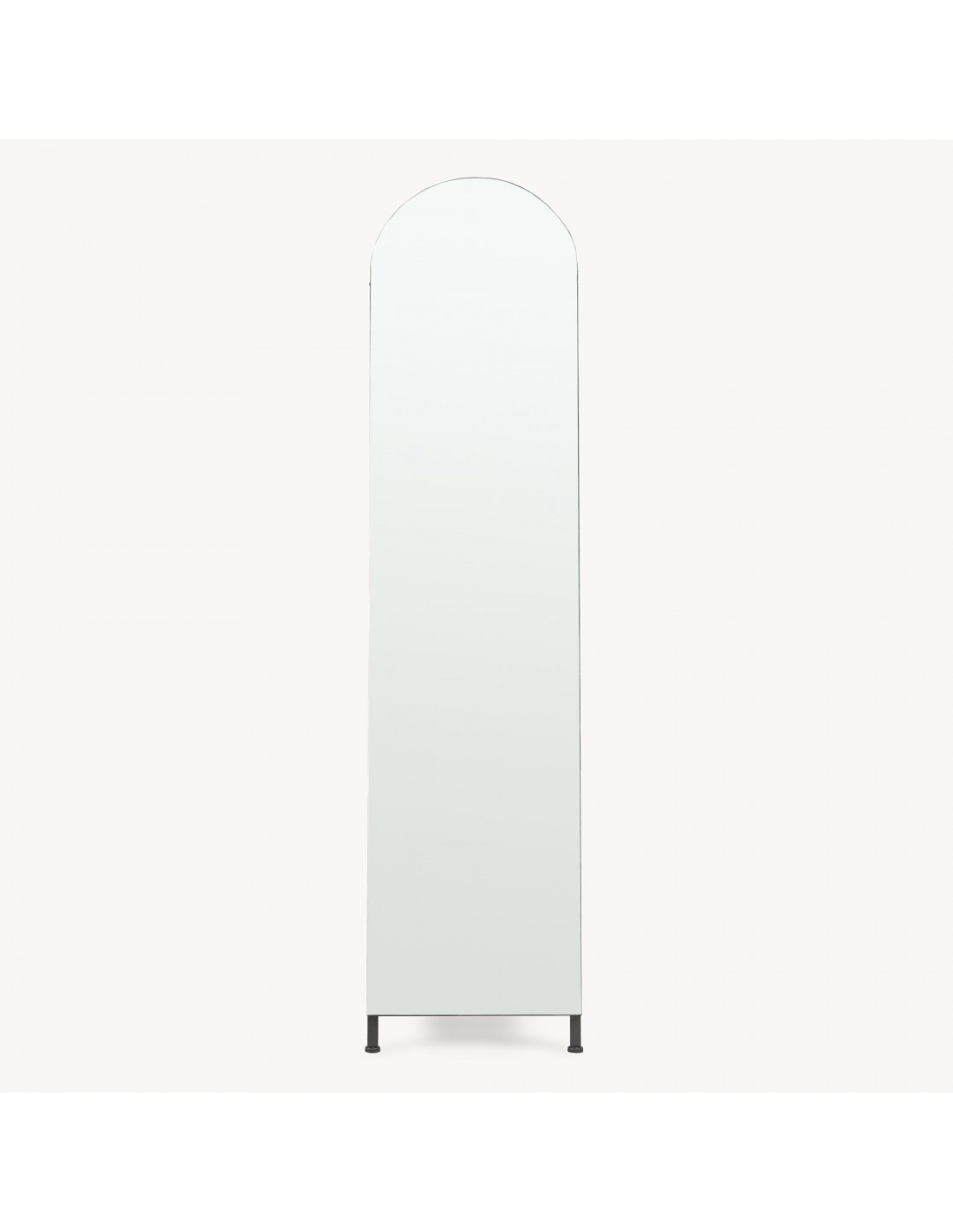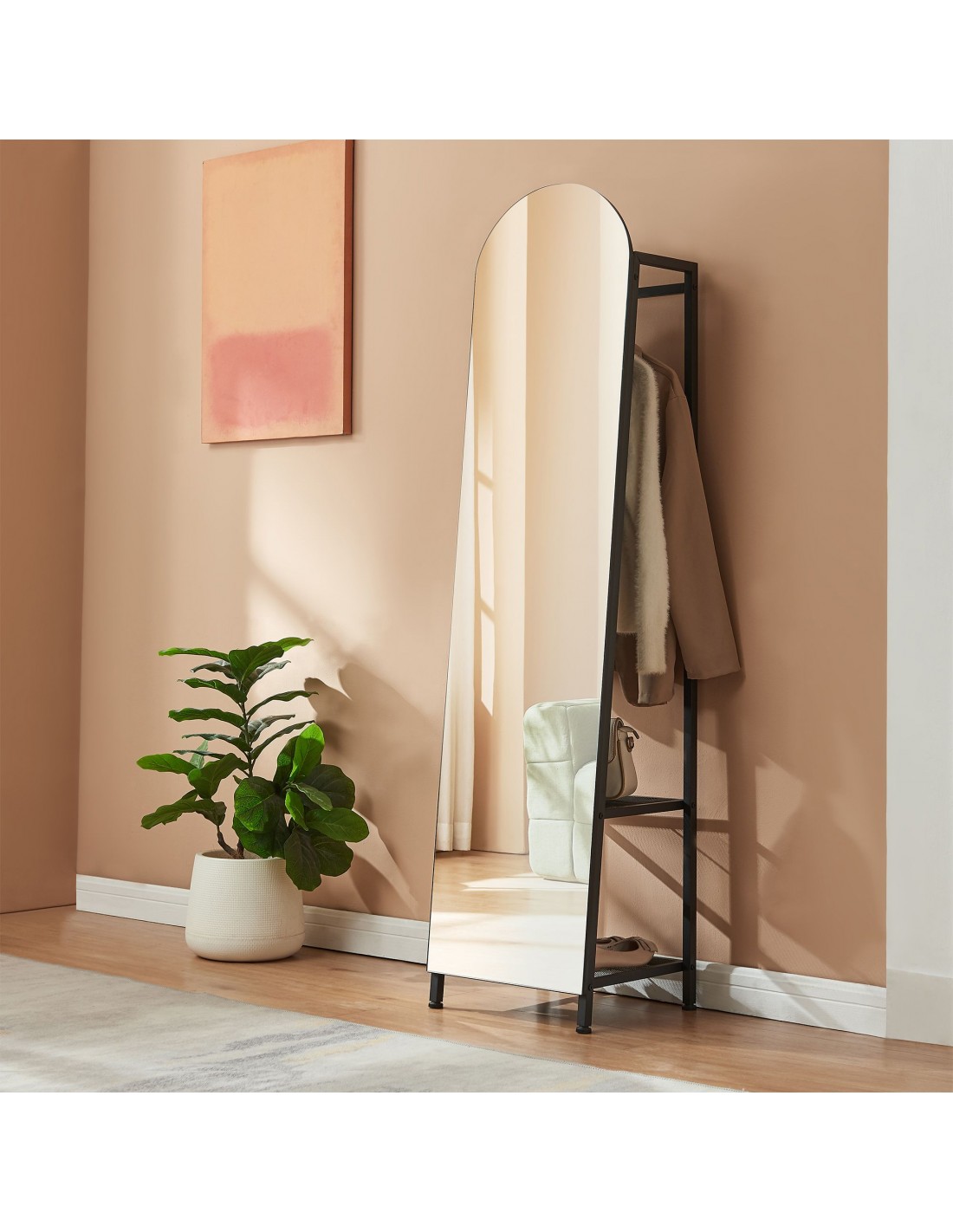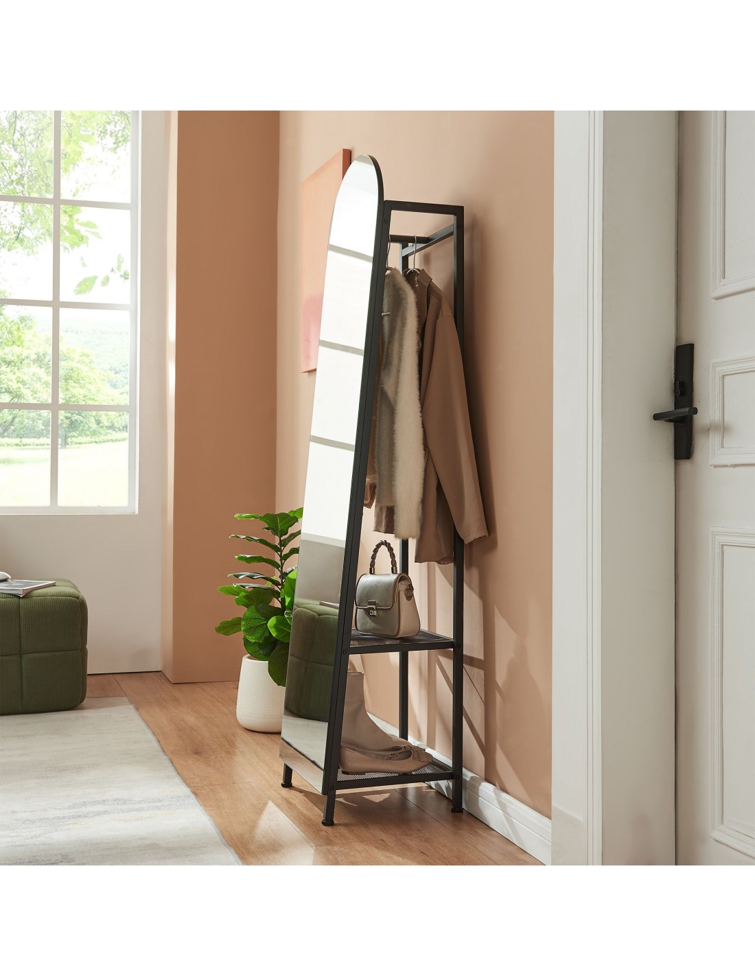 Gulvspejl med hylder og bøjlestang, udført i et design af sortlakeret metal. Spejlet måler 165 cm i højden og 40 x 35 cm i bredde og dybde.