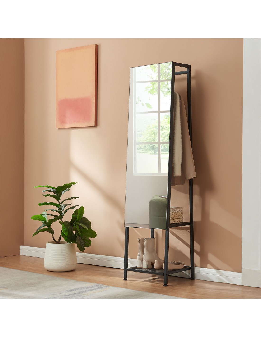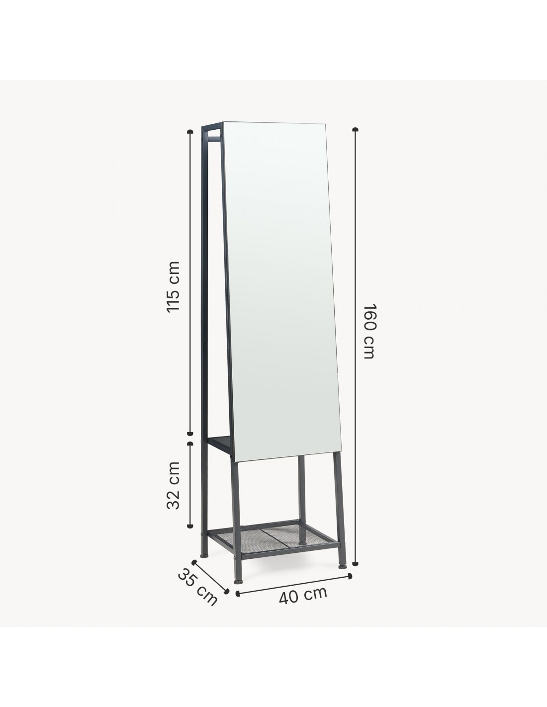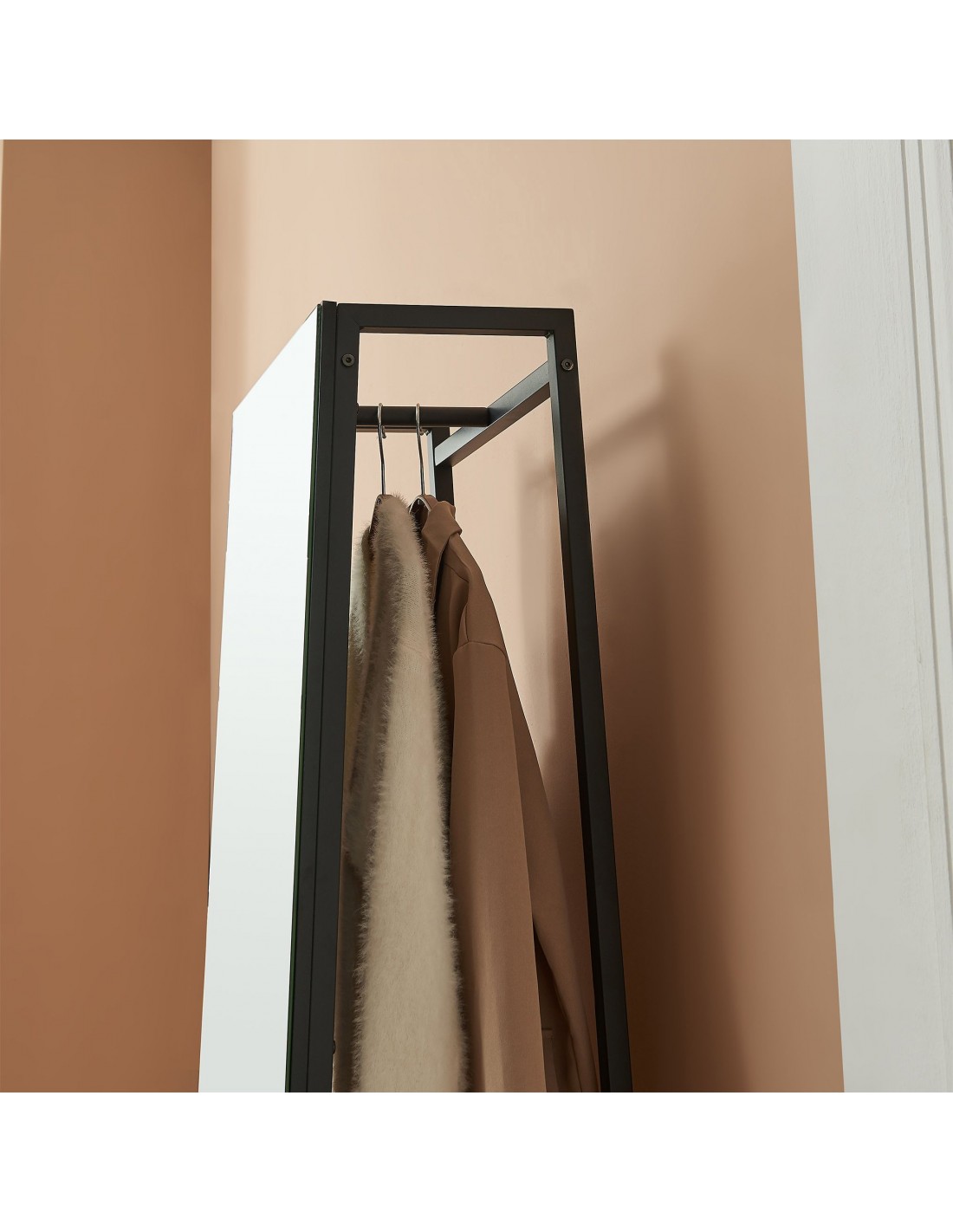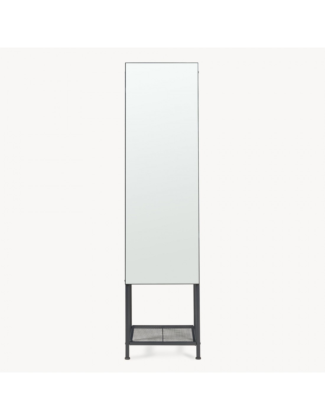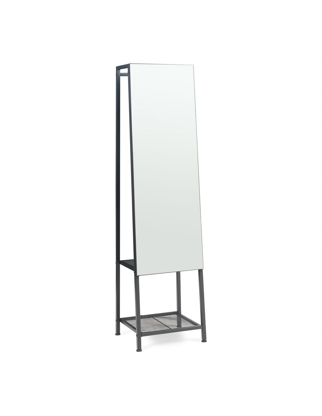 Gulvspejl med hylder og bøjlestang, udført i et design af sortlakeret metal. Spejlet måler 160 cm i højden og 40 x 35 cm i bredde og dybde.