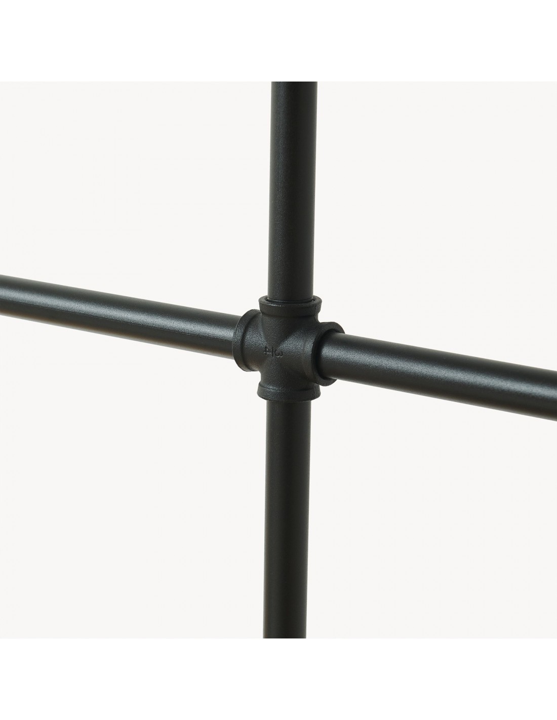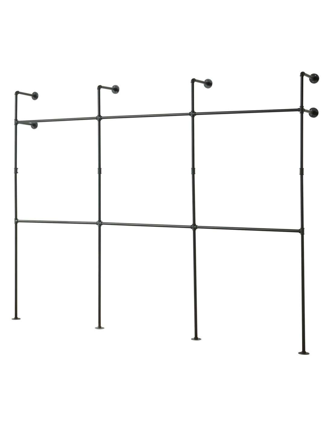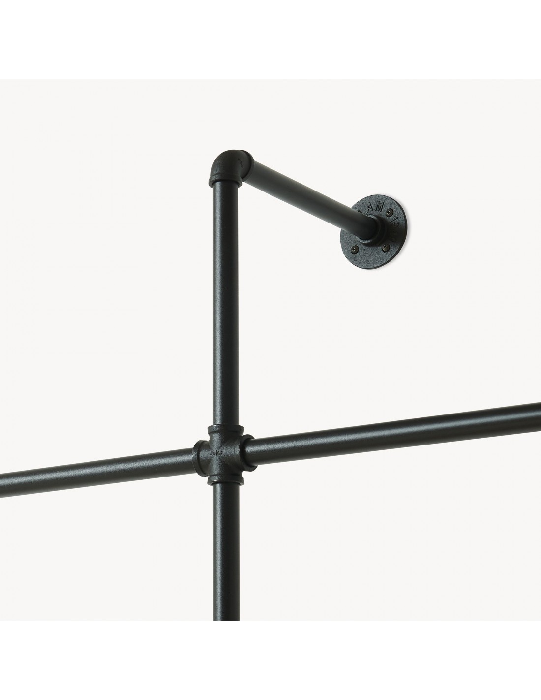 Tøjstativ udført i et industrielt design af sortlakeret stål vandrør til fastmontering på væg. Stativet måler 222 cm i højden og 296 x 31 cm i bredde og dybde.