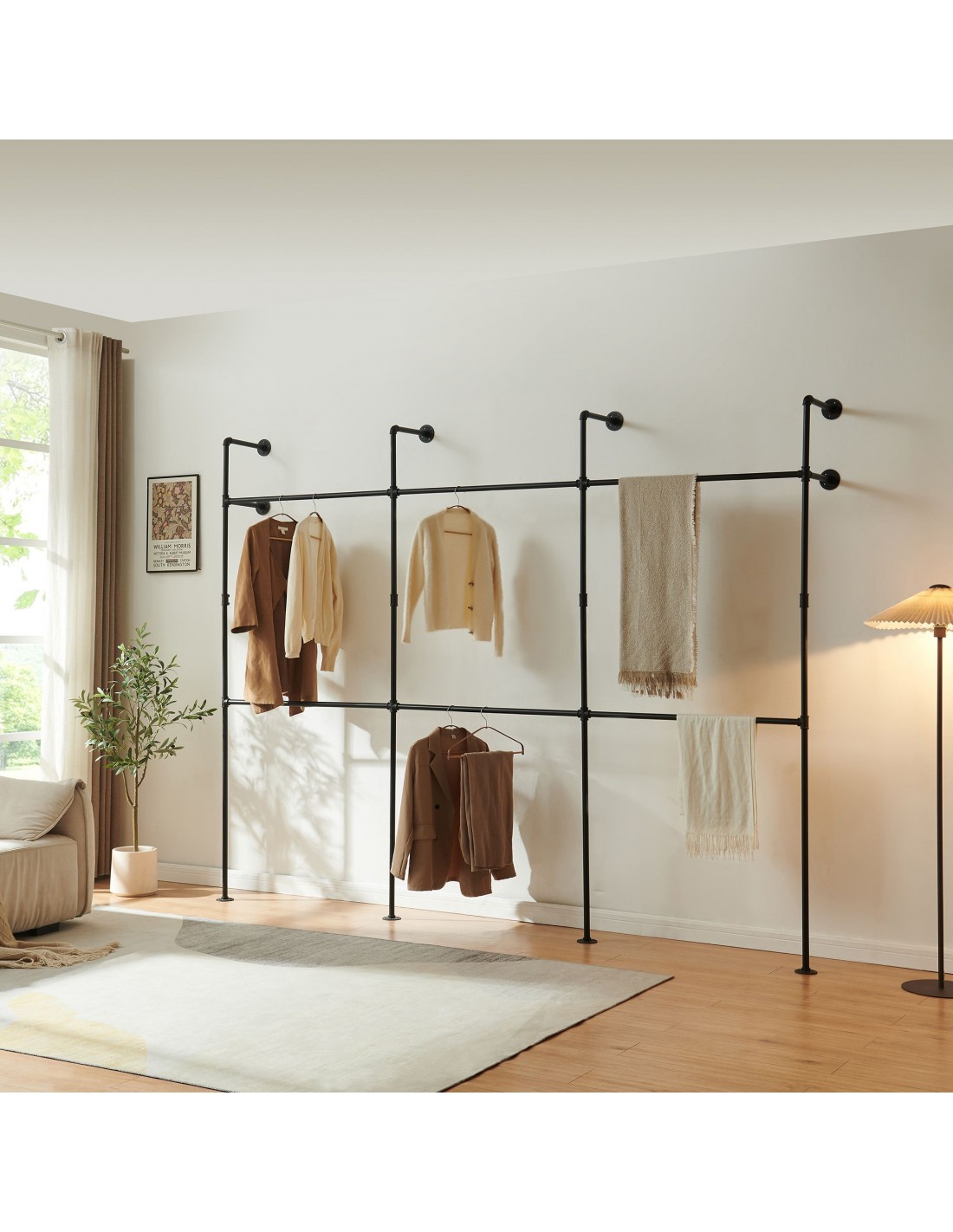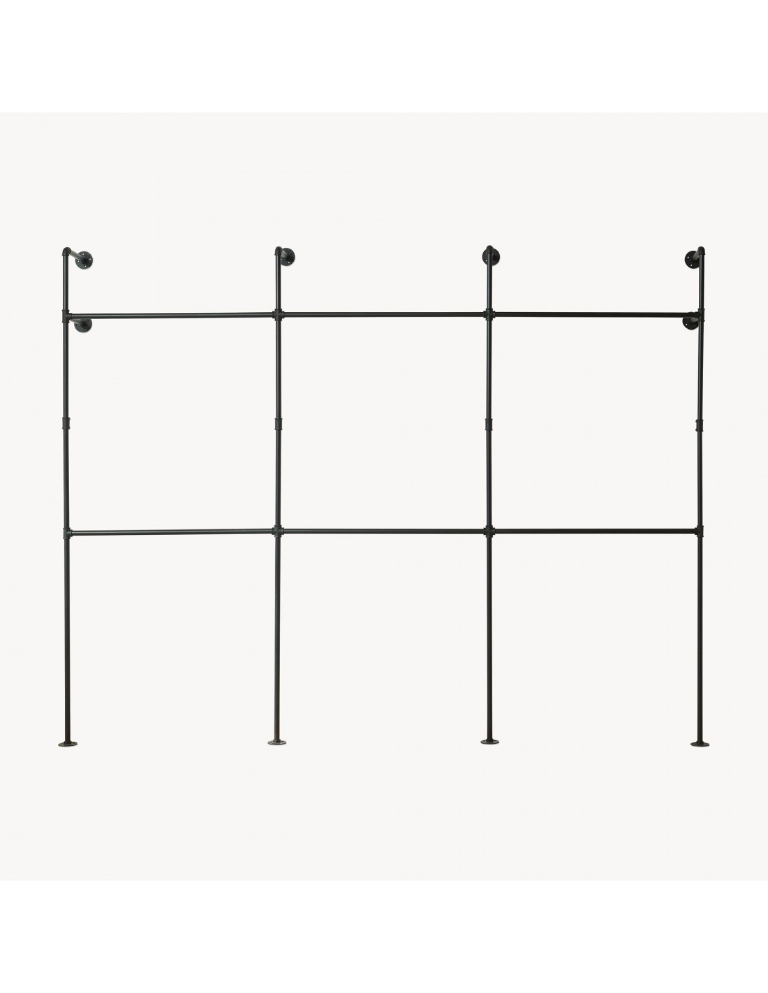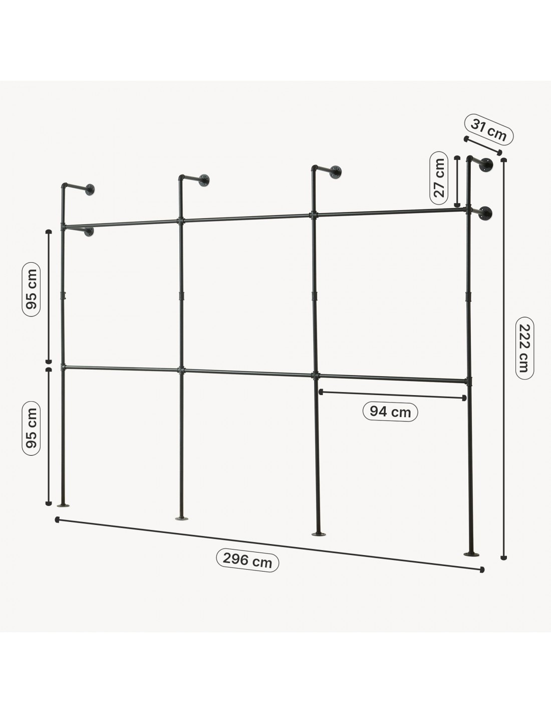 Tøjstativ udført i et industrielt design af sortlakeret stål vandrør til fastmontering på væg. Stativet måler 222 cm i højden og 296 x 31 cm i bredde og dybde.