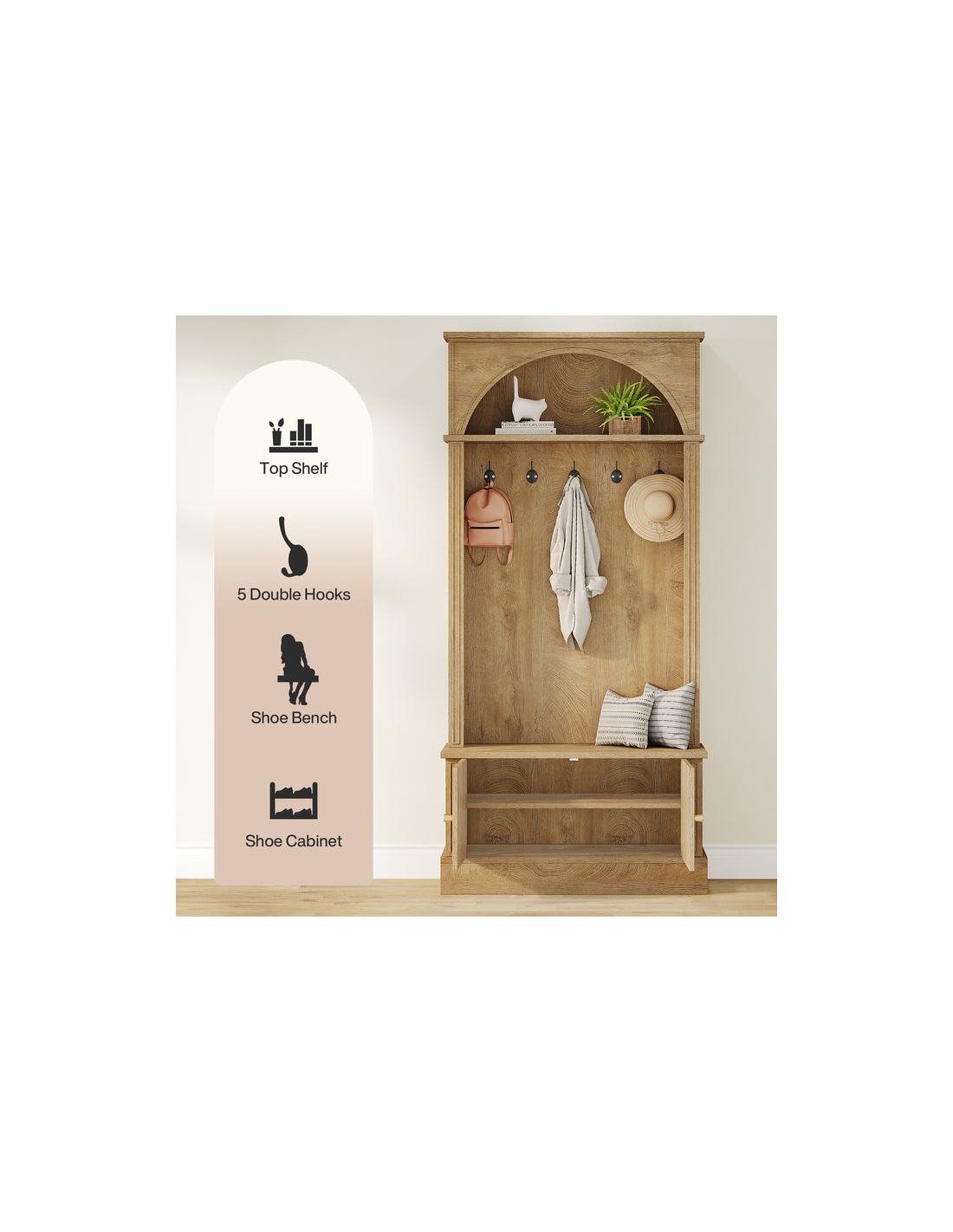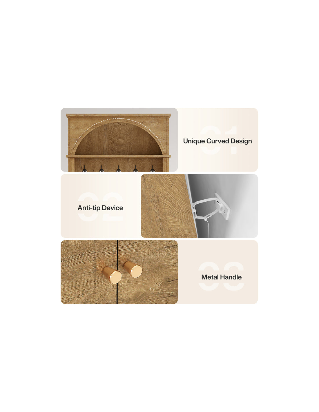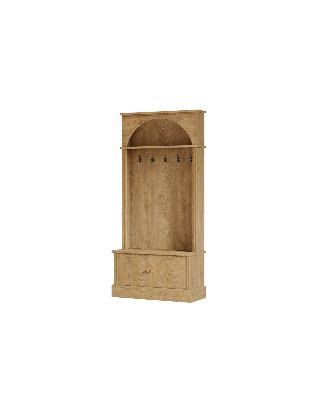 Garderobe udført i et design af naturfarvet møbelplade og kroge i sortlakeret metal. Garderoben indeholder dobbeltskab med i alt 1 højdejusterbar hylde bag. Garderoben måler 180 cm i højden og 83 x 35 cm i bredde og dybde.