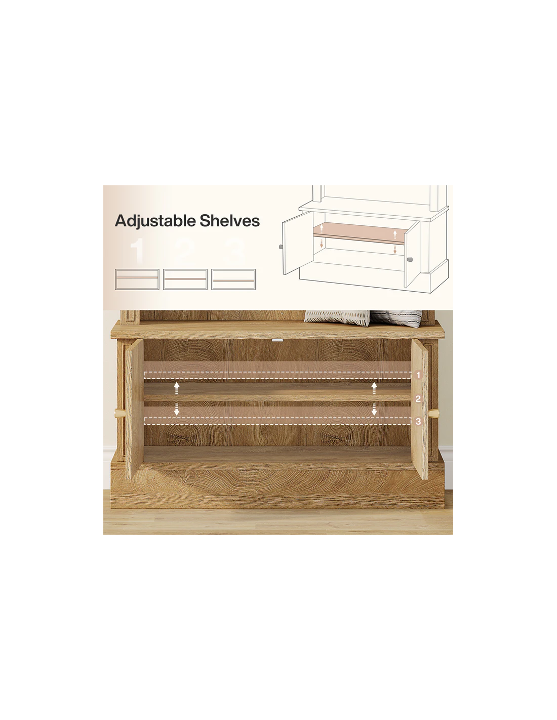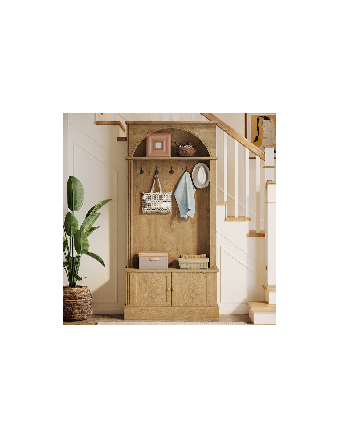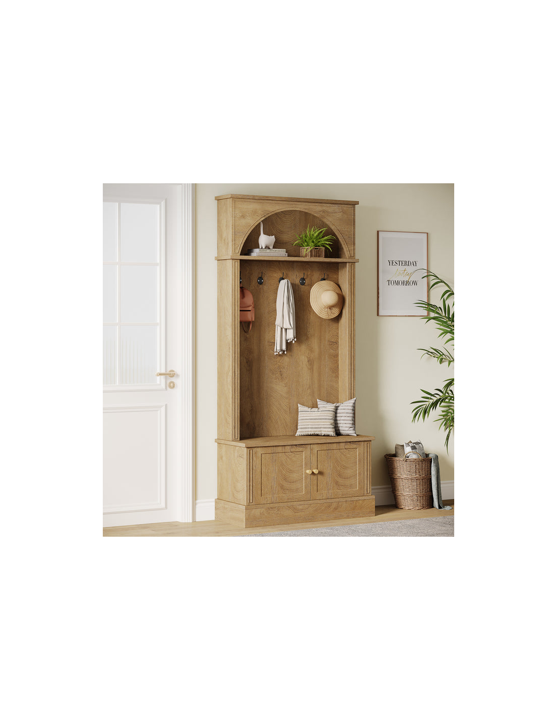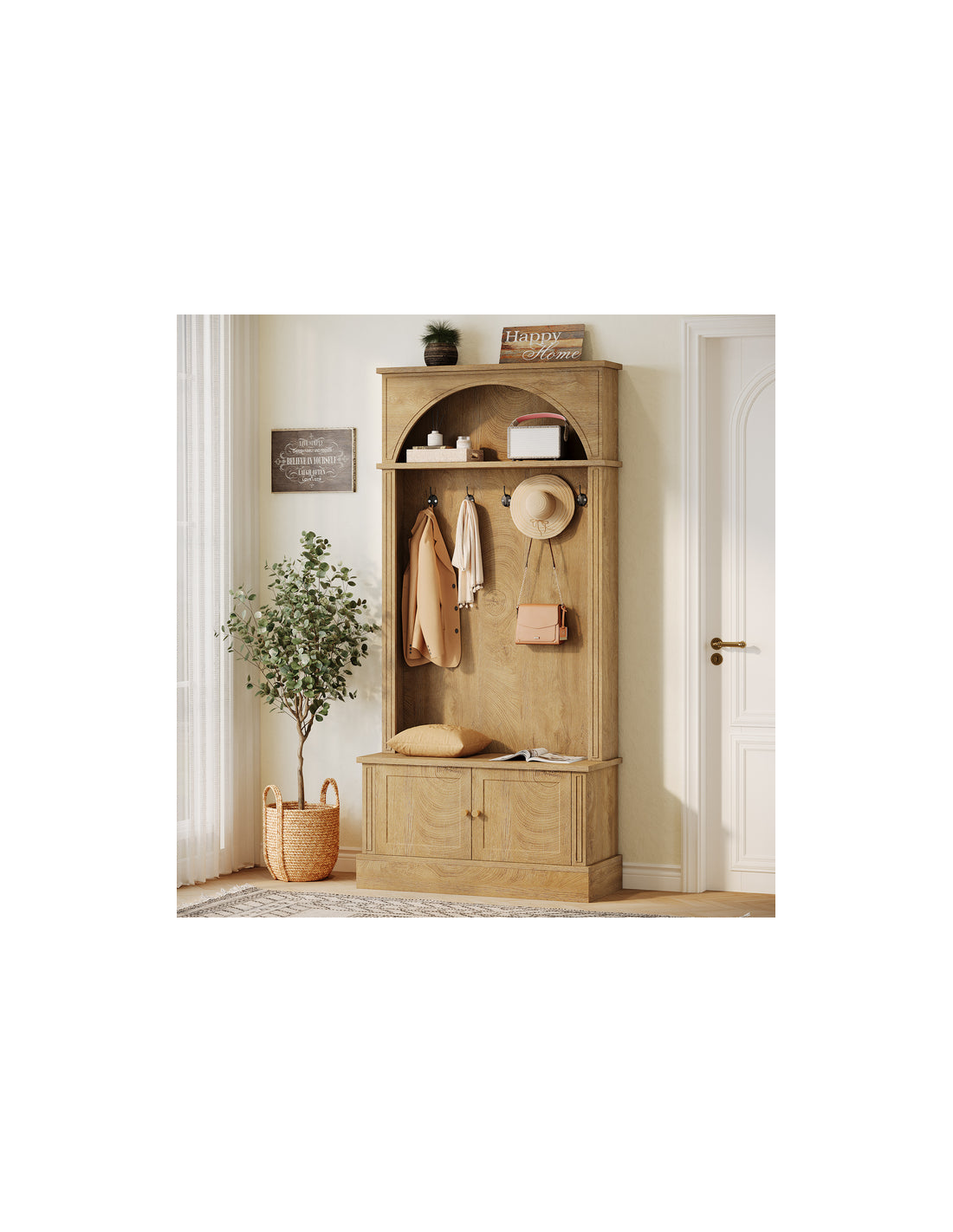 Garderobe udført i et design af naturfarvet møbelplade og kroge i sortlakeret metal. Garderoben indeholder dobbeltskab med i alt 1 højdejusterbar hylde bag. Garderoben måler 180 cm i højden og 83 x 35 cm i bredde og dybde.