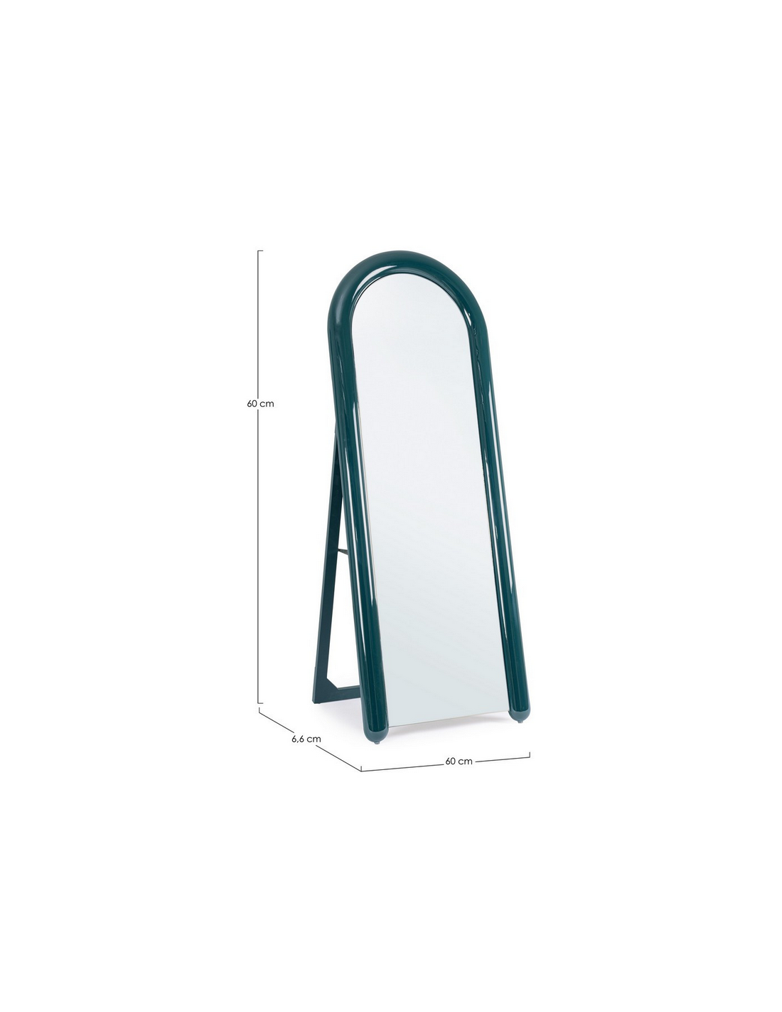Gulvspejl udført i et retropræget design af blank blågrøn lakeret MDF. Spejlet måler 160 cm i højden og 60 cm i bredden.