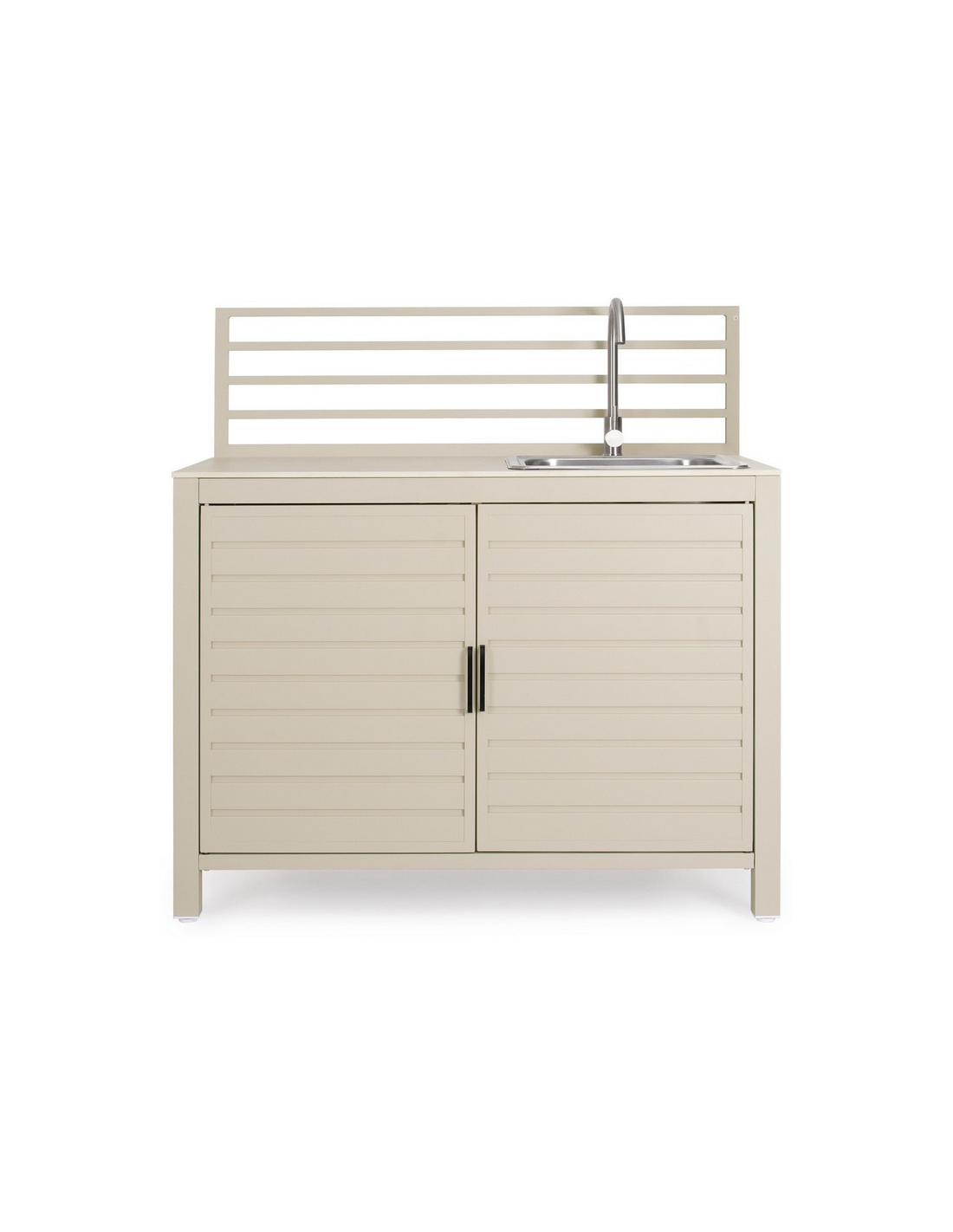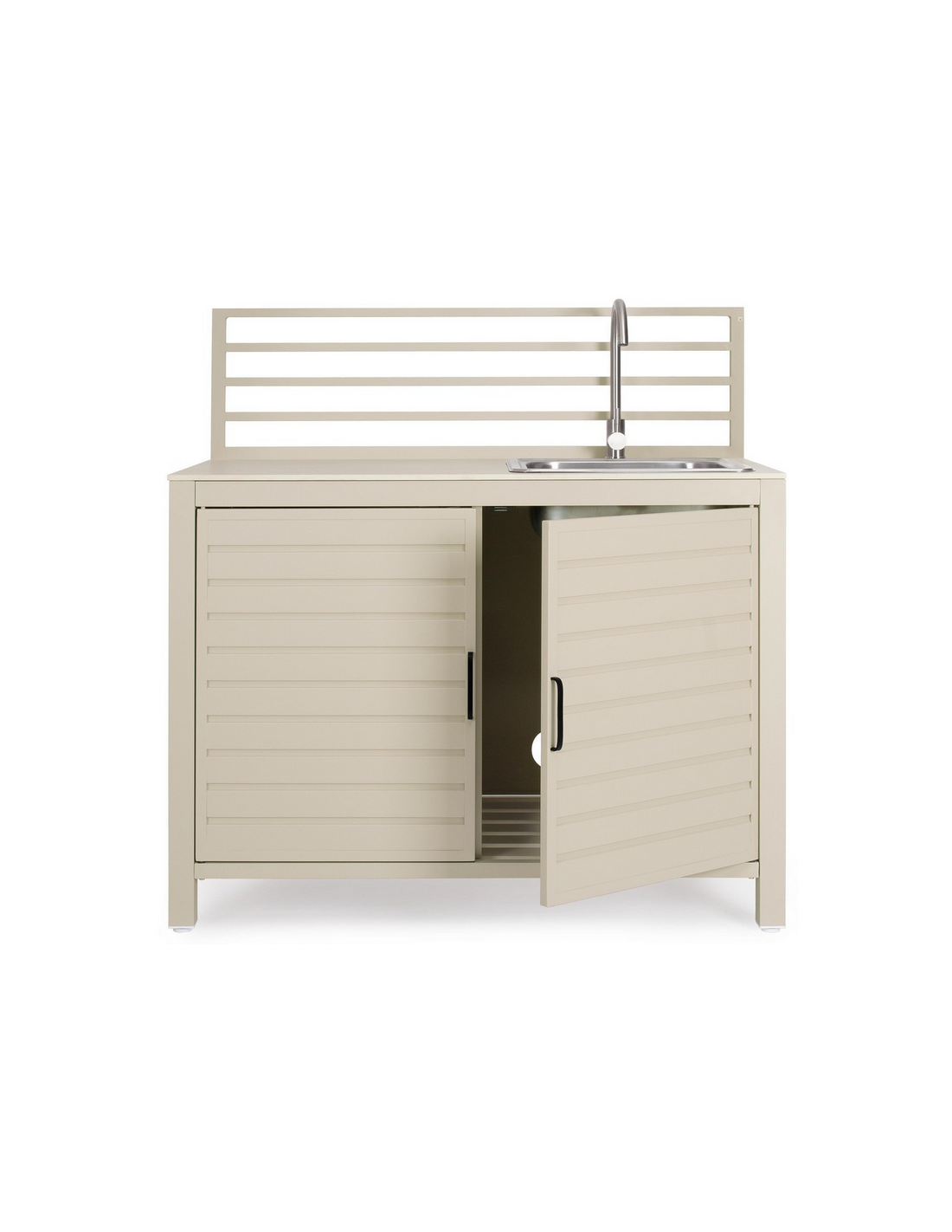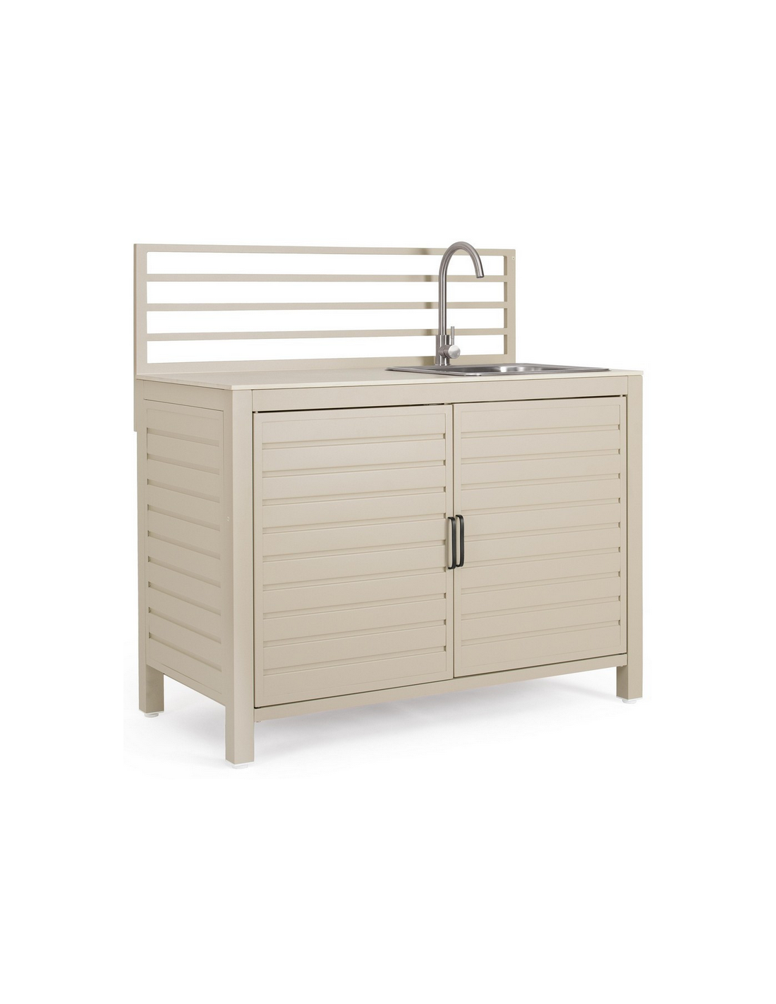 ARIA Udekøkken med vask og armatur, udført i et moderne design af sandfarvet pulverlakeret aluminium og med bordplade i travertin farvet keramisk sten. Håndvask og armatur er fremstillet i rustfri stål, og armaturet kan kobles sammen med både kold og varm vandtilførsel. Materialerne er vejrbestandige. Køkkenet har højdejusterbare fødder.