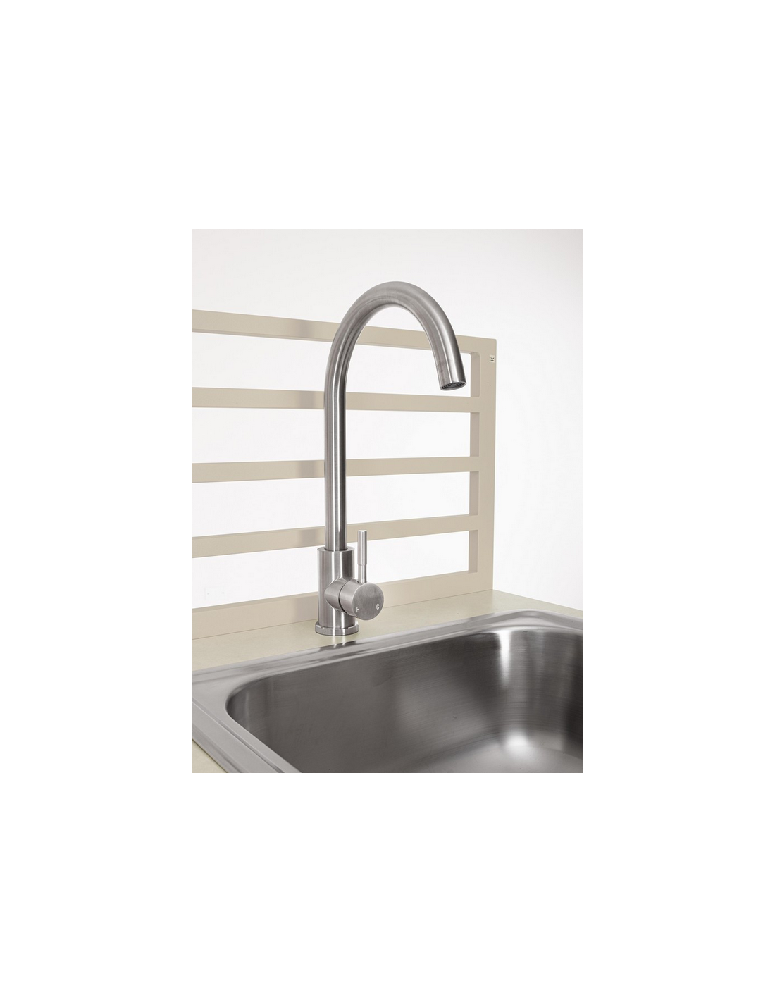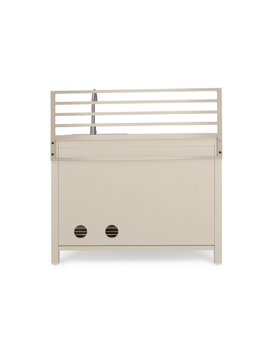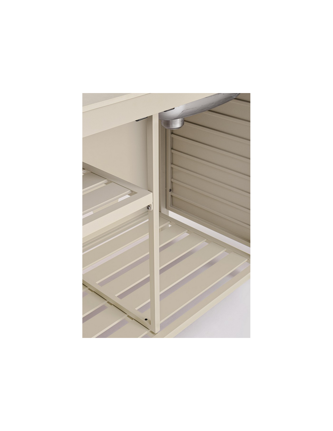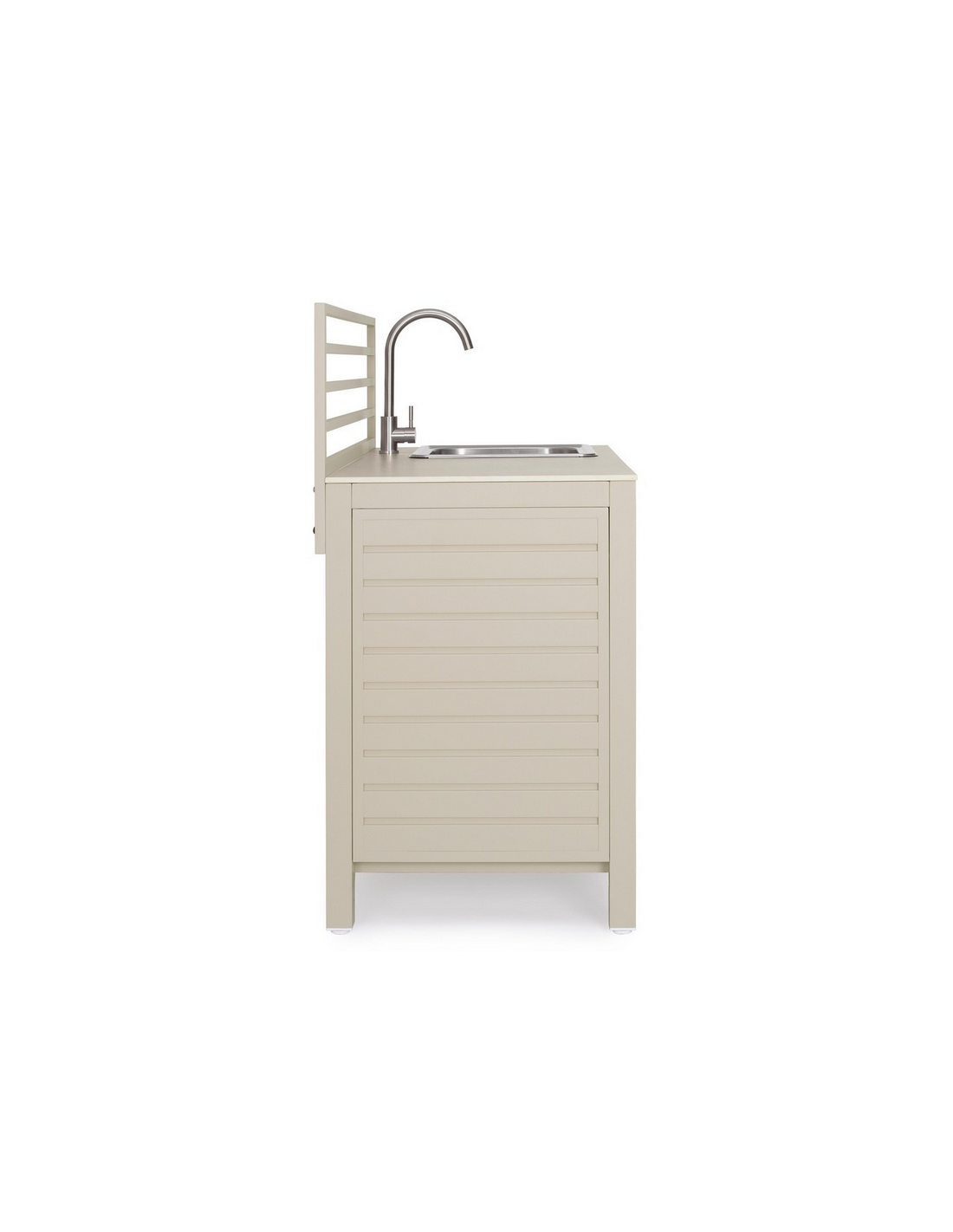 ARIA Udekøkken med vask og armatur, udført i et moderne design af sandfarvet pulverlakeret aluminium og med bordplade i travertin farvet keramisk sten. Håndvask og armatur er fremstillet i rustfri stål, og armaturet kan kobles sammen med både kold og varm vandtilførsel. Materialerne er vejrbestandige. Køkkenet har højdejusterbare fødder.