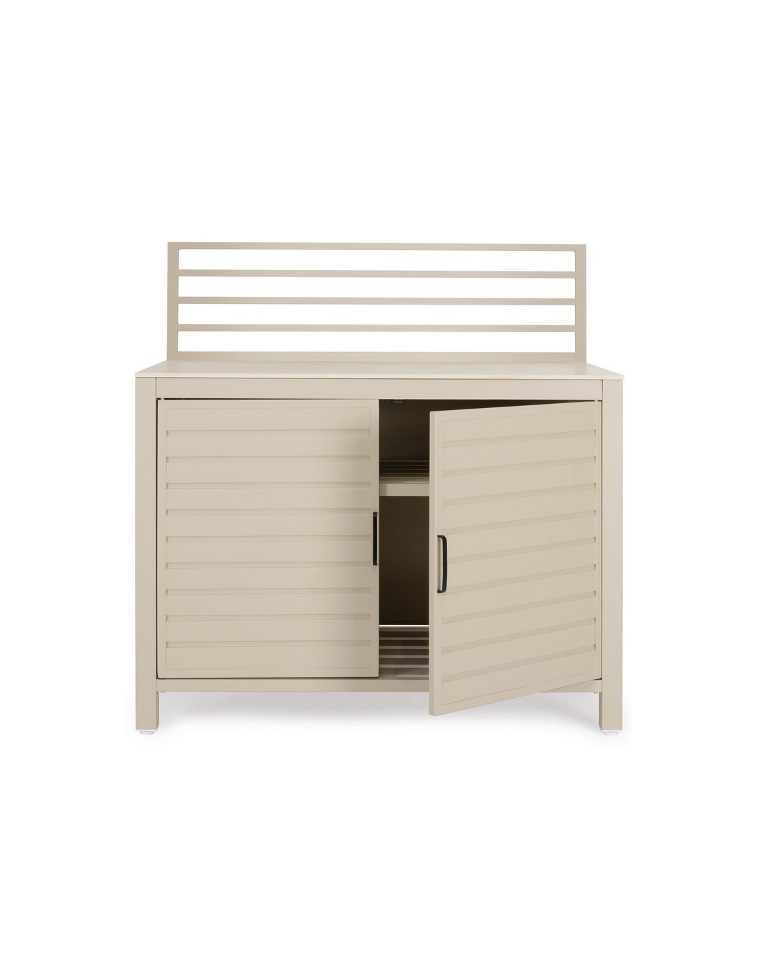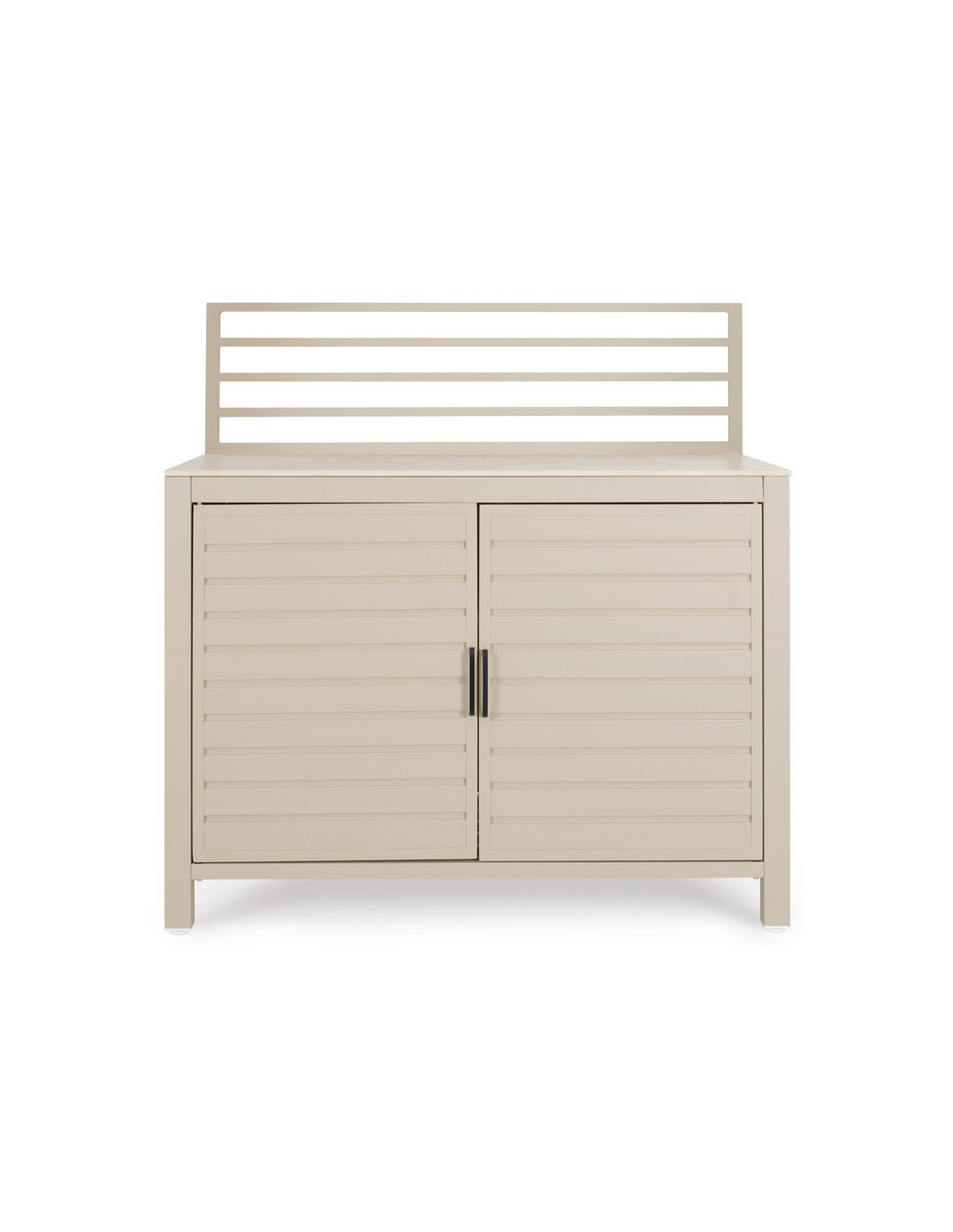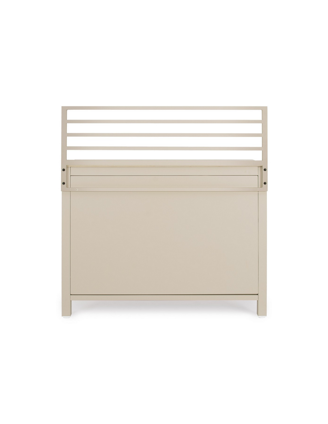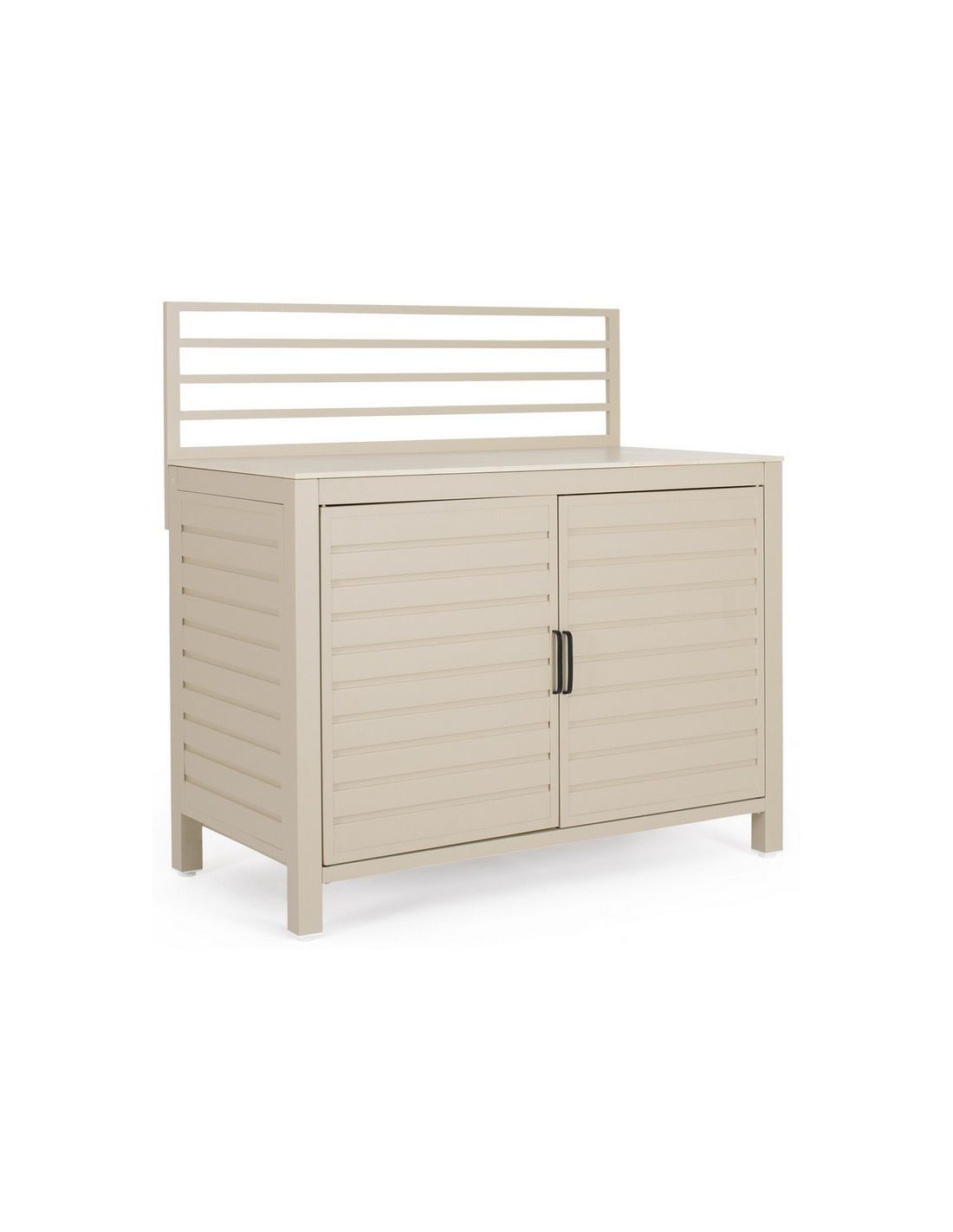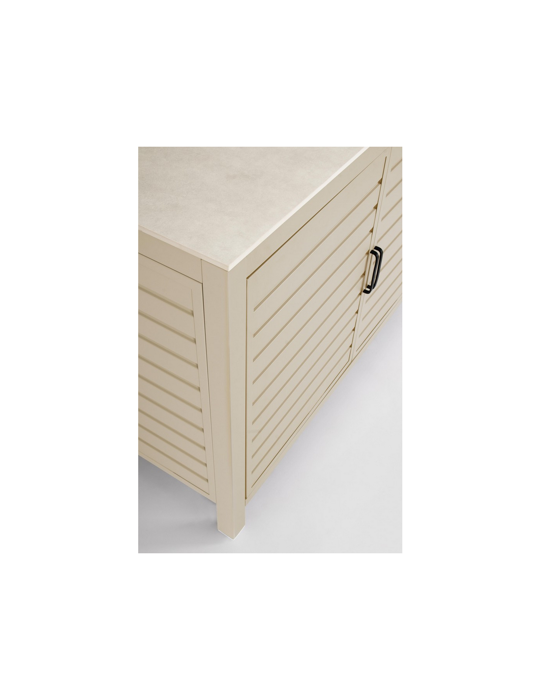 ARIA Udekøkken modul udført i et moderne design af sandfarvet pulverlakeret aluminium og med bordplade i travertin farvet keramisk sten. Materialerne er vejrbestandige. Køkkenet har højdejusterbare fødder. Køkkenet har en totalhøjde på 125 cm, med 78 cm fra jord til bordhøjde. Køkkenet er 120 x 62 cm i bredde og dybde.