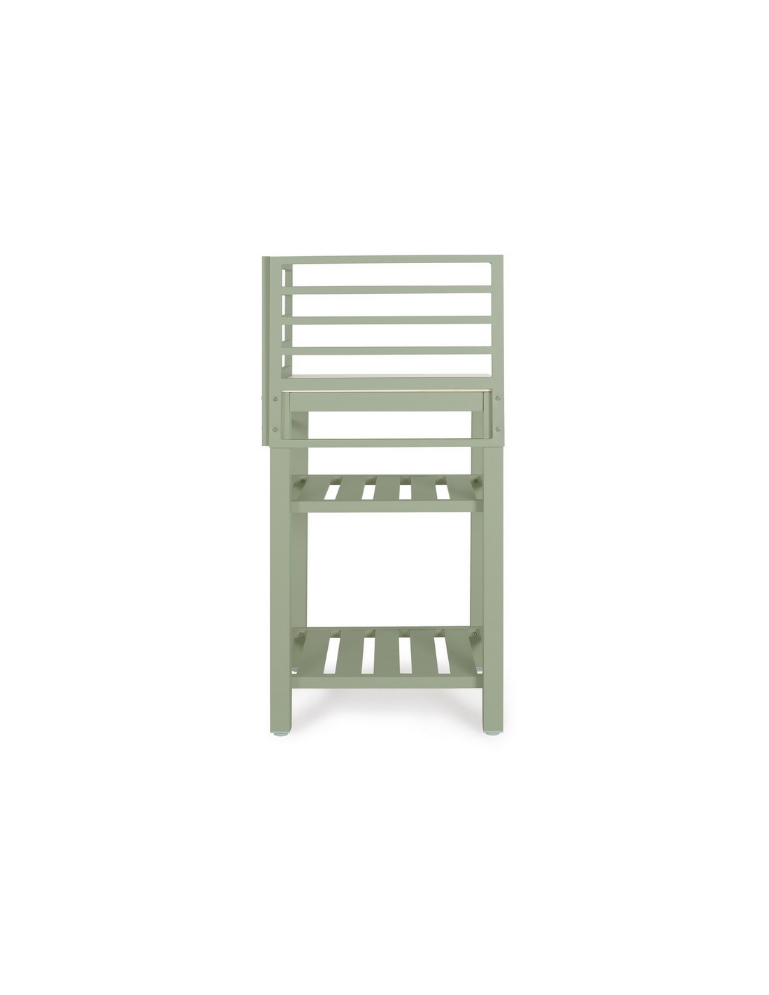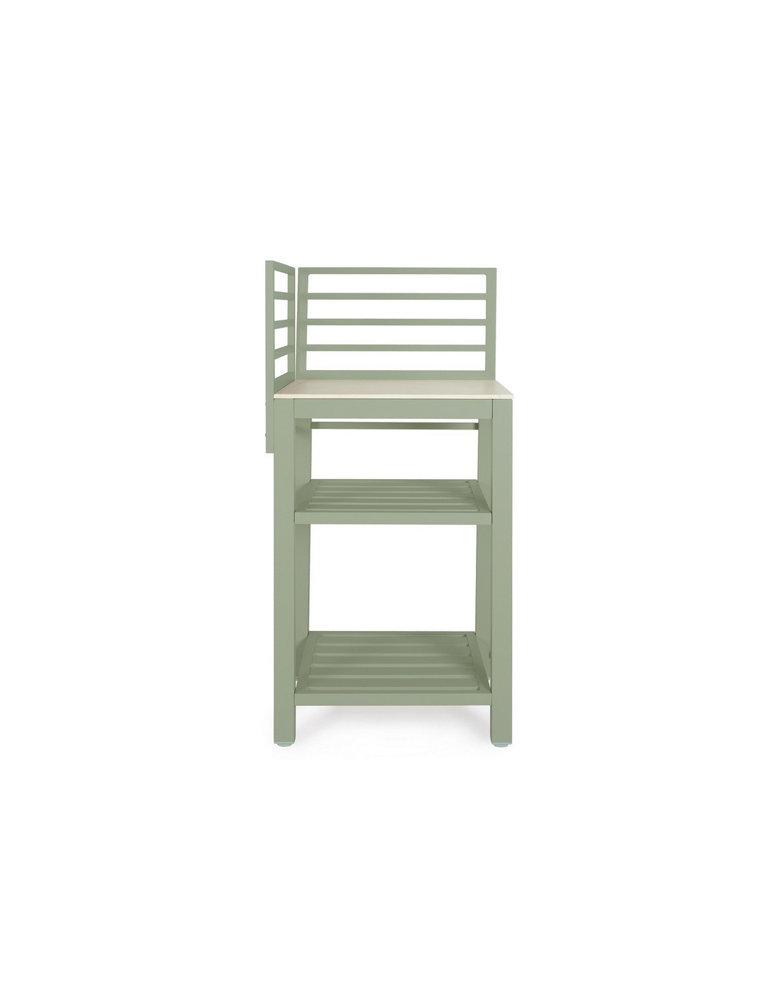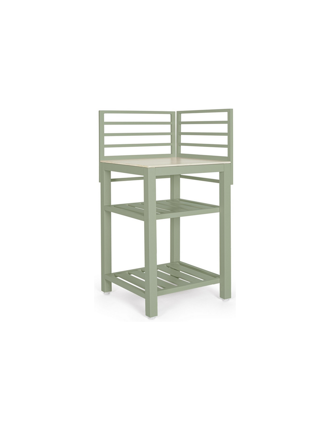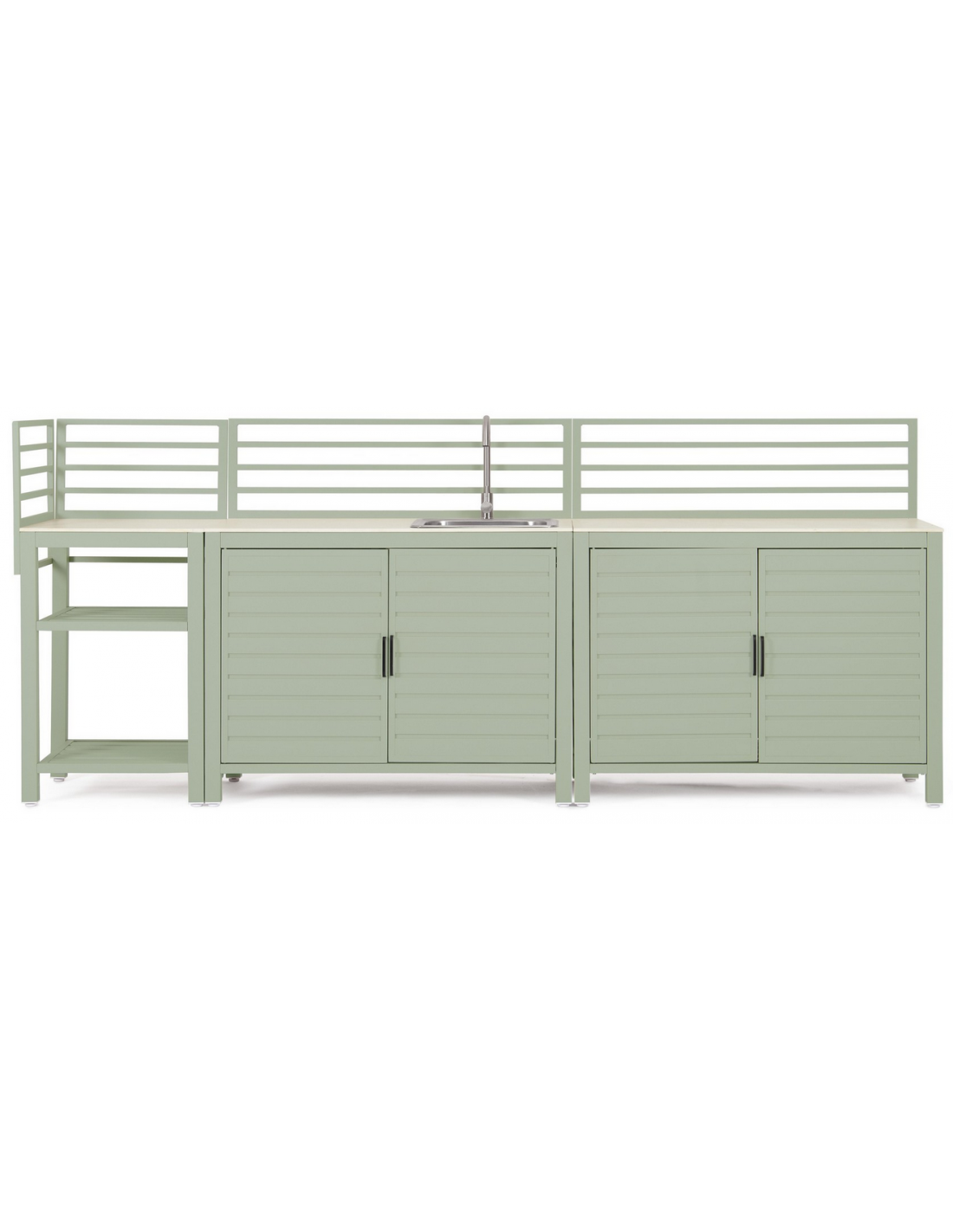 ARIA Udekøkken modul udført i et moderne design af antik grøn pulverlakeret aluminium og med bordplade i travertin farvet keramisk sten. Materialerne er vejrbestandige. Køkkenet har højdejusterbare fødder. Køkkenet har en totalhøjde på 125 cm, med 78 cm fra jord til bordhøjde. Køkkenet er 62 x 62 cm i bredde og dybde.