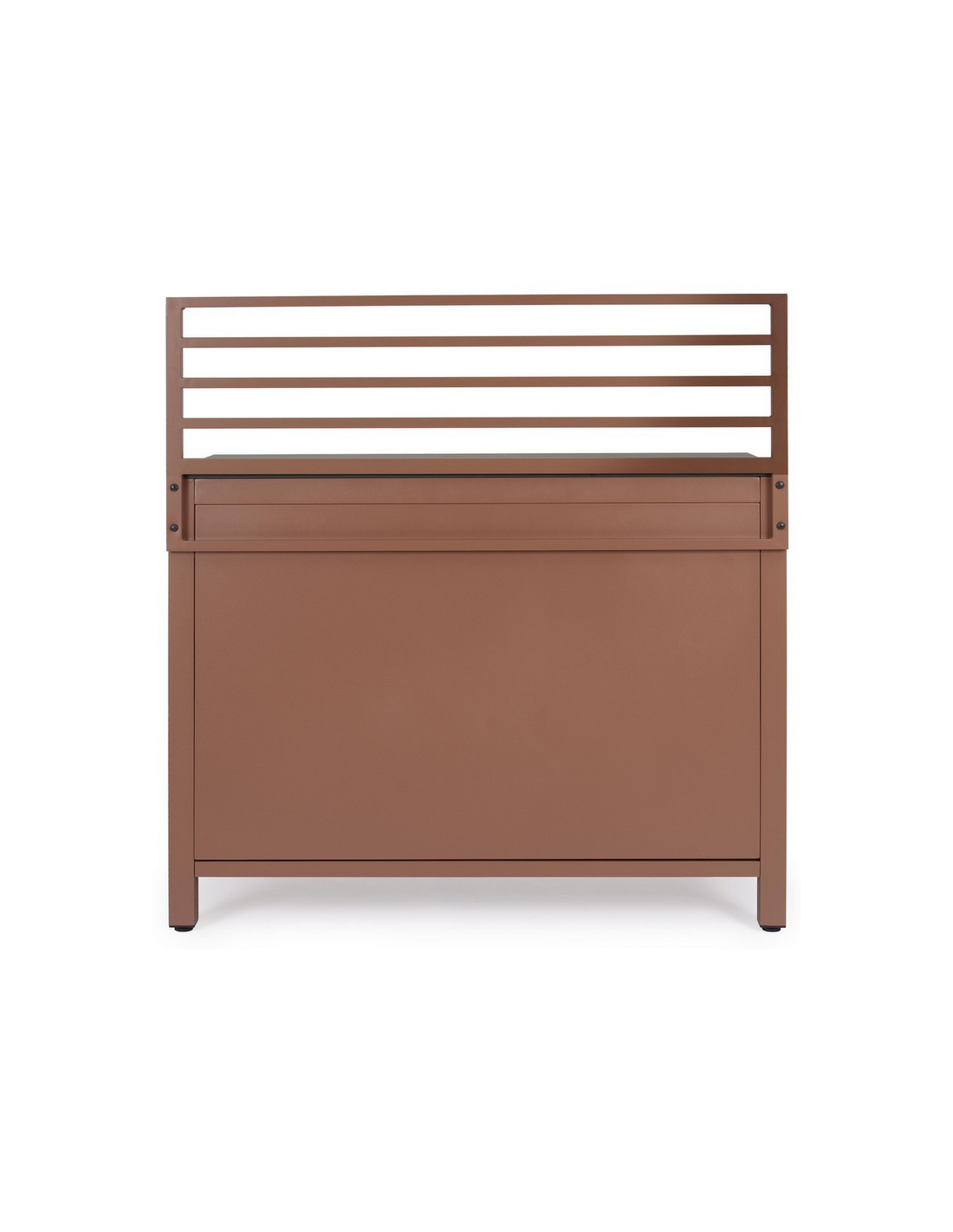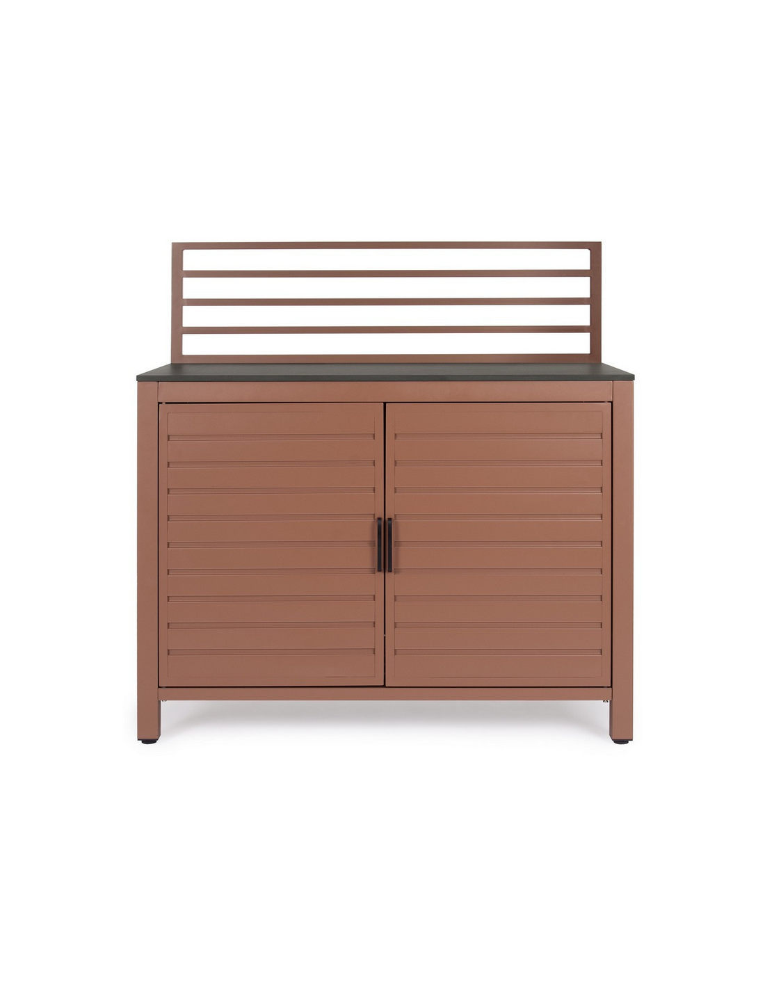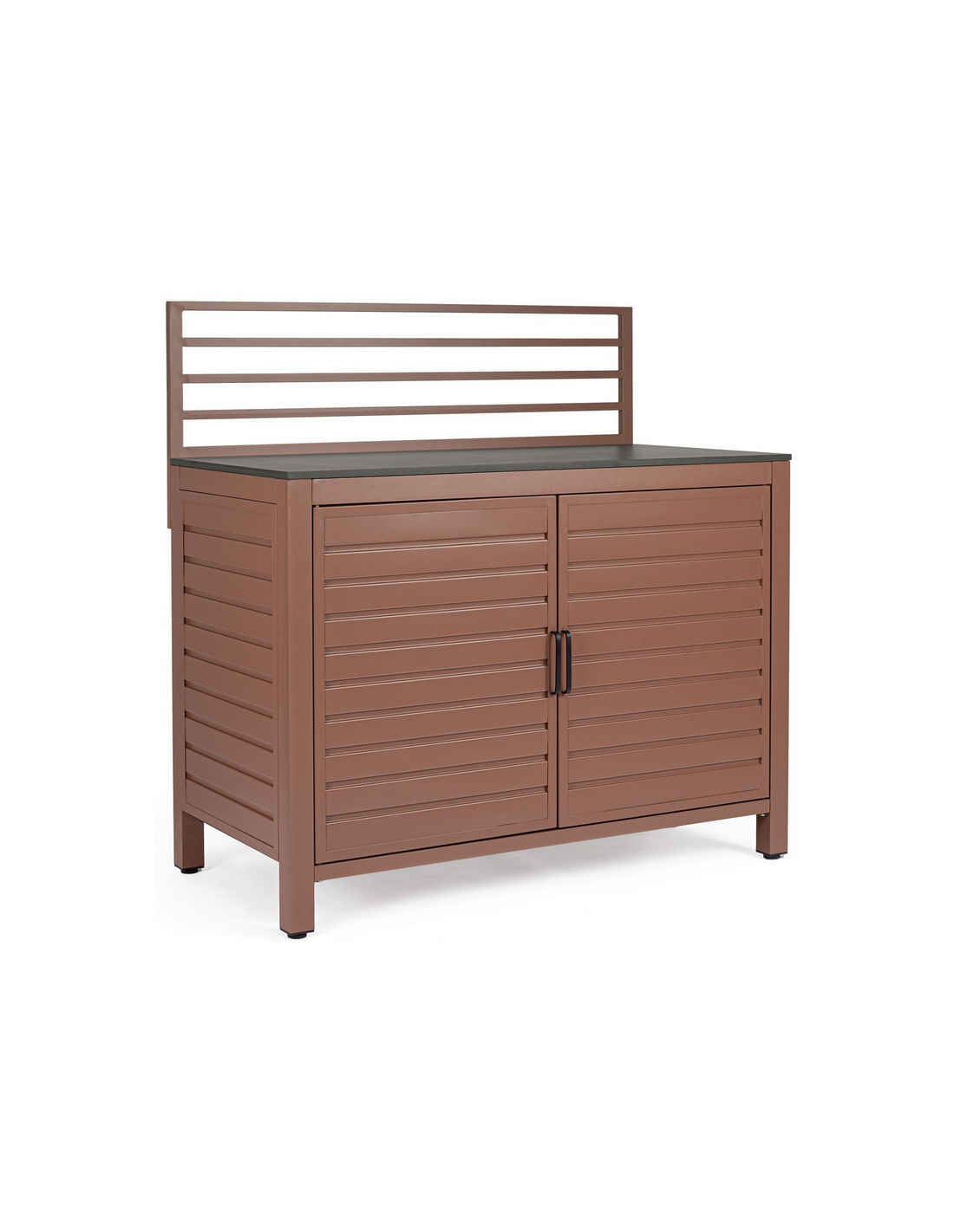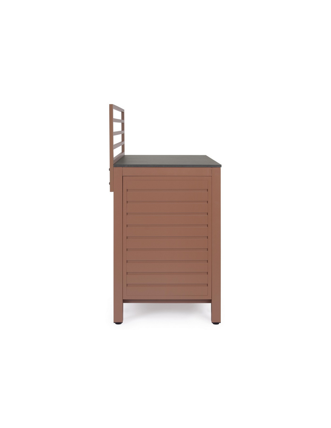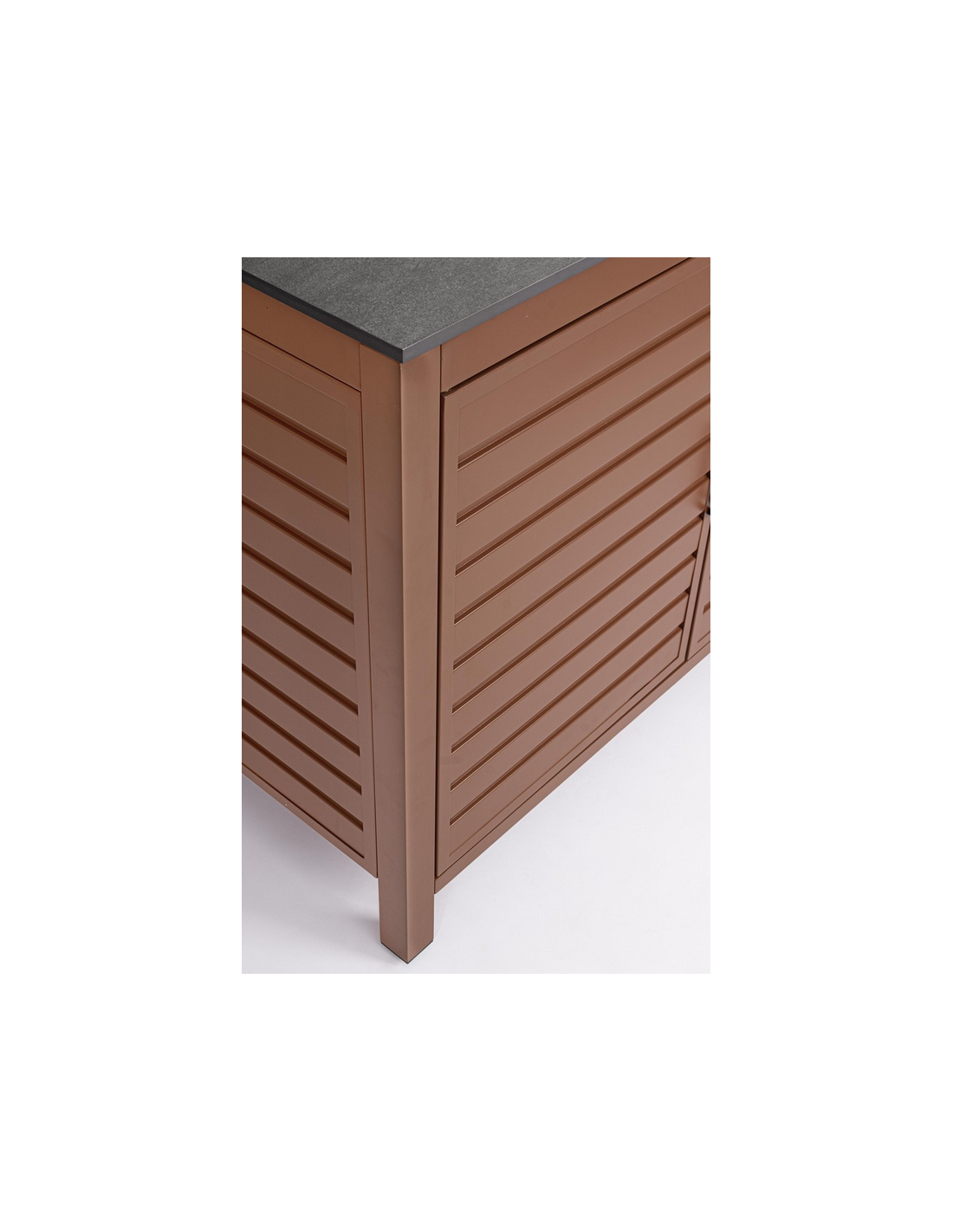 ARIA Udekøkken modul udført i et moderne design af terracotta farvet pulverlakeret aluminium og med bordplade i stengrå keramisk sten. Materialerne er vejrbestandige. Køkkenet har højdejusterbare fødder. Køkkenet har en totalhøjde på 125 cm, med 78 cm fra jord til bordhøjde. Køkkenet er 120 x 62 cm i bredde og dybde.