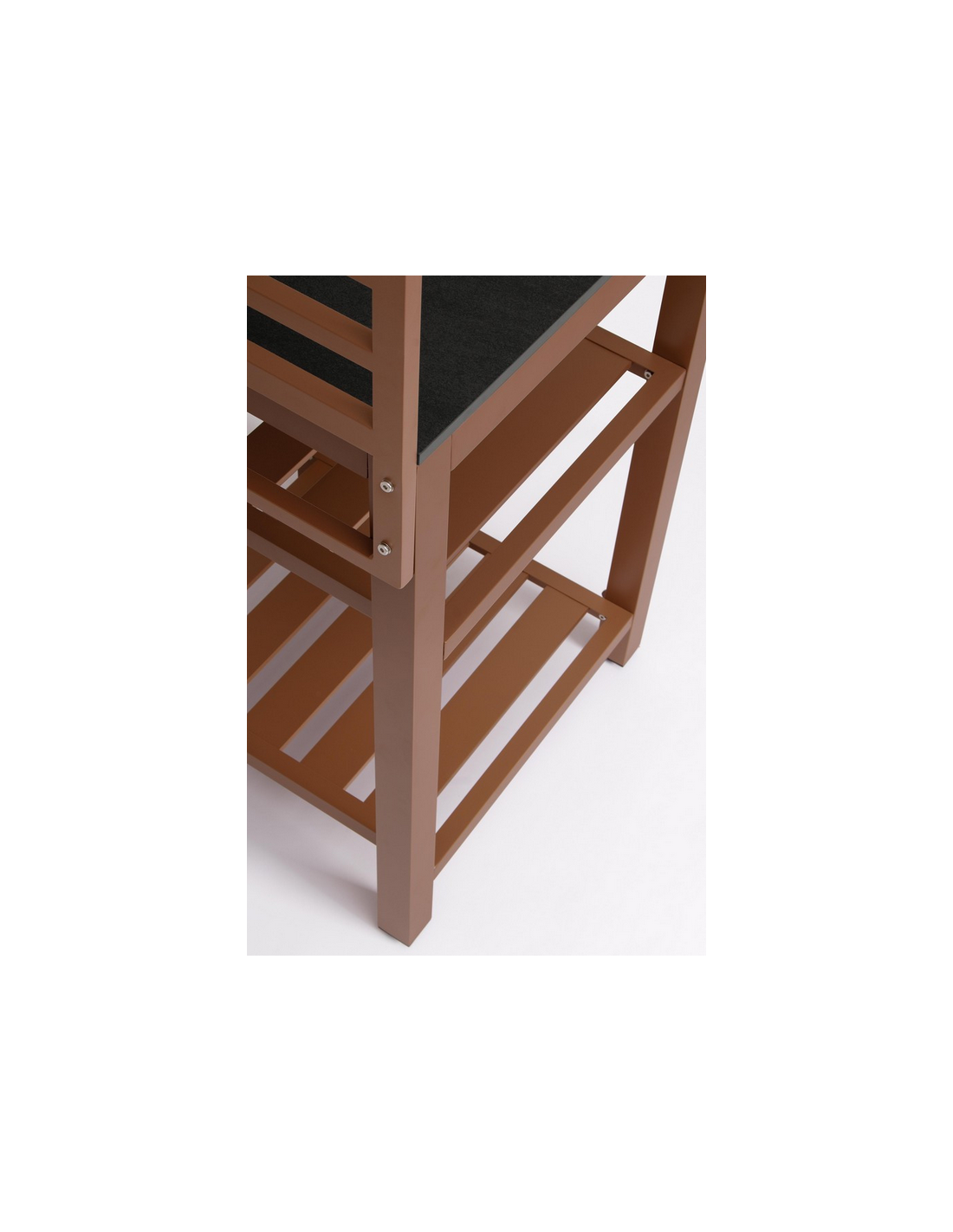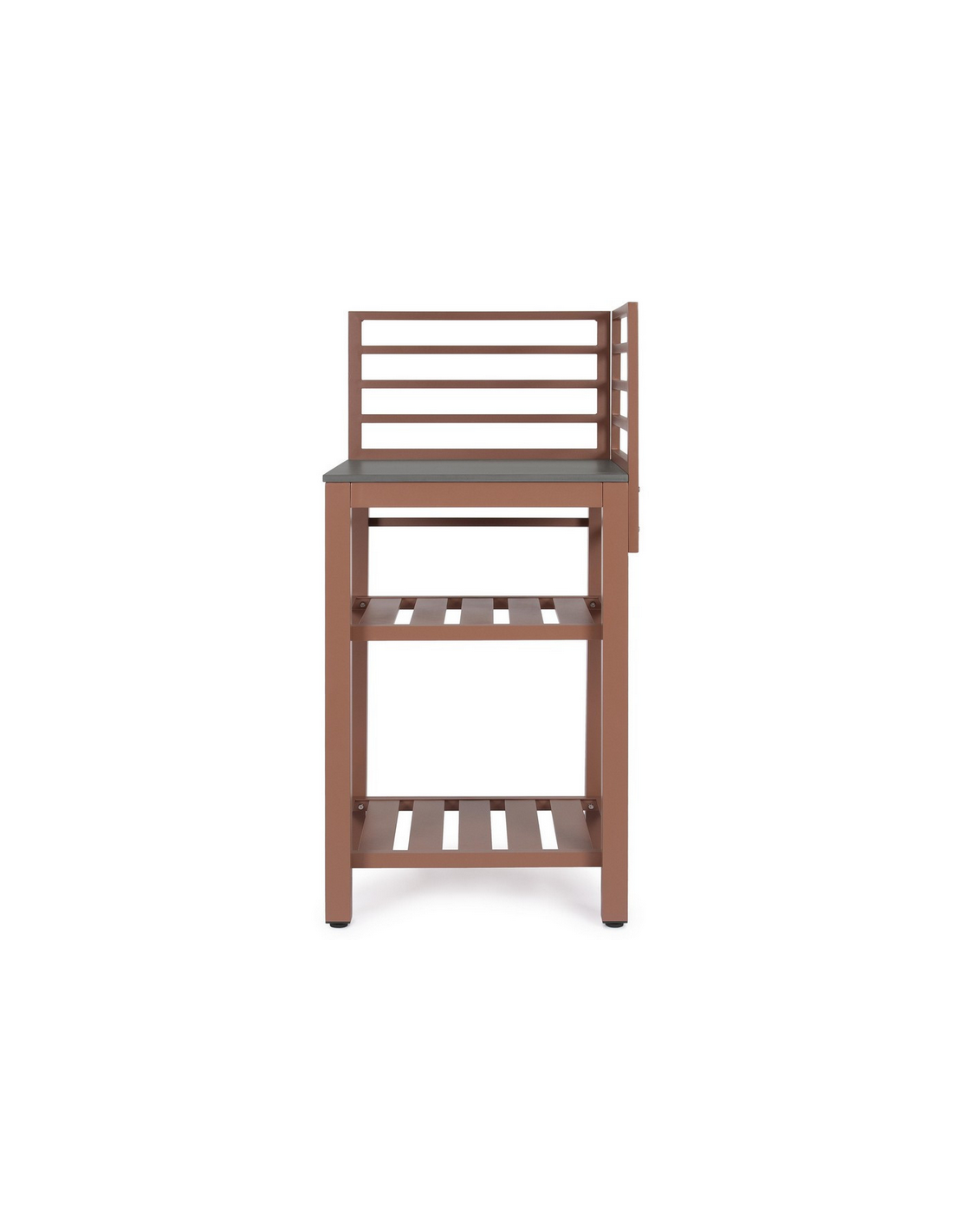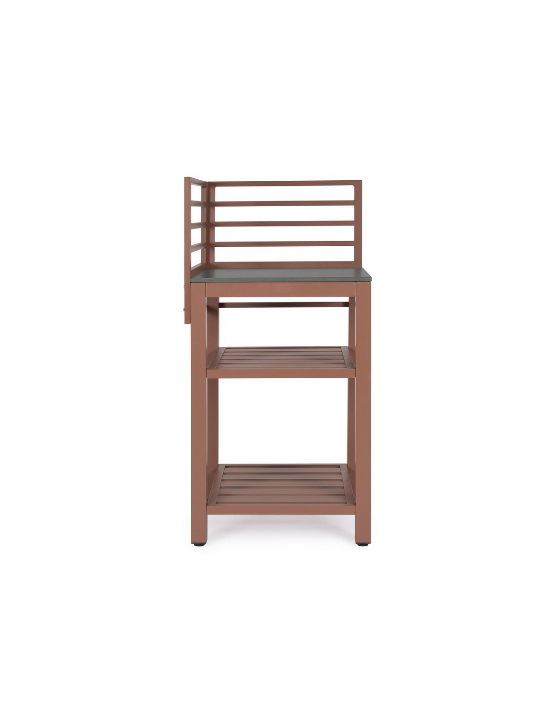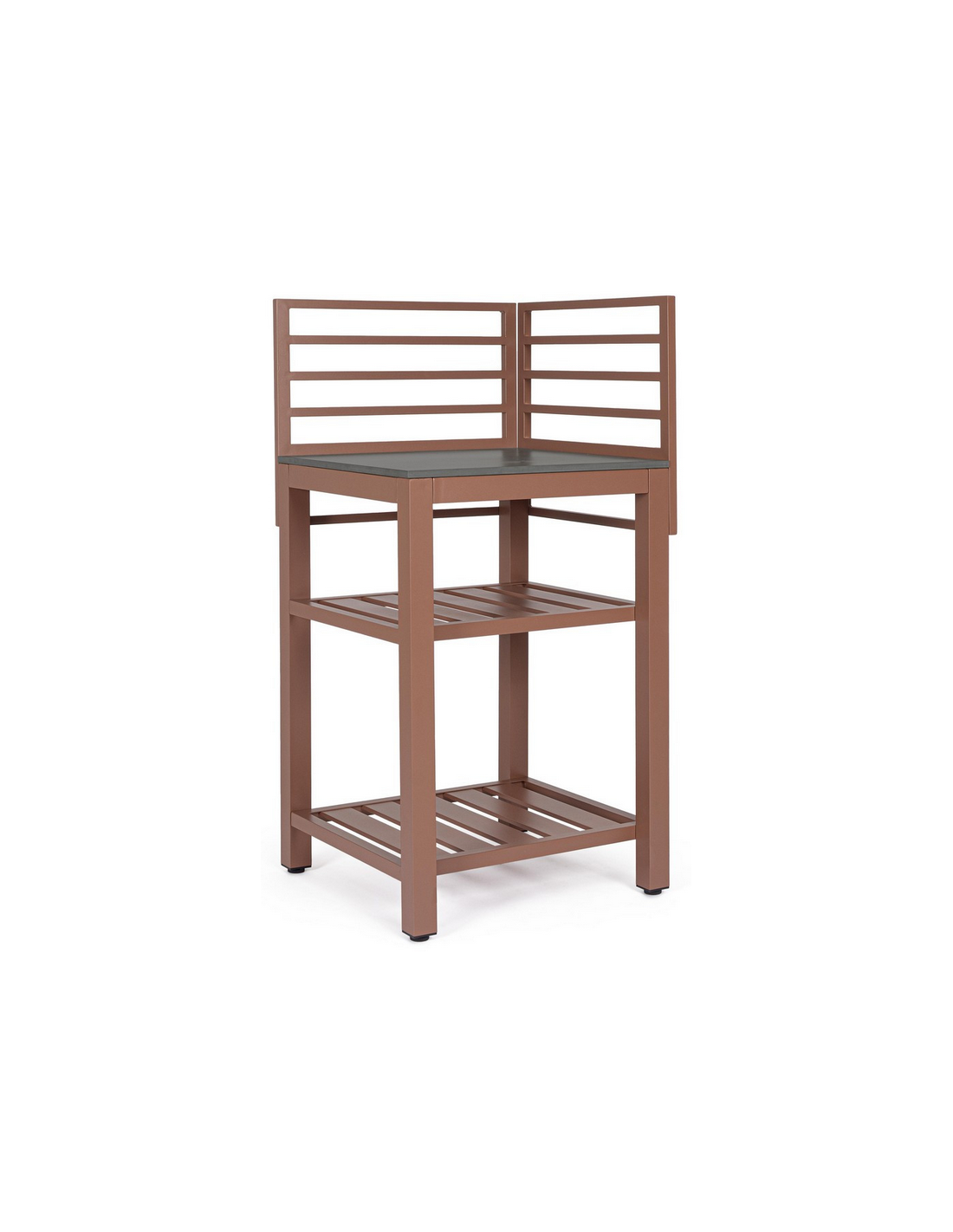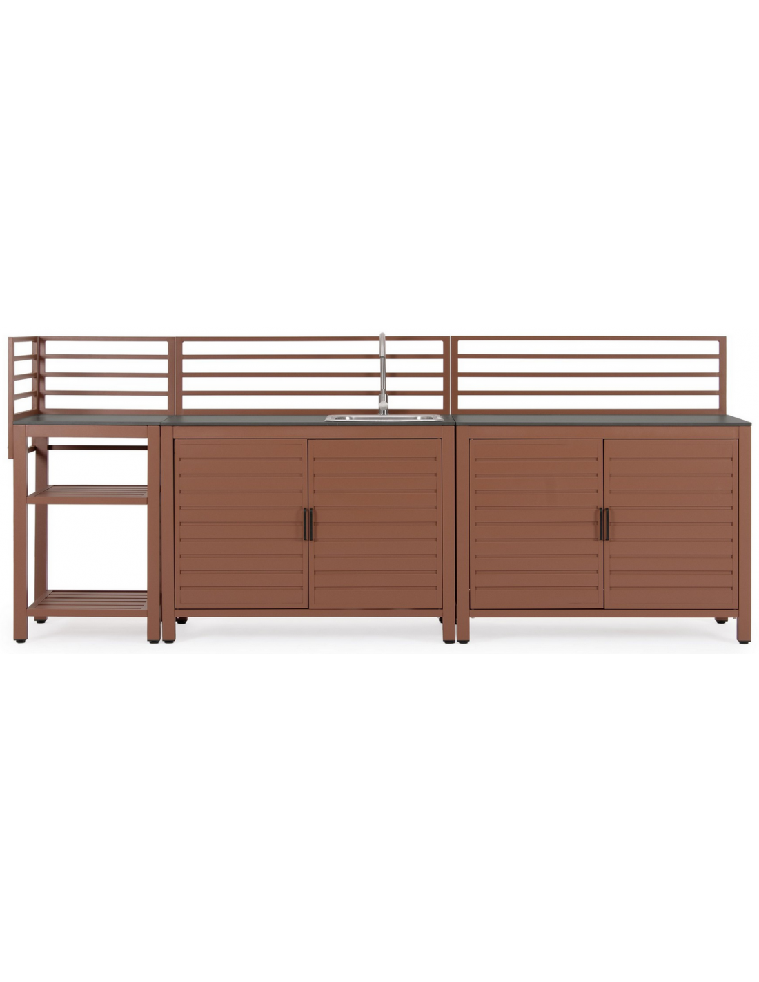 ARIA Udekøkken modul udført i et moderne design af terracotta farvet pulverlakeret aluminium og med bordplade i stengrå keramisk sten. Materialerne er vejrbestandige. Køkkenet har højdejusterbare fødder. Køkkenet har en totalhøjde på 125 cm, med 78 cm fra jord til bordhøjde. Køkkenet er 62 x 62 cm i bredde og dybde.