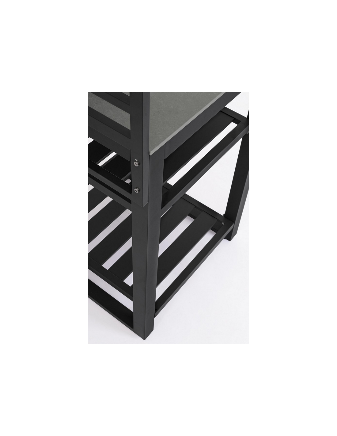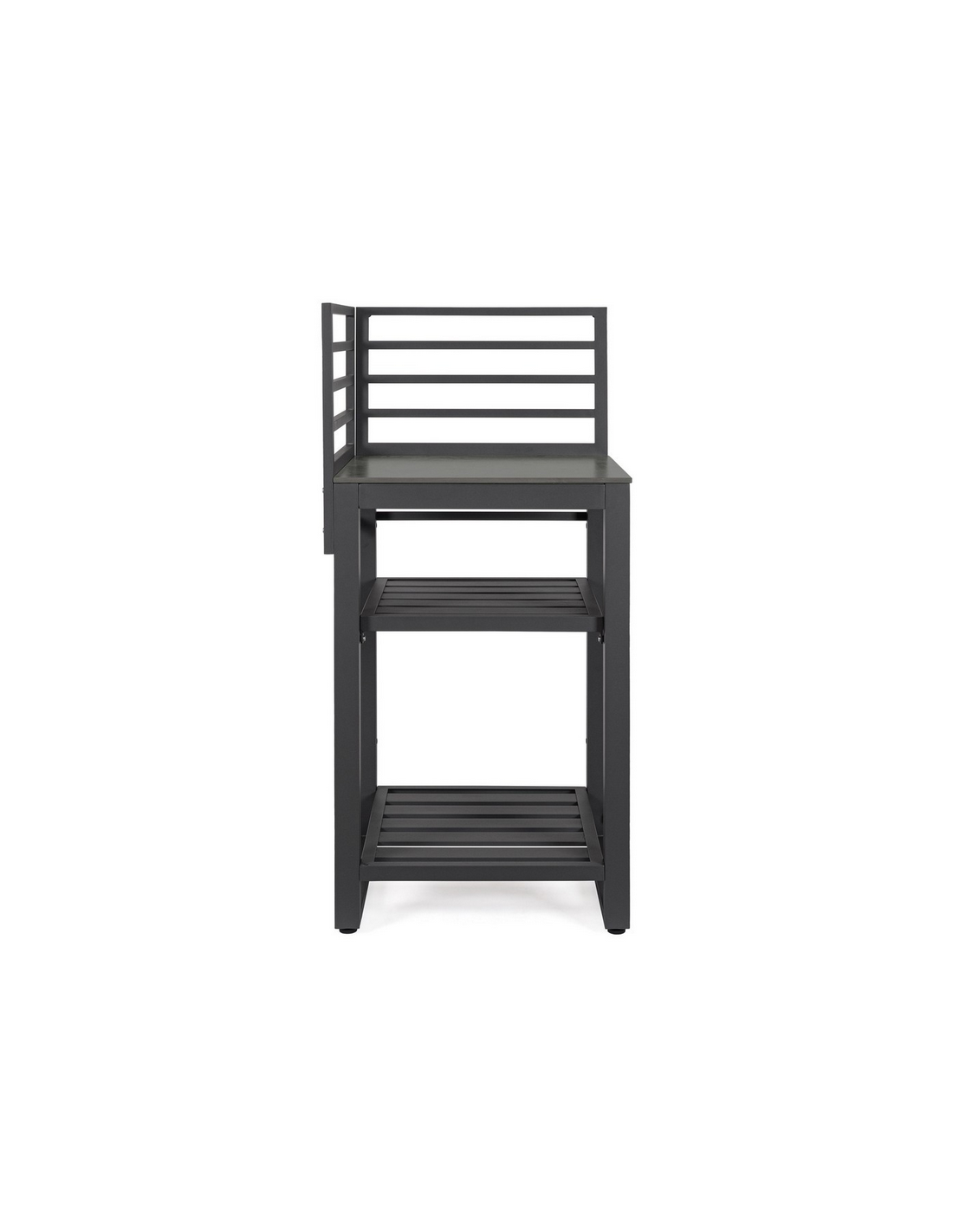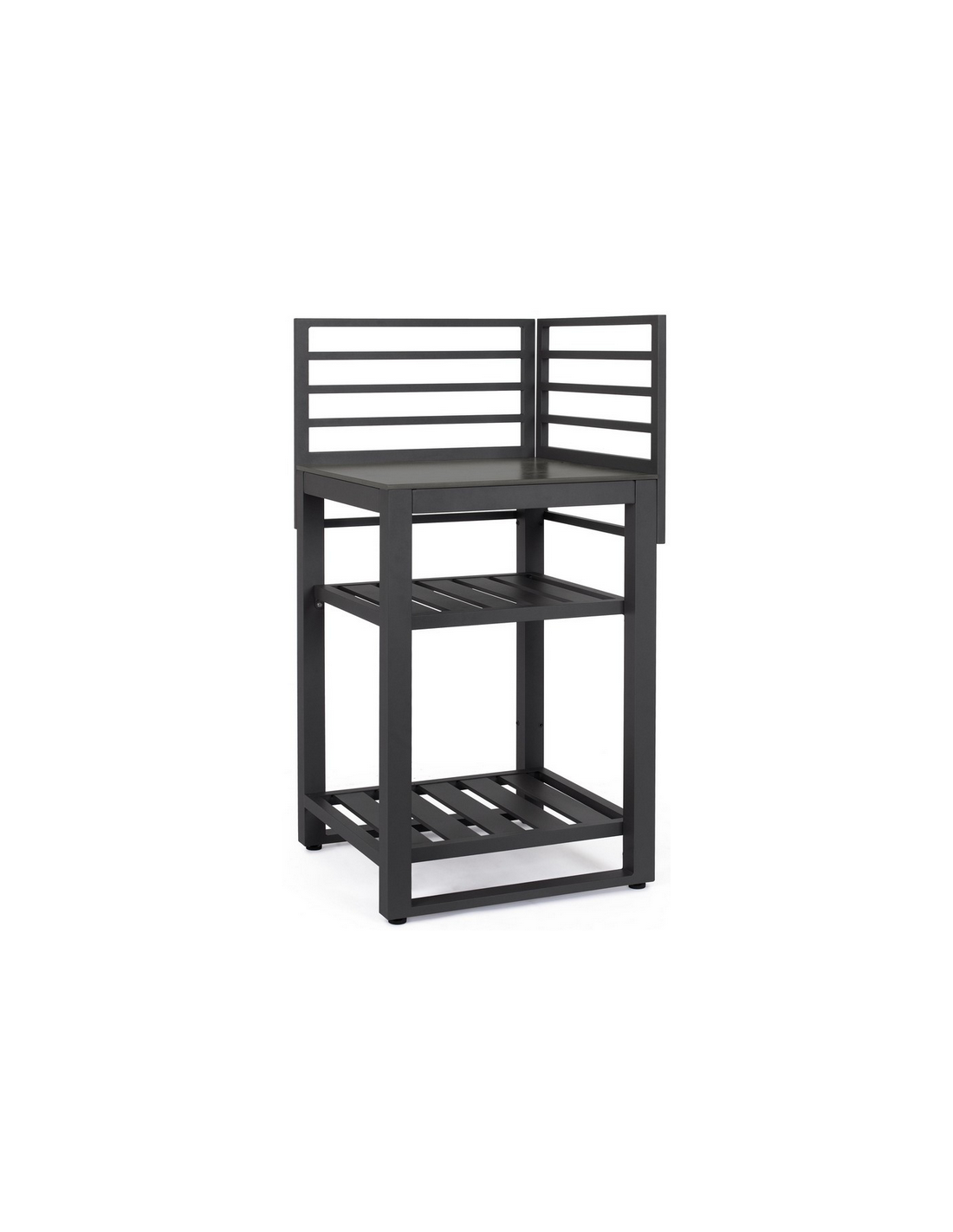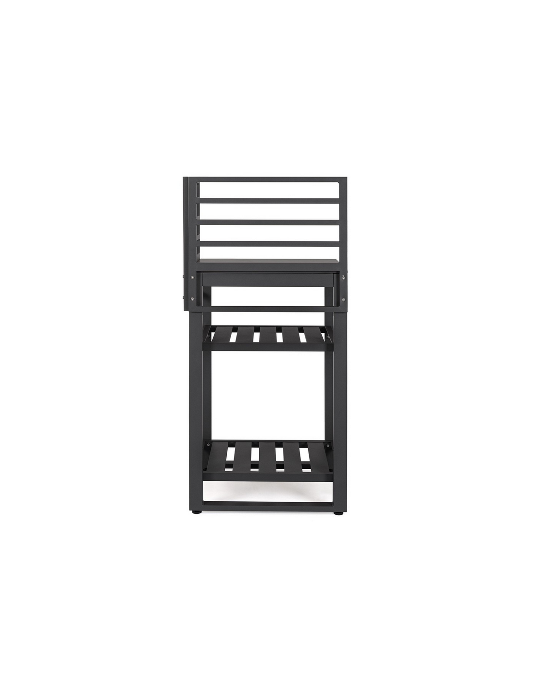 ANIA Udekøkken modul udført i et moderne design af charcoal farvet pulverlakeret aluminium og med bordplade i grå marmoriseret keramisk sten. Materialerne er vejrbestandige. Køkkenet har højdejusterbare fødder. Køkkenet har en totalhøjde på 125 cm, med 78 cm fra jord til bordhøjde. Køkkenet er 62 x 62 cm i bredde og dybde.