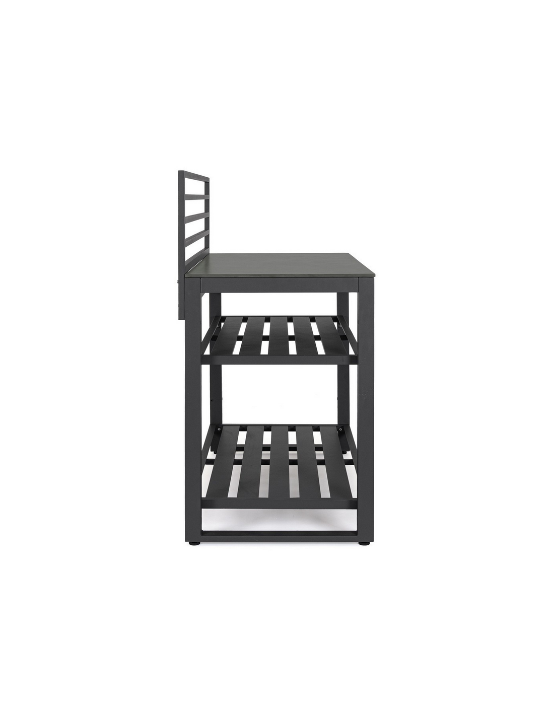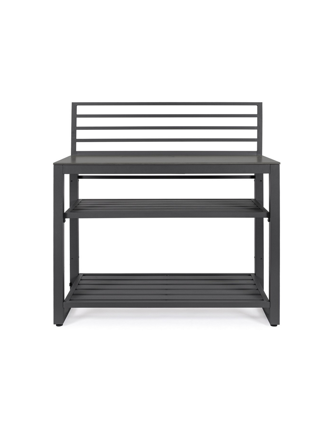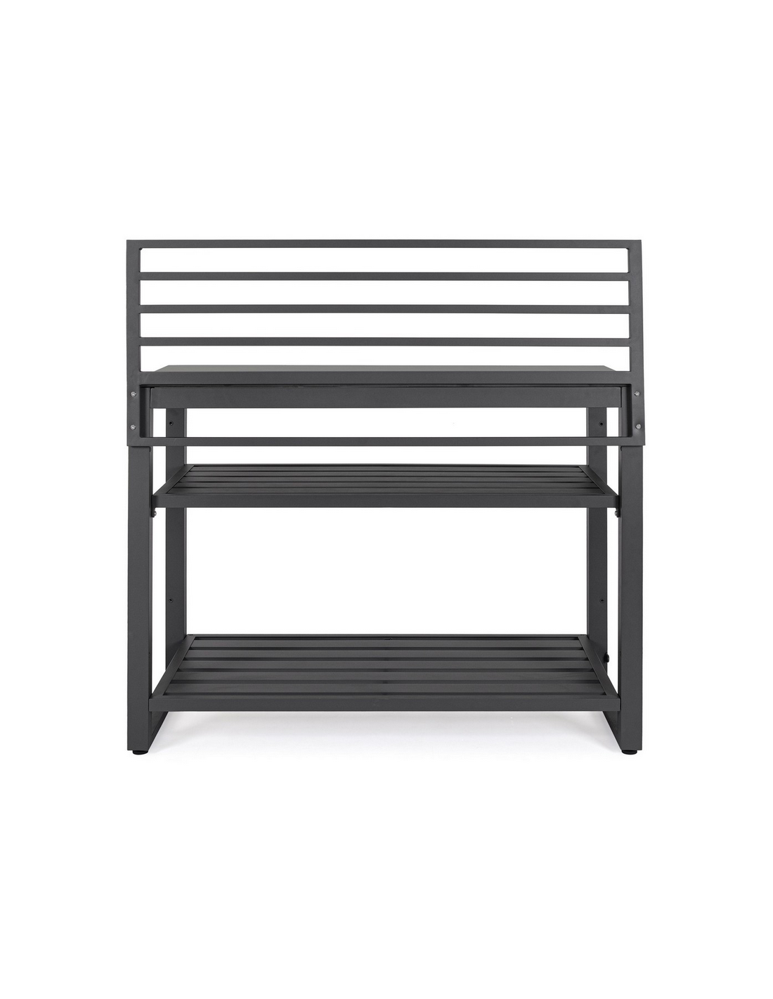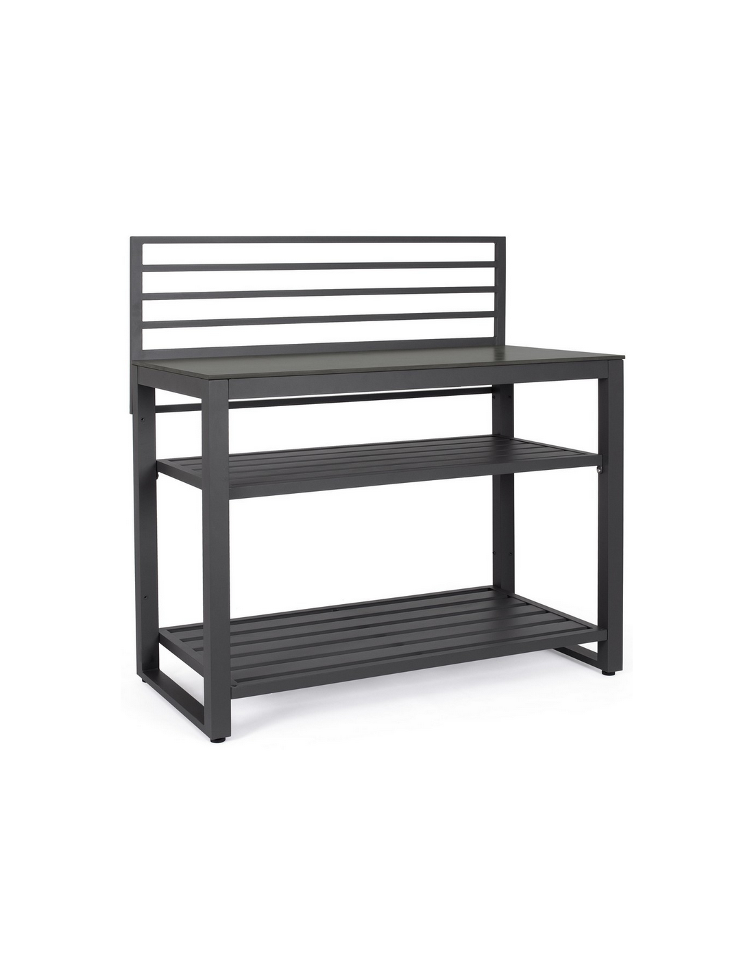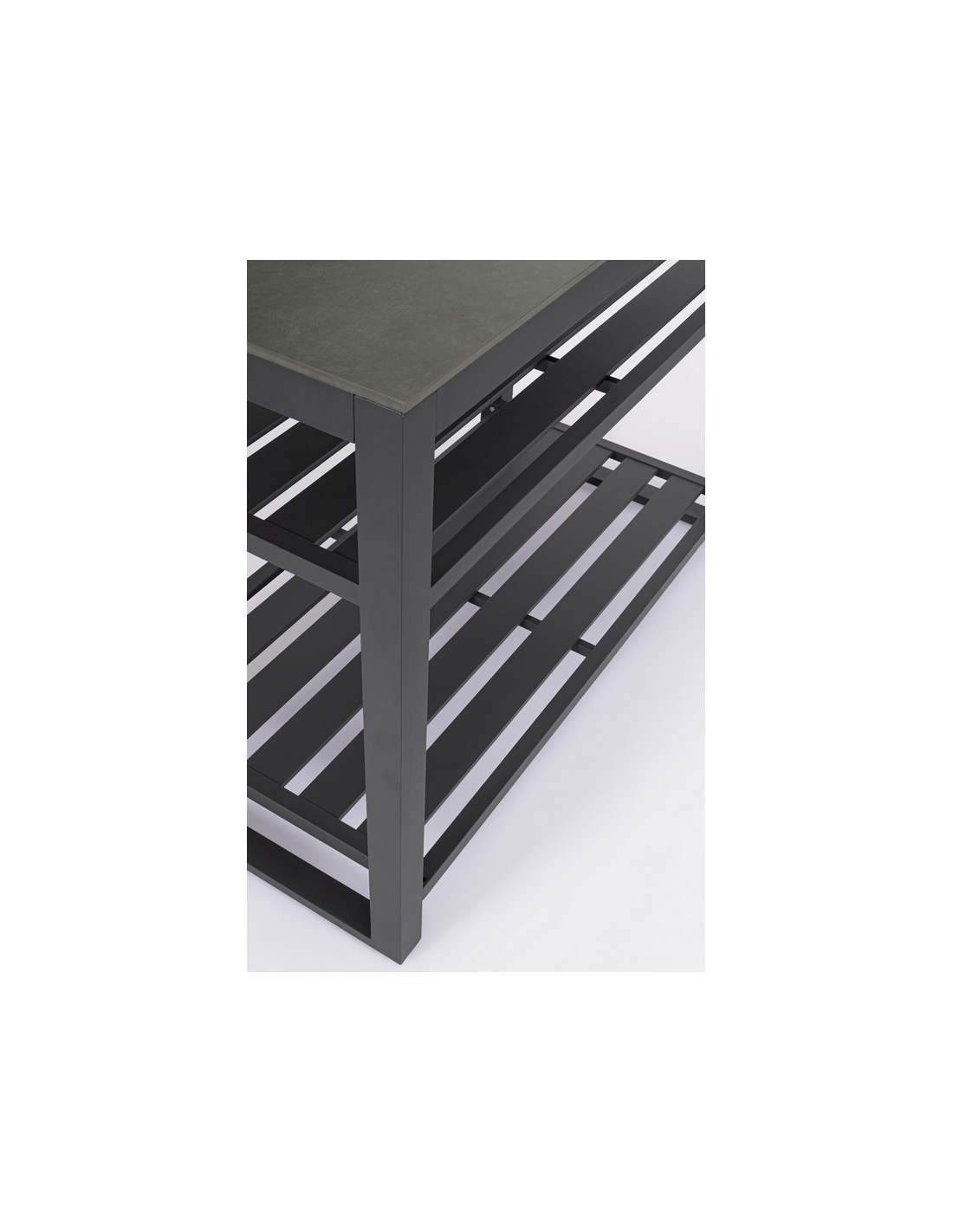 ANIA Udekøkken modul udført i et moderne design af charcoal farvet pulverlakeret aluminium og med bordplade i grå marmoriseret keramisk sten. Materialerne er vejrbestandige. Køkkenet har højdejusterbare fødder. Køkkenet har en totalhøjde på 125 cm, med 78 cm fra jord til bordhøjde. Køkkenet er 120 x 62 cm i bredde og dybde.