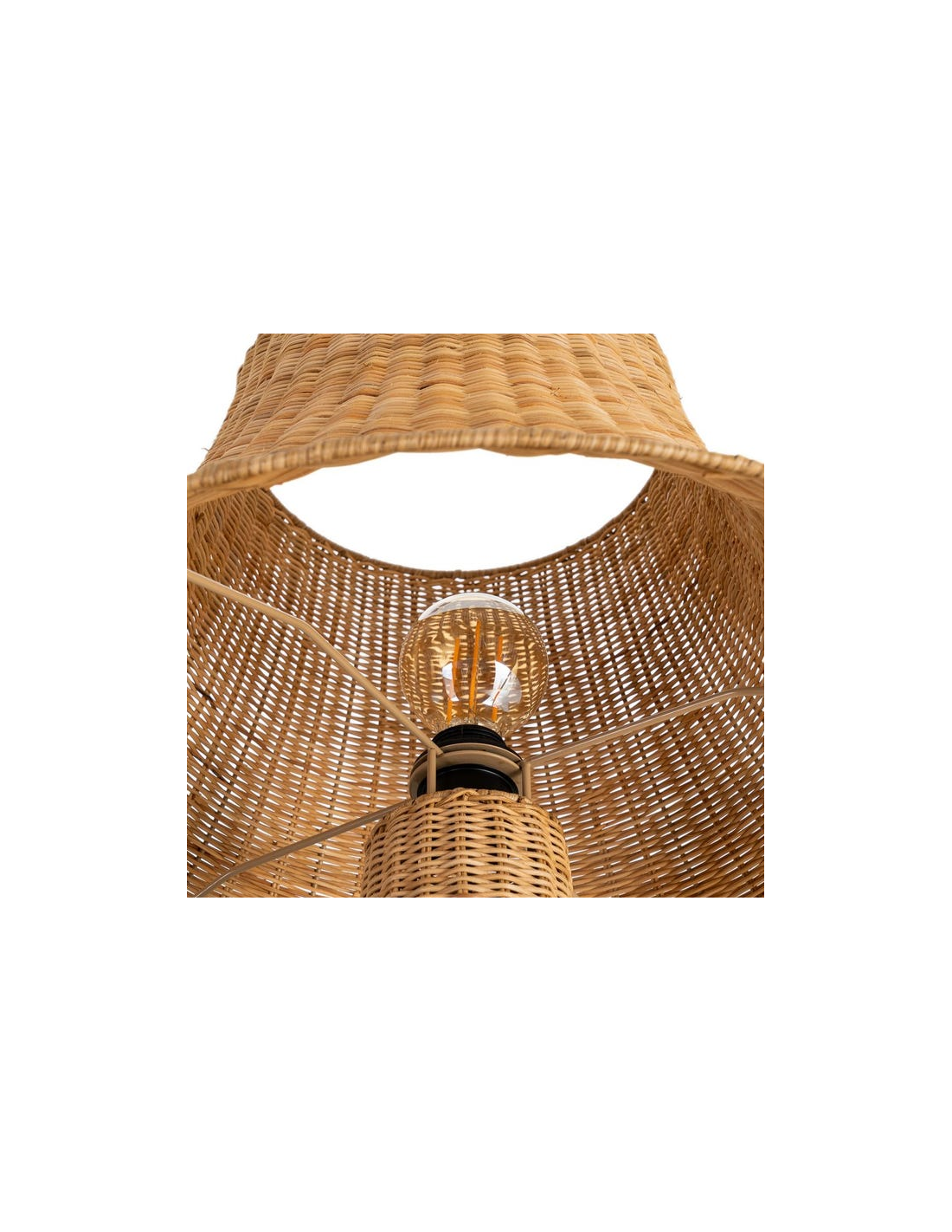 Gulvlampe fremstillet i et design af metal og naturfarvet rattan. Lampen måler 118,5 cm i højden og skærmen 60 cm i diameter. Lampen anvender 1 x E27 lyskilde (Ekskl.) og har en ledning på 180 cm med afbryder.