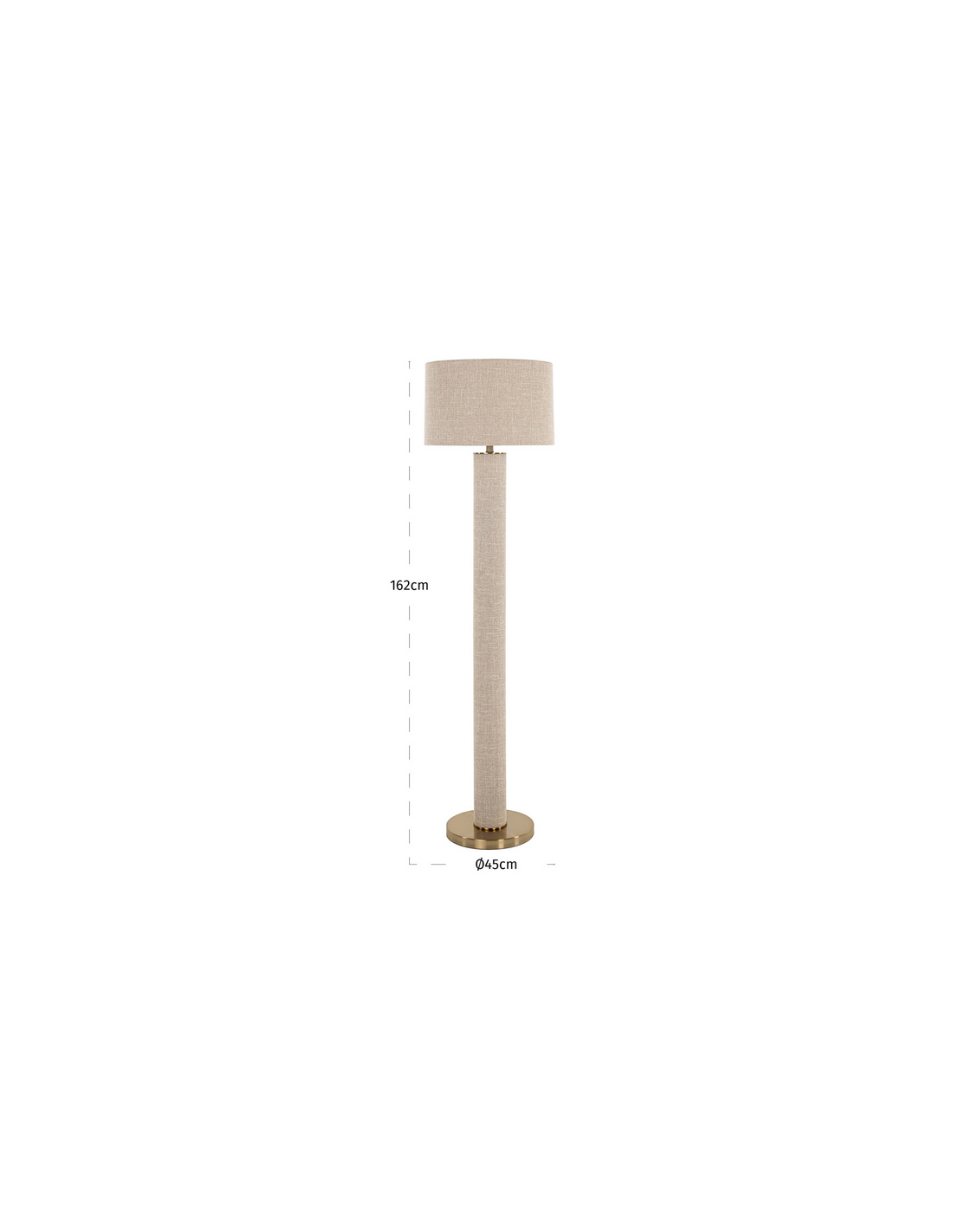 JOLINE Gulvlampe udført i et moderne design, fremstillet af messinglakeret jern og beige linned. Lampen måler 162 cm i højden og med skærmdiameter på 45 cm. Afbryder findes på 120 cm ledning.