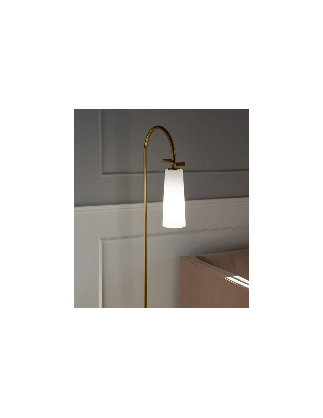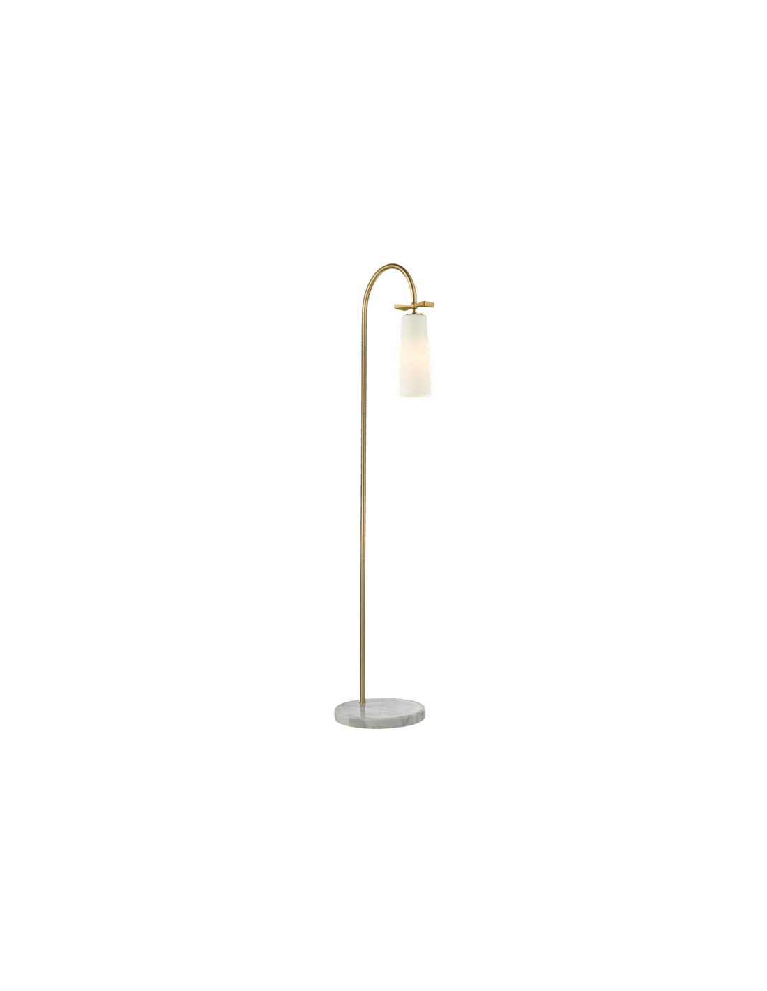BOW Gulvlampe fremstillet i et design af hvid marmorsten og børstet messinglakeret stål og med skærm i opalhvid glas. Lampen måler 150 cm i højden og leveres til europæisk standard til 1 x E27 lyskilde. Lampen har afbryder på ledningen.