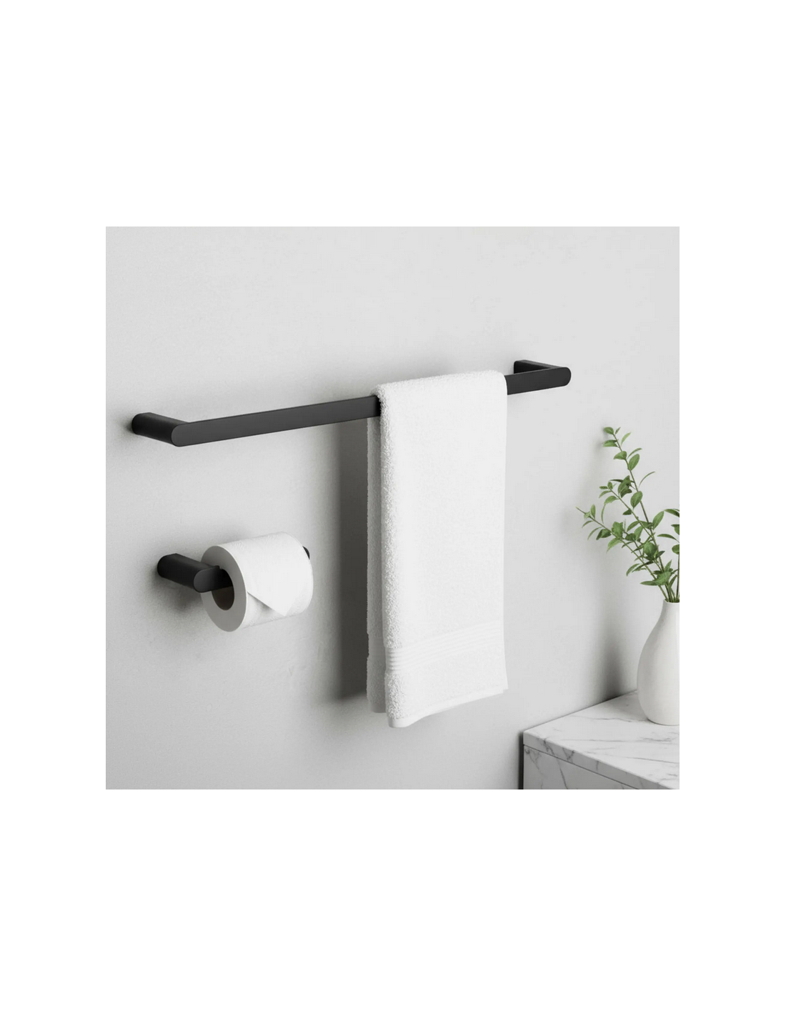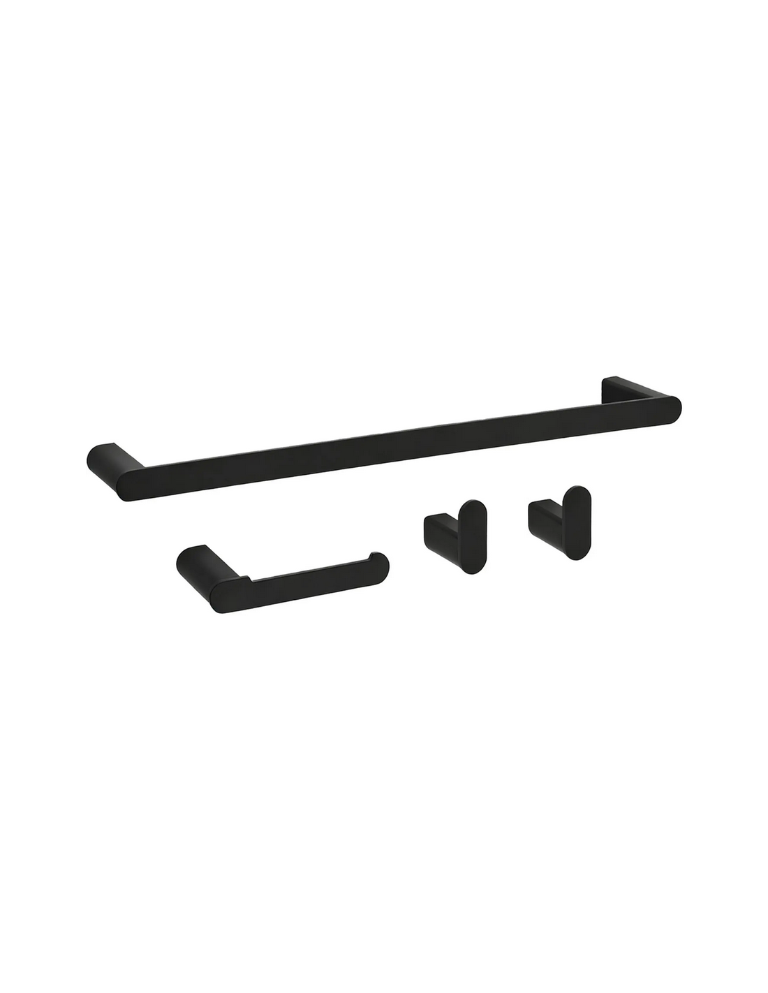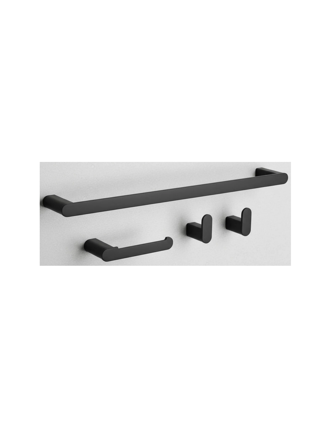 Badeværelsesæt med håndklædeholder, 2 x kroge samt toiletrulleholder, udført i et moderne design af mat sortlakeret metal.
