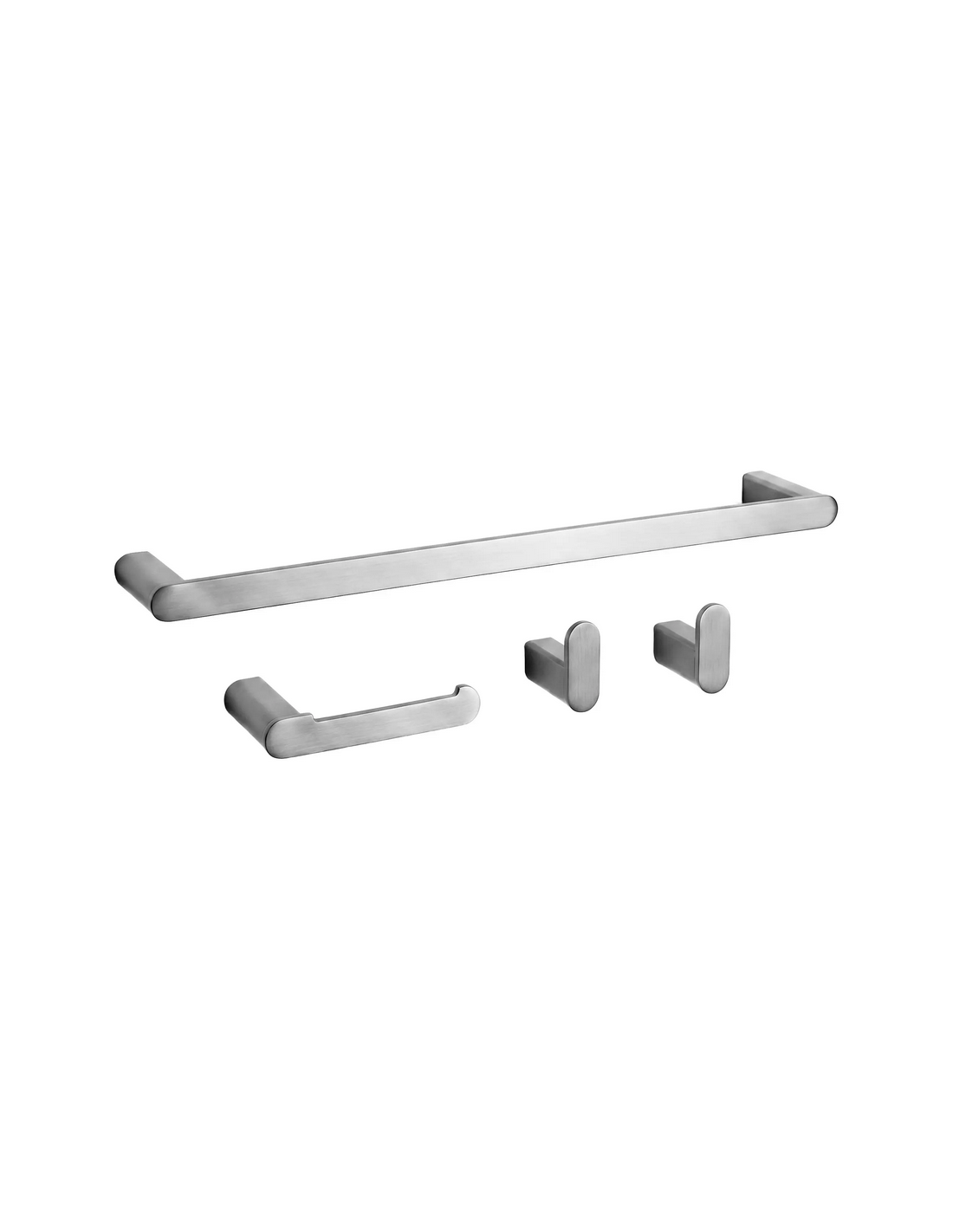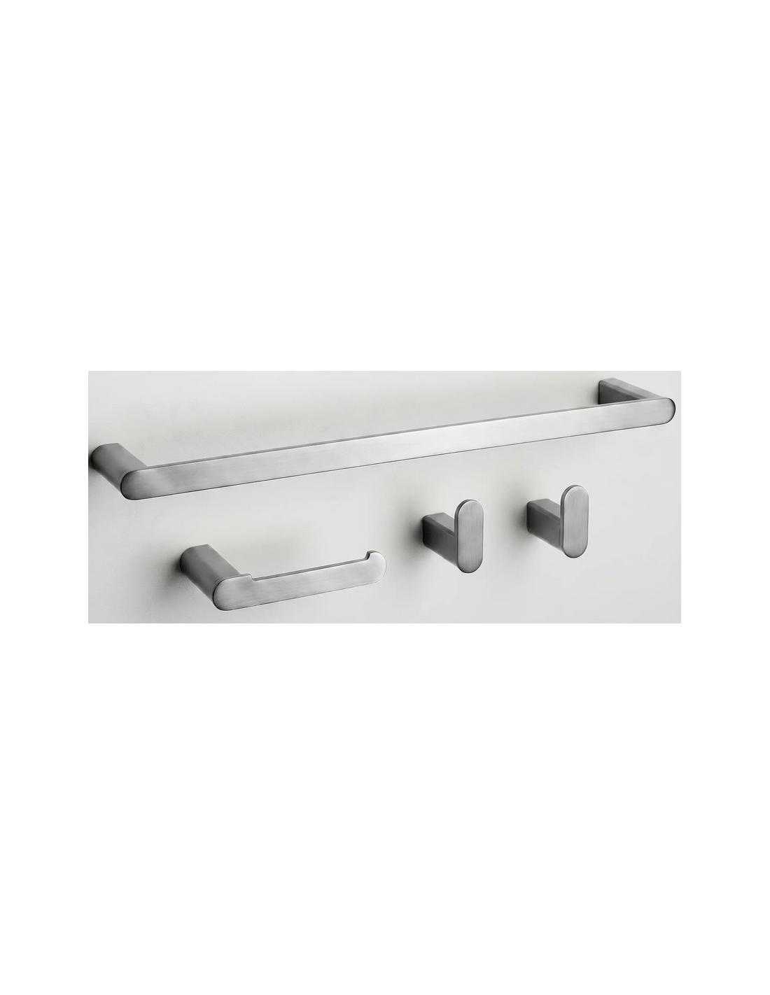 Badeværelsesæt med håndklædeholder, 2 x kroge samt toiletrulleholder, udført i et moderne design af børstet nikkelgrå metal.