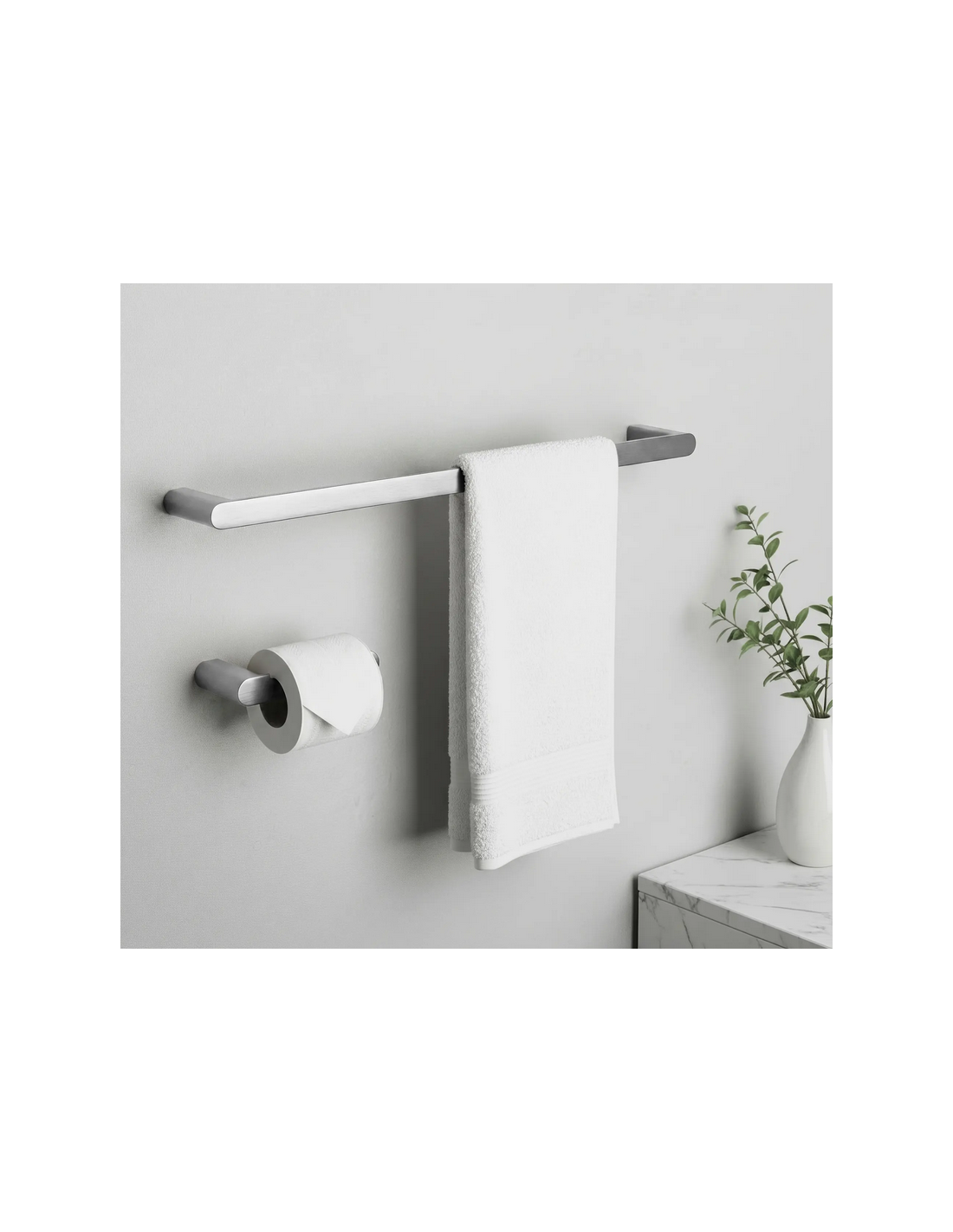 Badeværelsessæt med håndklædeholder, kroge og toiletrulleholder i metal - Børstet nikkelgrå