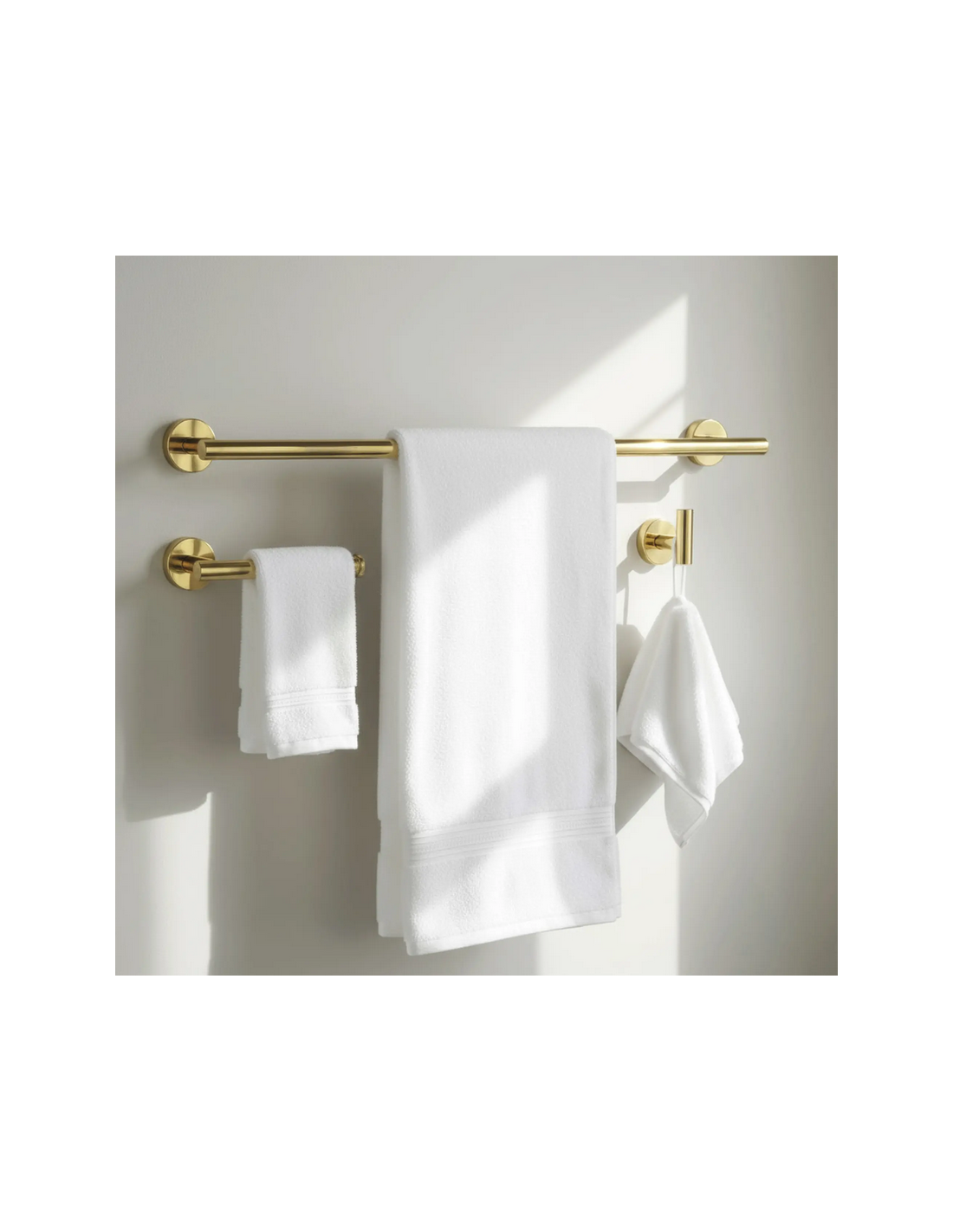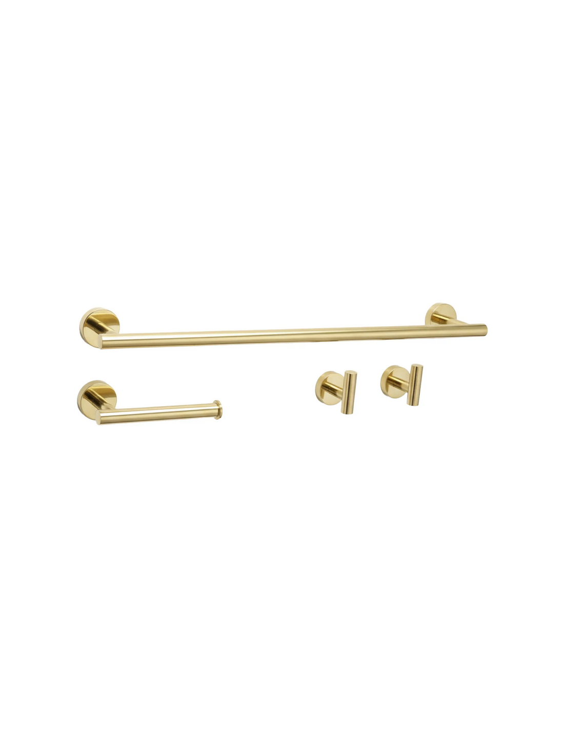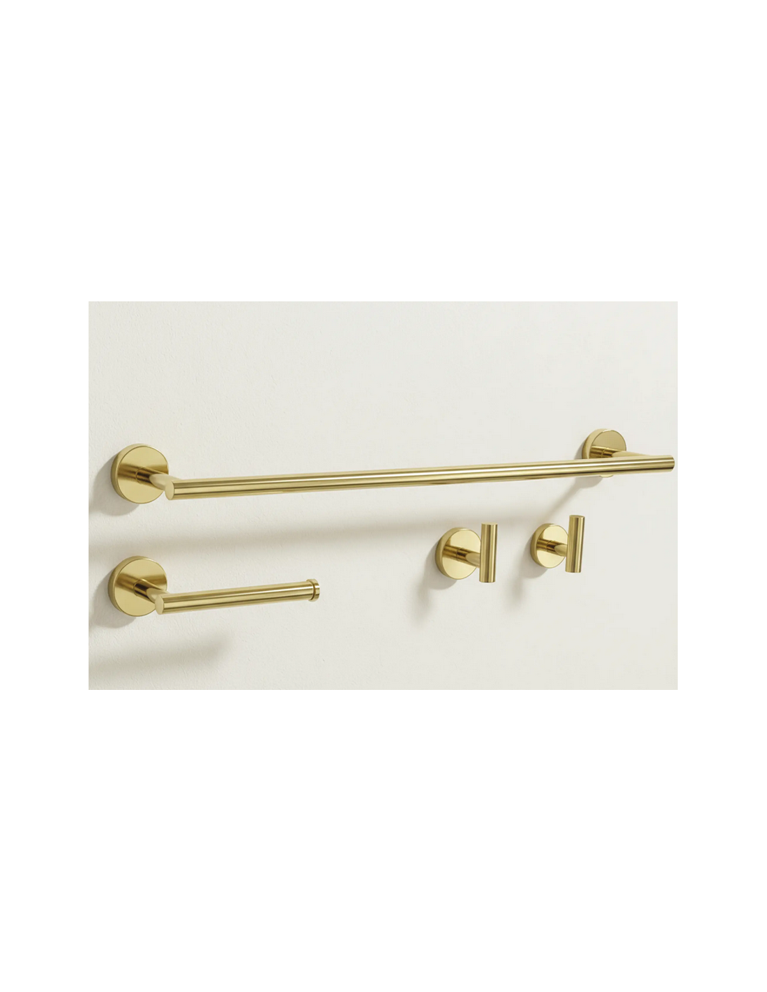 Badeværelsesæt med håndklædeholder, 2 x kroge samt toiletrulleholder, udført i et moderne design af guldfarvet metal.