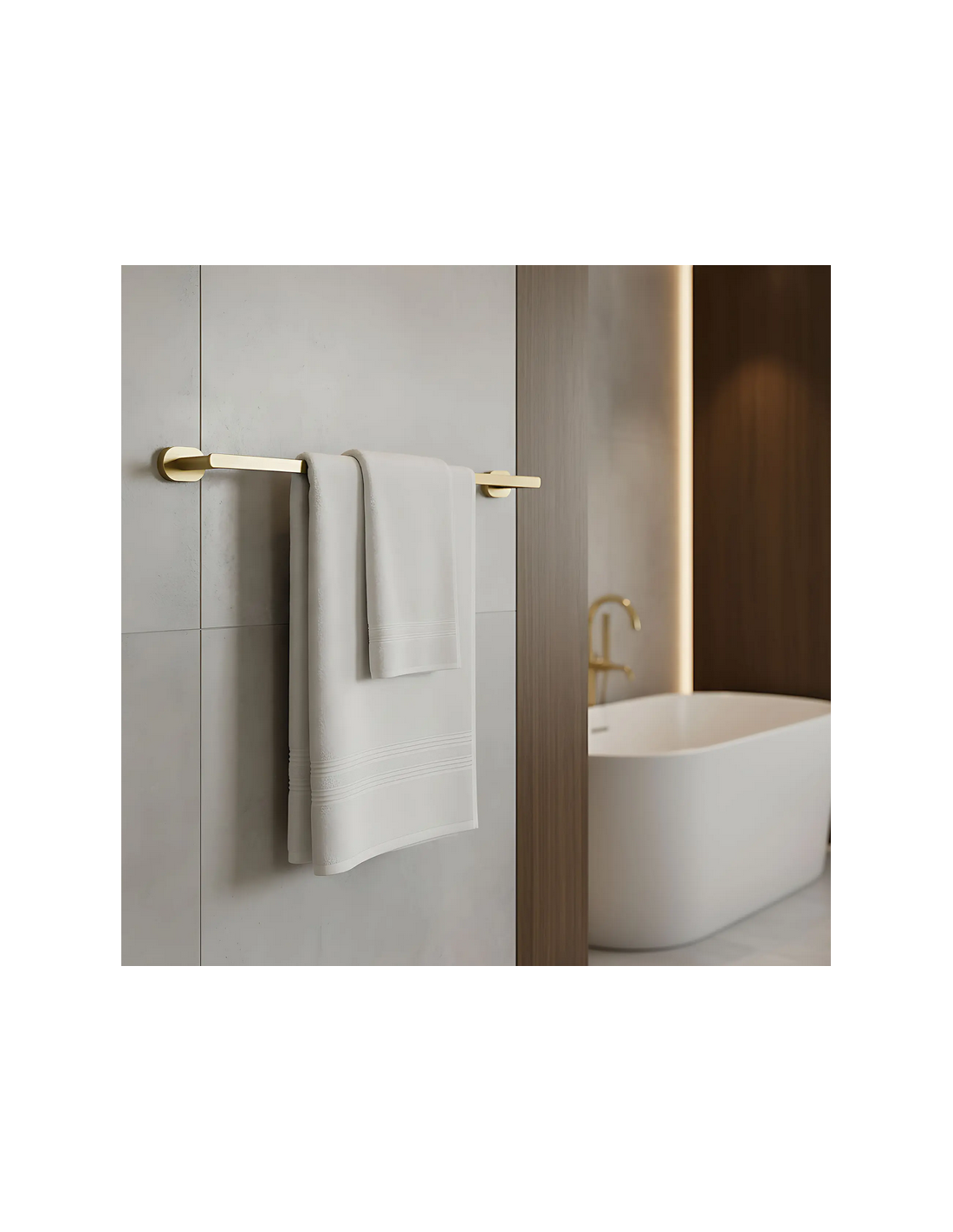 Håndklædestang udført i et moderne design af børstet guldfarvet lakeret metal. Stangen måler 57,5 cm i bredden.