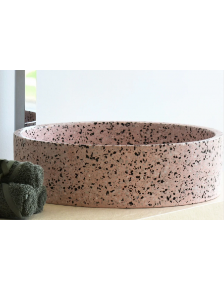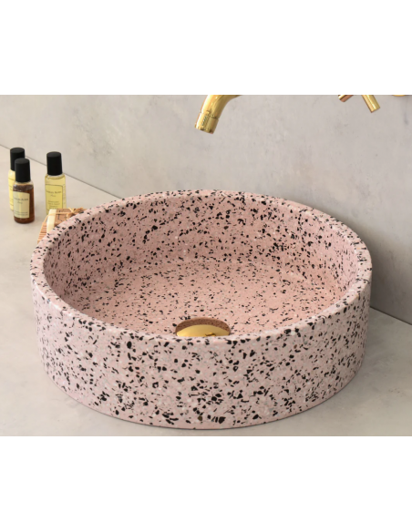 EOS Rund bordmonteret håndvask udført i et moderne design af pink terrazzo med forsegling til badeværelsesbrug. Håndvasken måler 11 cm i højden og 38,2 cm i diameter. Leveres uden bundventil, men anbefales at bruge med pop-up bundventil.