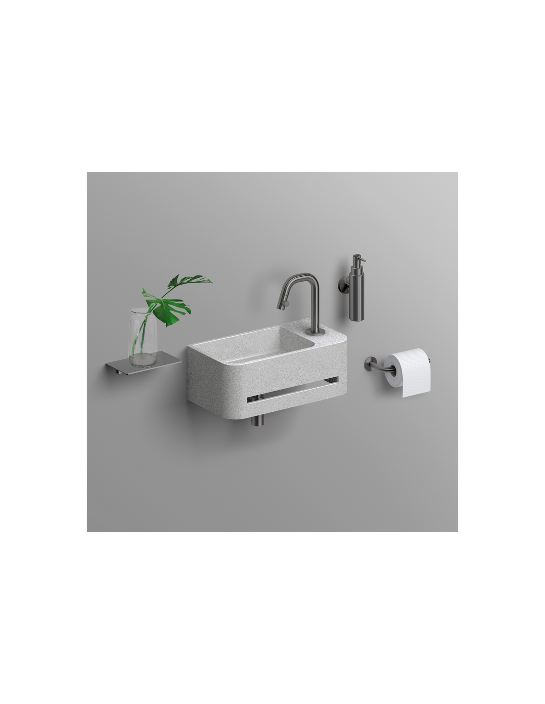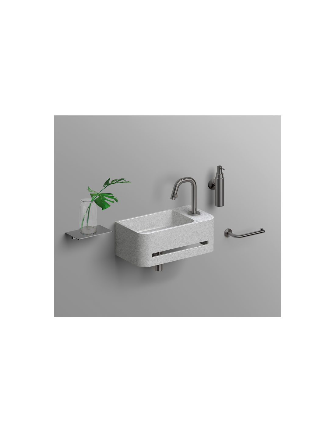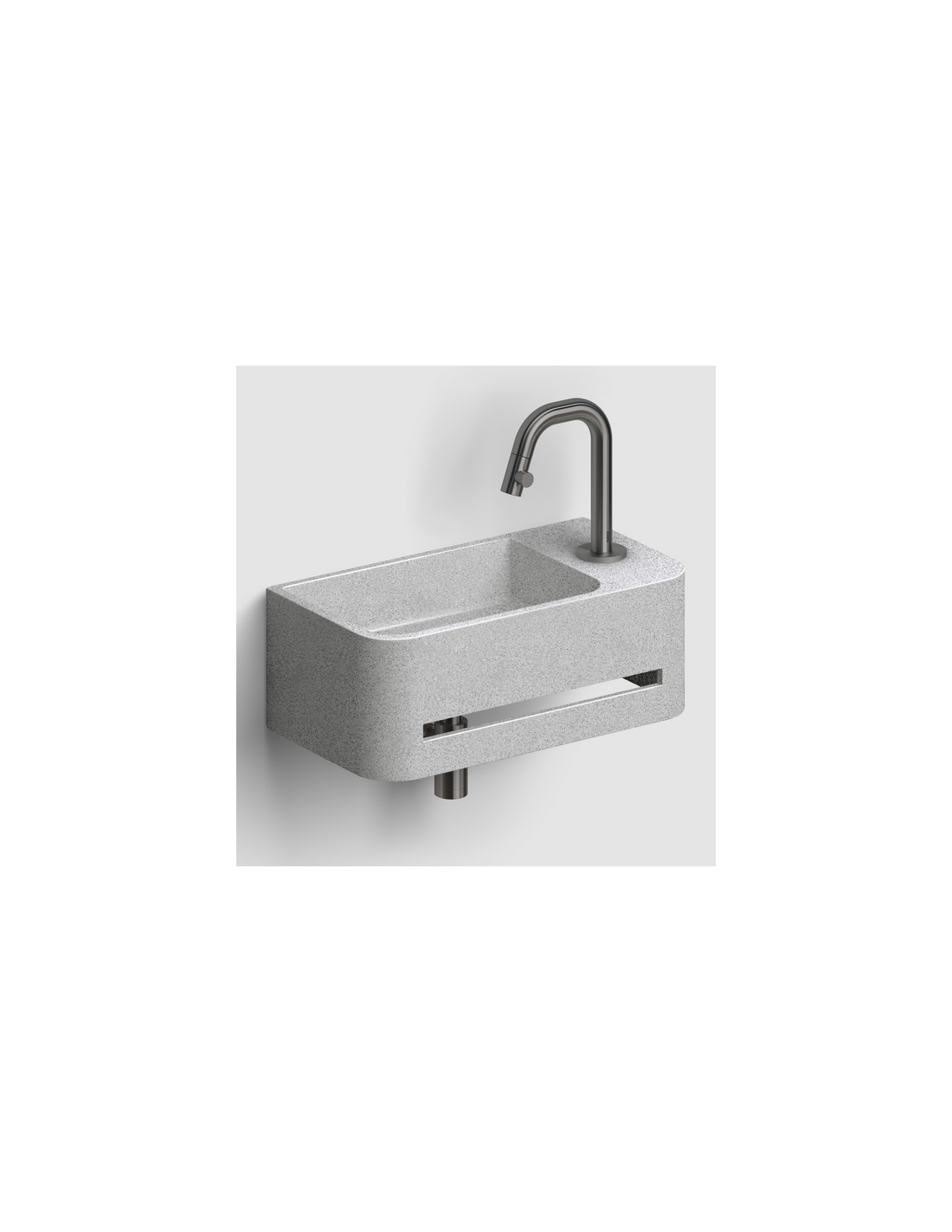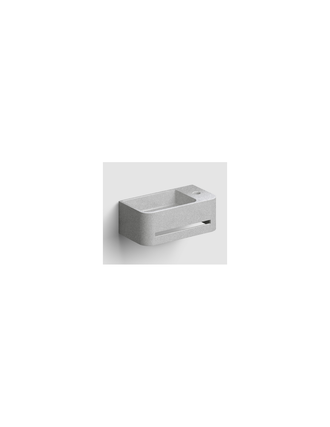 INBE Håndvask med håndklædetørre og hanehul til montering på væg. Håndvasken er udført i et design af grå microrazzo beton. Håndvasken måler 16 cm i højden og 43 x 23 cm i bredde og dybde.