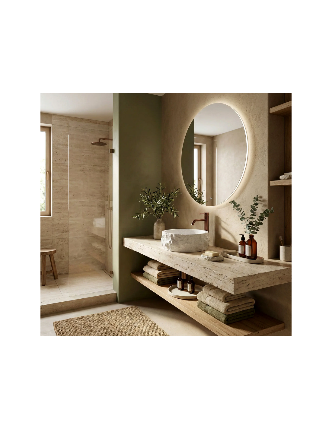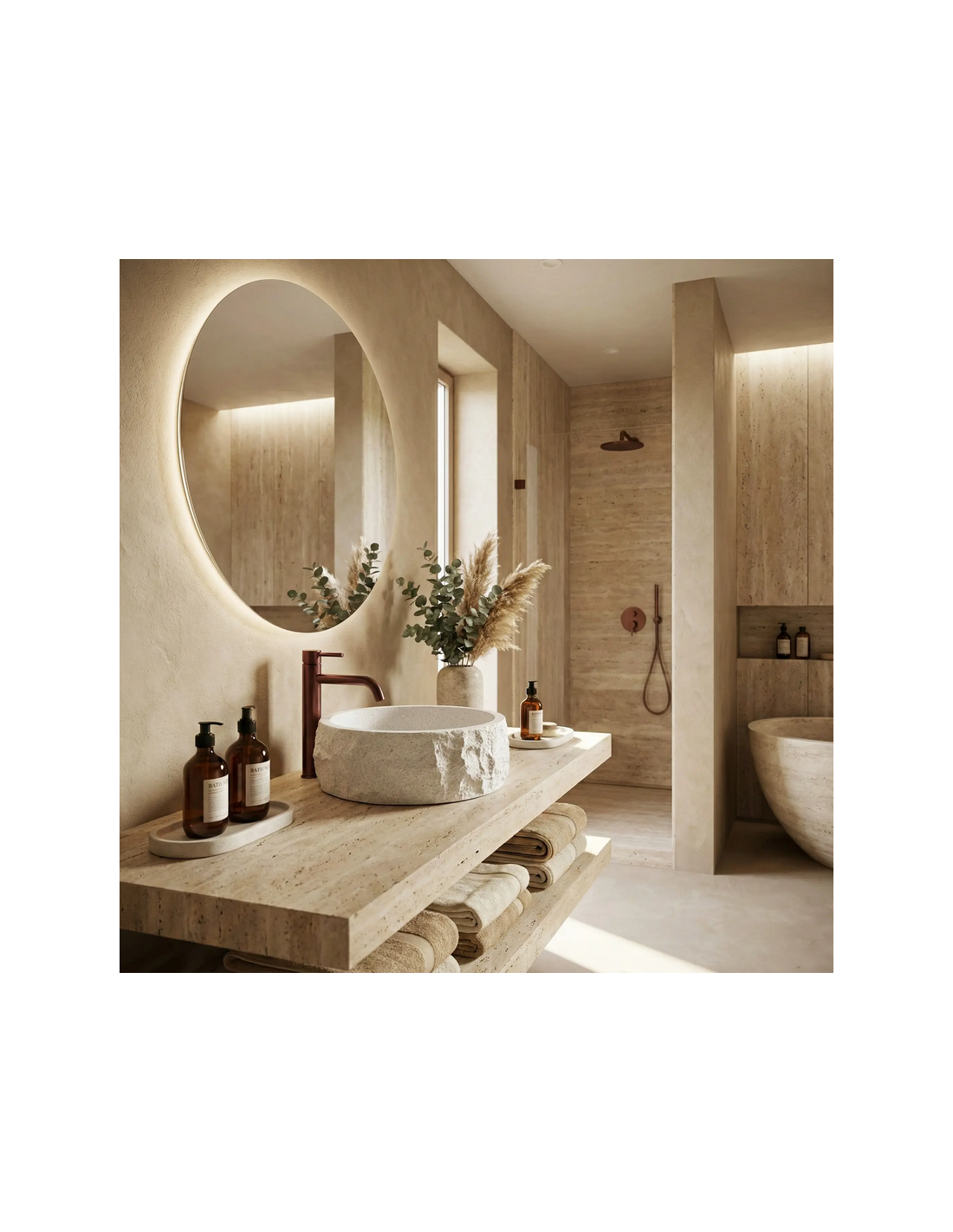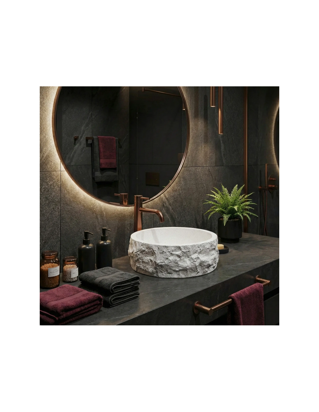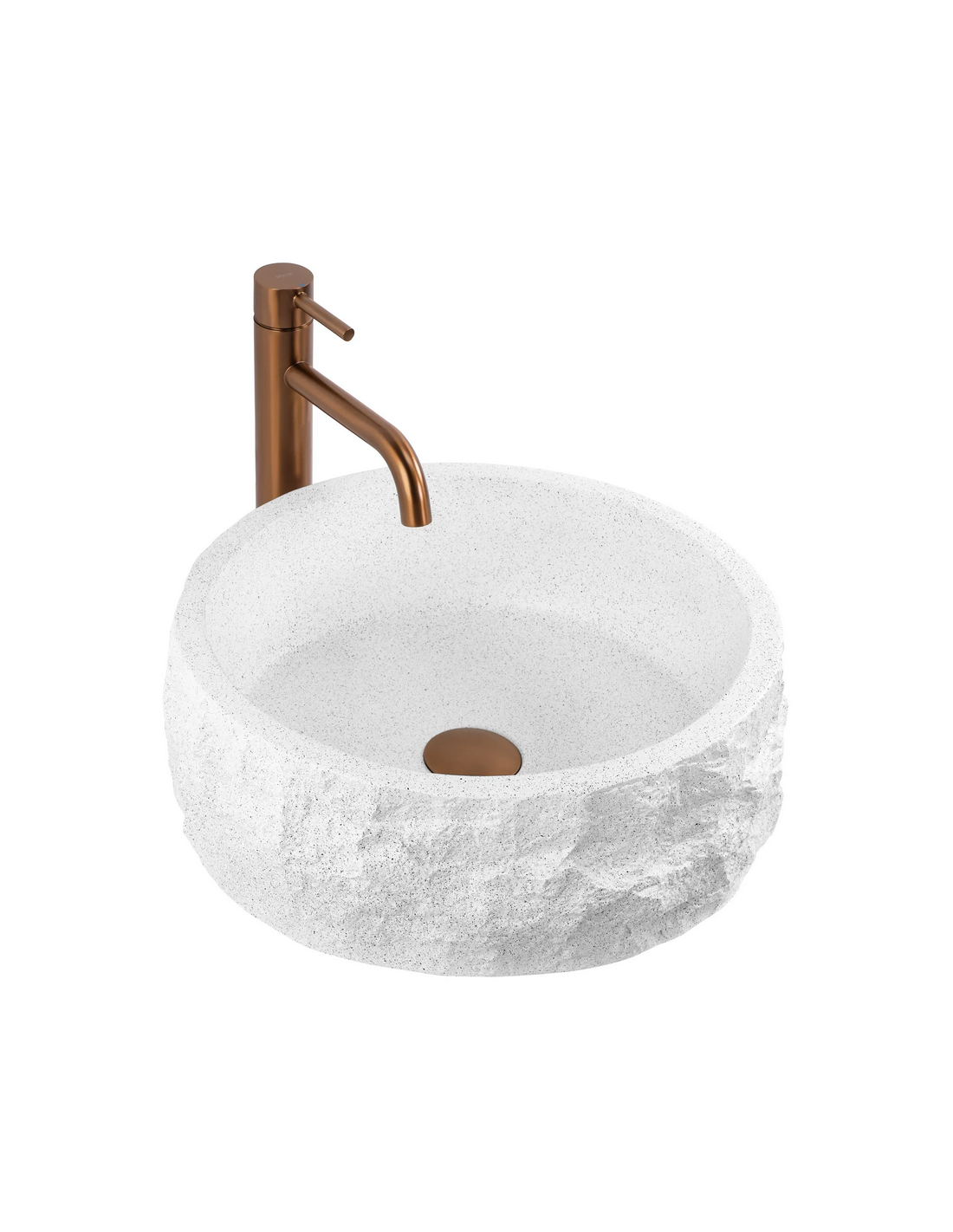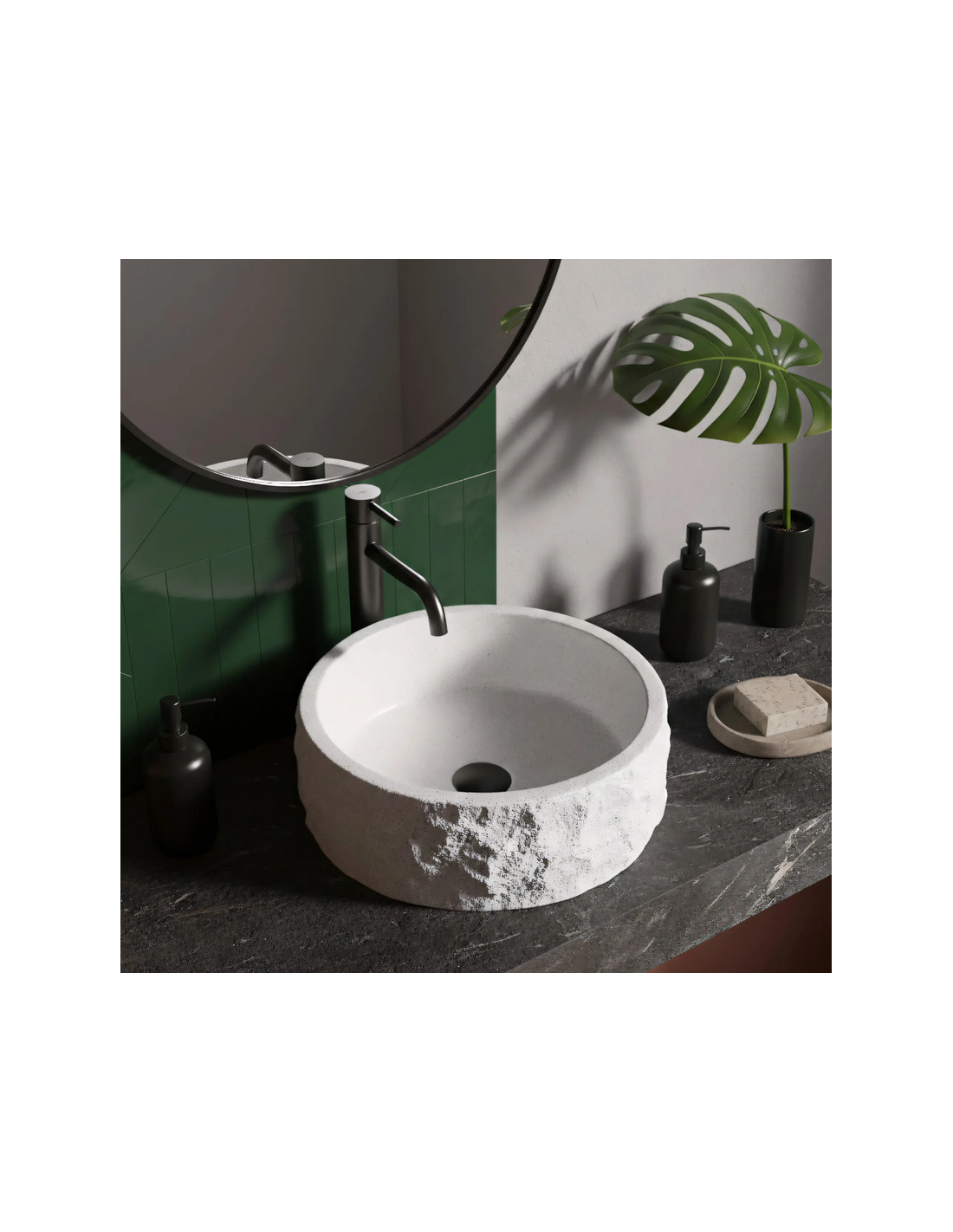 Bordmonteret rund håndvask udført i et moderne design af gråhvid stenkomposit med stenlook. Håndvasken måler 38,5 cm i diameter. Håndvasken leveres uden bundventil og andet vist tilbehør.