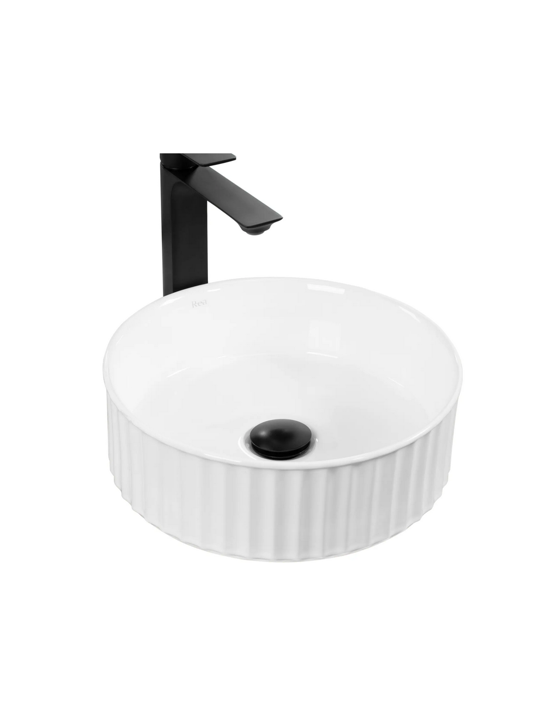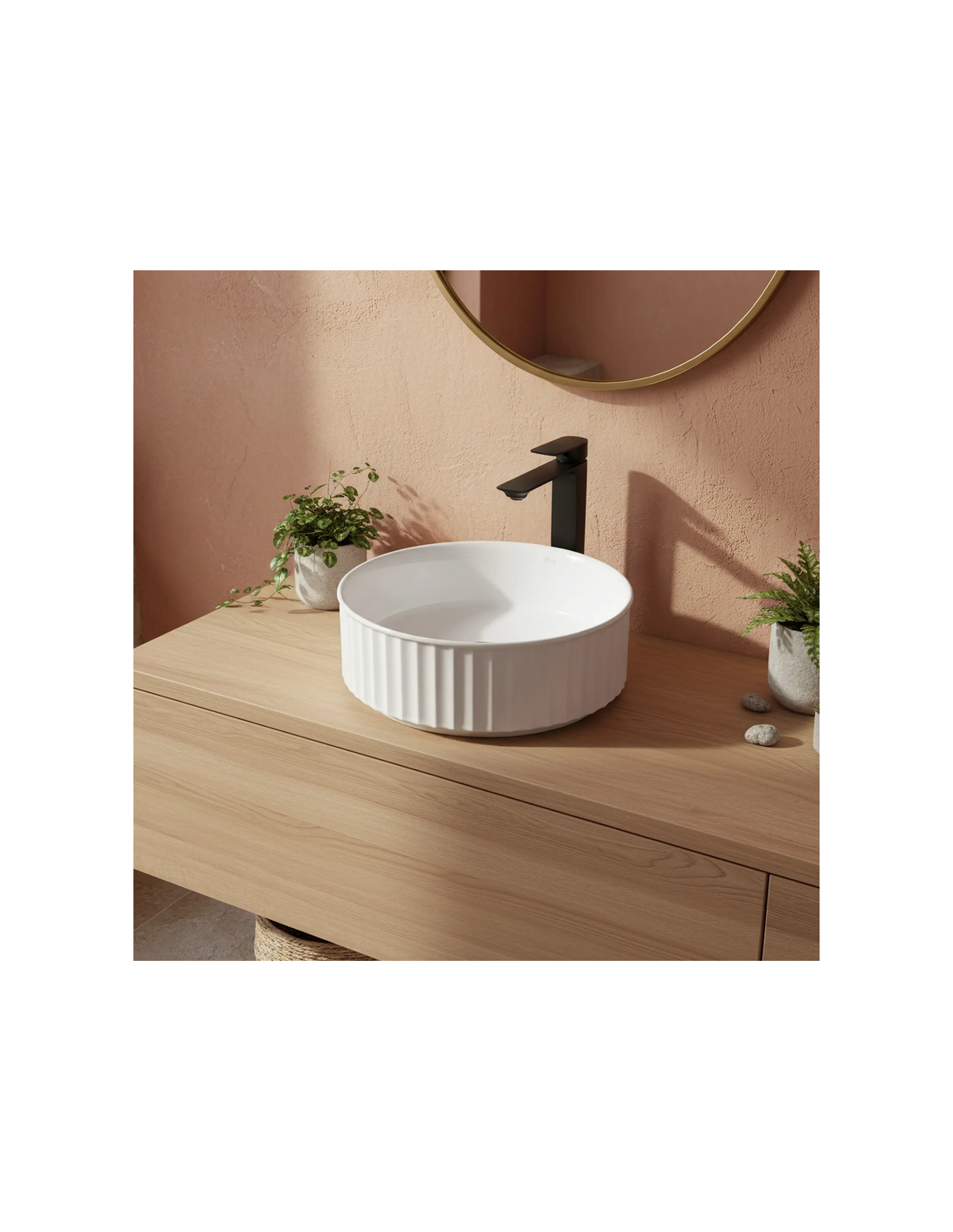 Bordmonteret rund håndvask udført i et moderne design af hvid keramik. Håndvasken måler 36,5 cm i diameter. Håndvasken leveres uden bundventil og andet vist tilbehør.