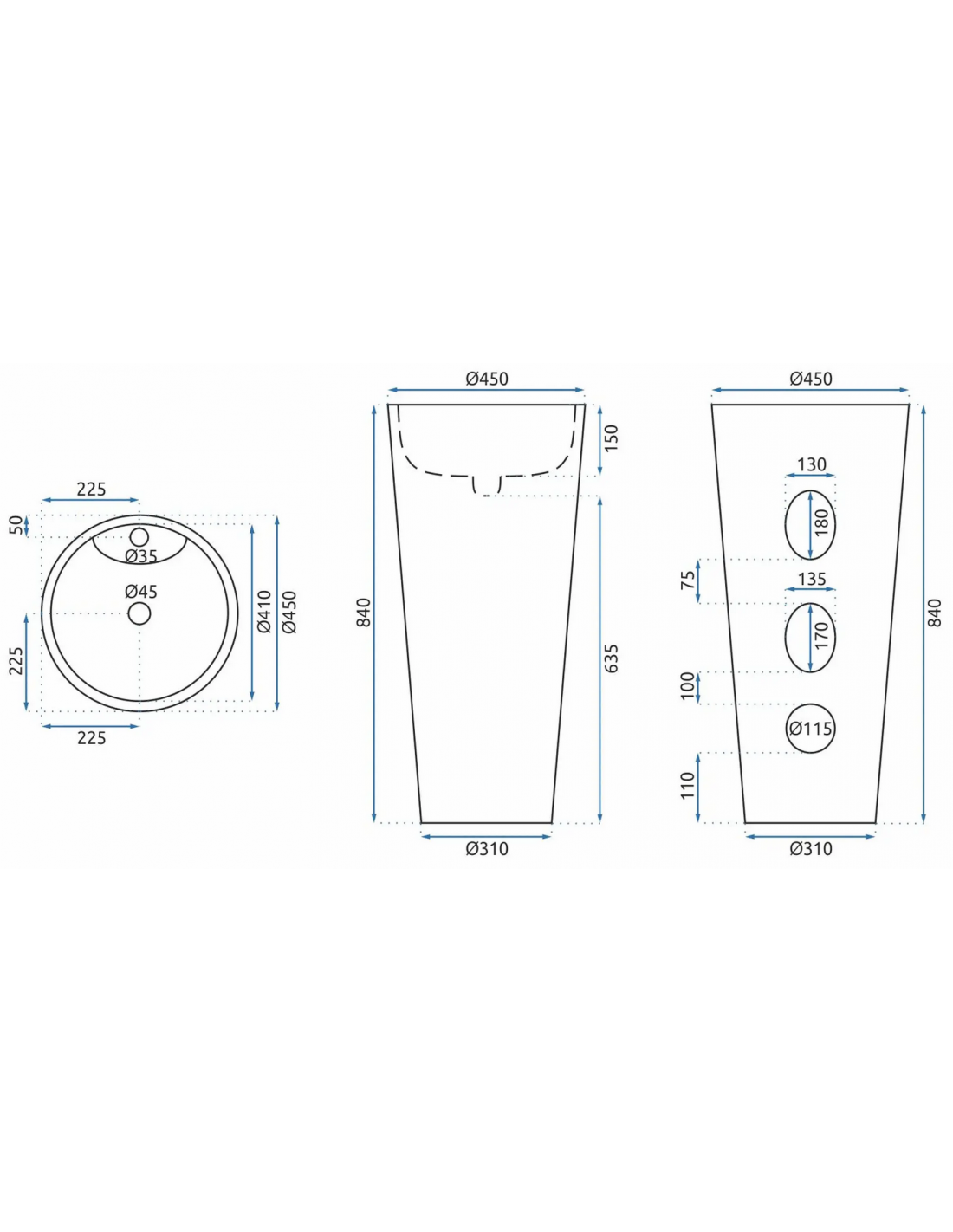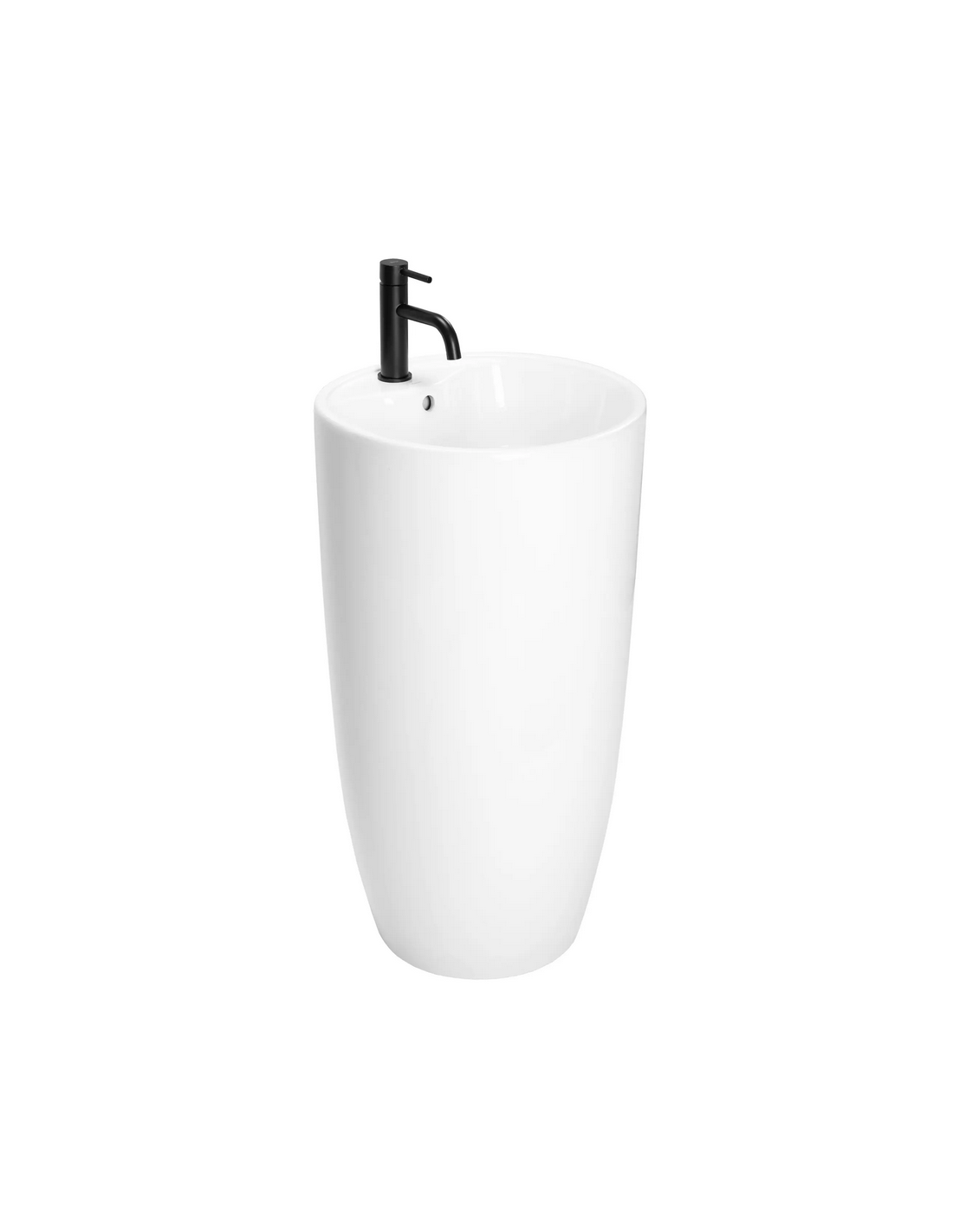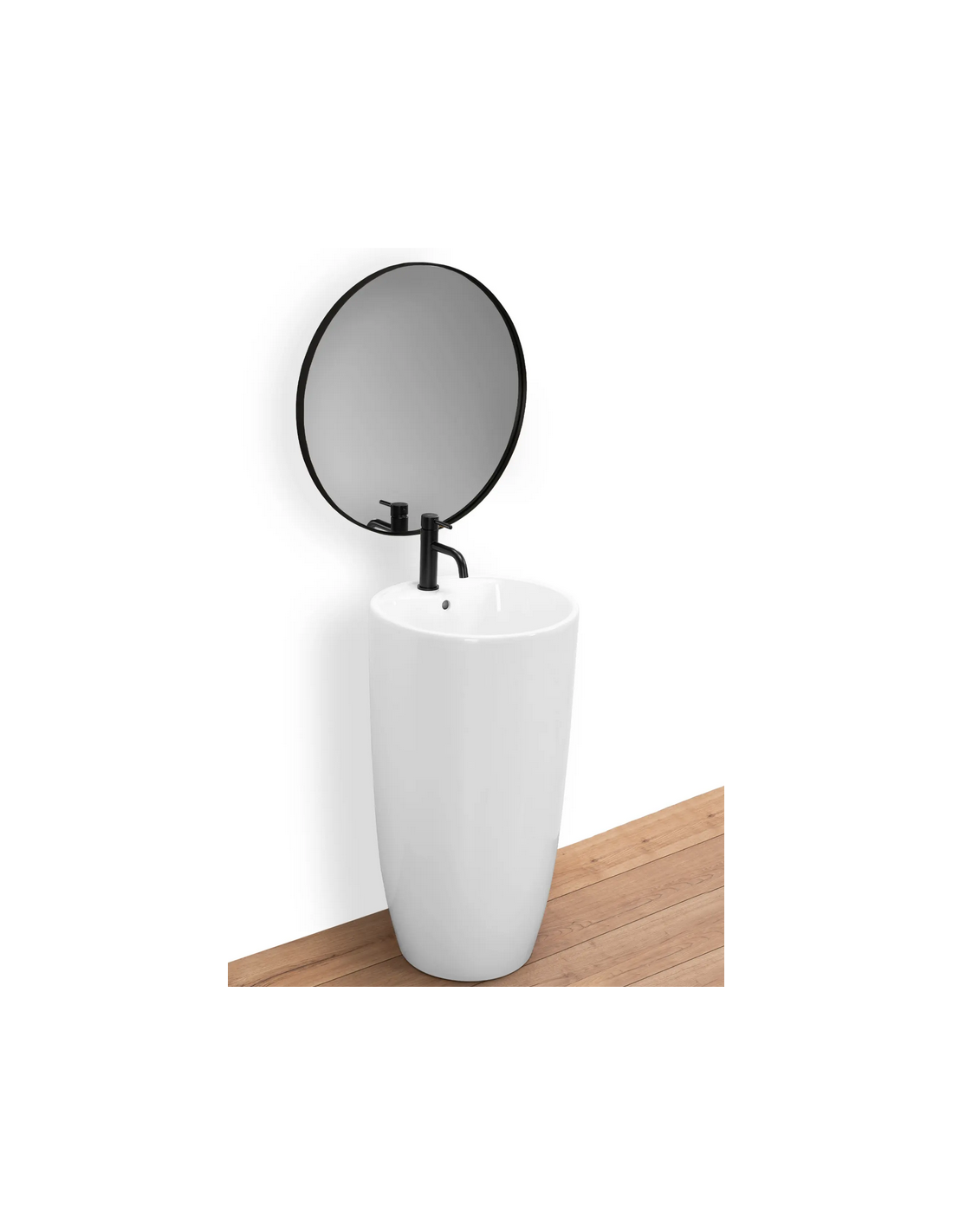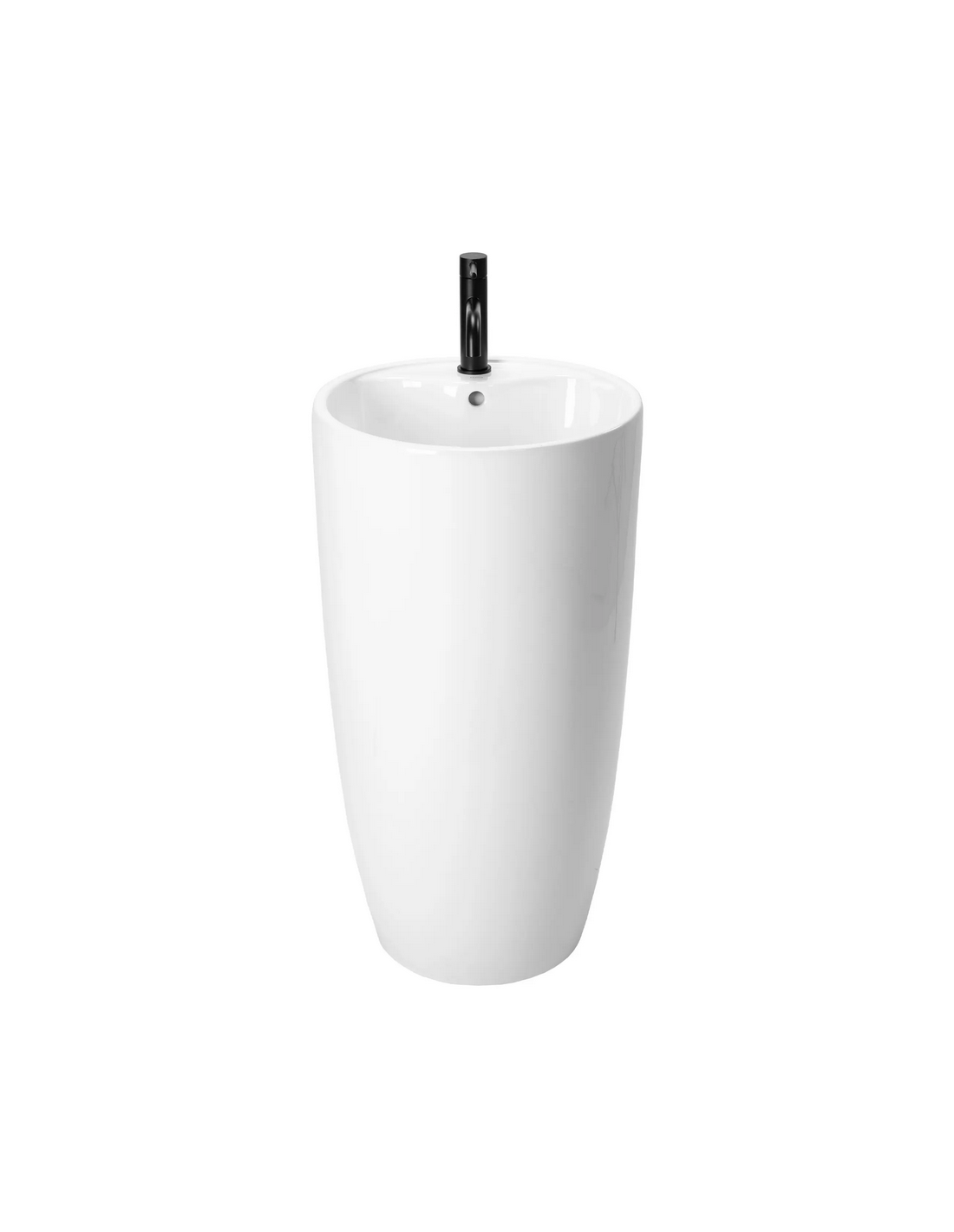 Gulvmonteret rund håndvask udført i et moderne design af hvid keramik. Håndvasken måler 84 cm i højden og 45 cm i diameter. Håndvasken leveres uden bundventil og andet vist tilbehør. På bagsiden af vasken forefindes åbninger til rørudføring.