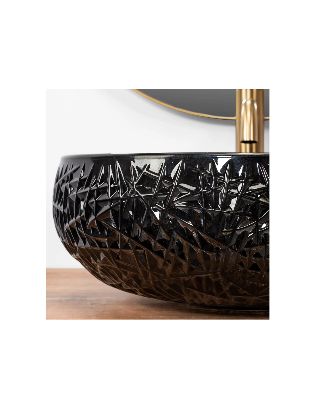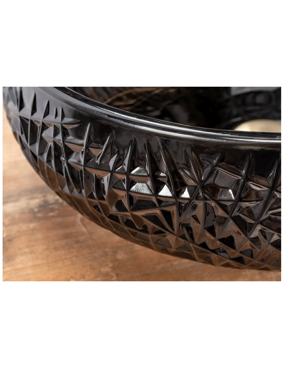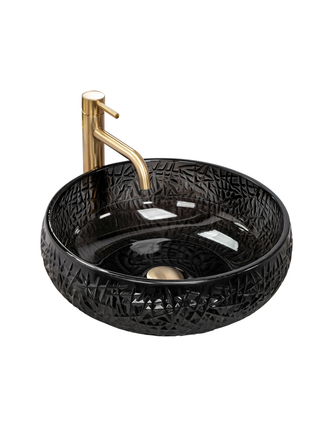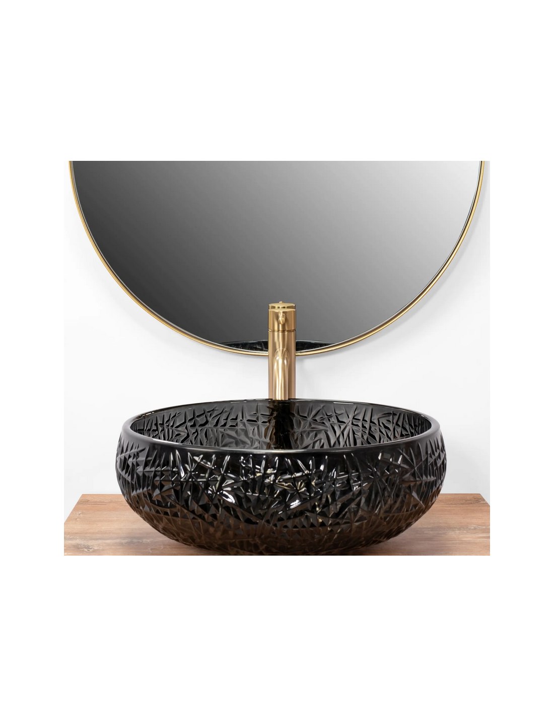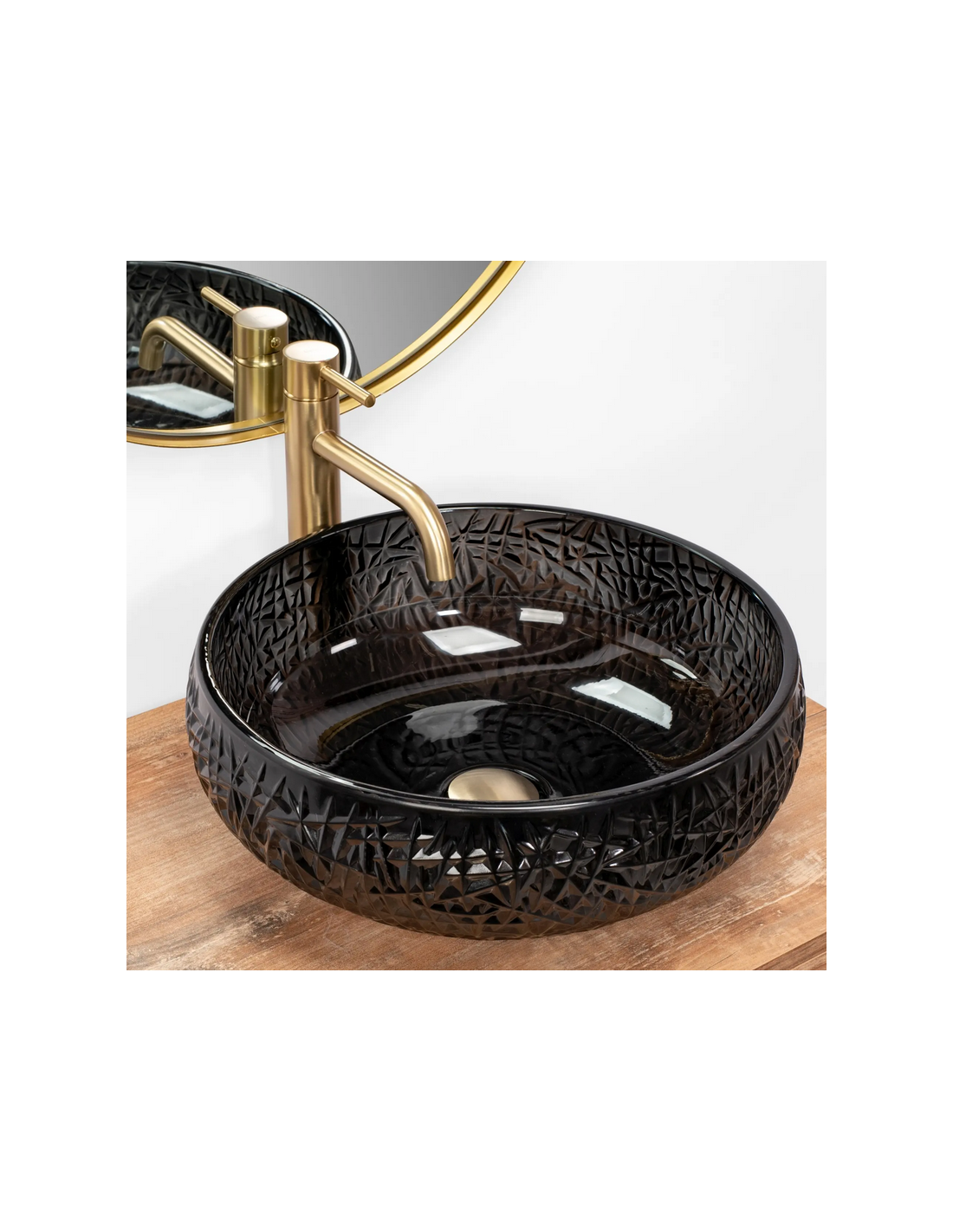 Bordmonteret rund håndvask udført i et moderne design af klar sort glas. Håndvasken måler 42 cm i diameter. Håndvasken leveres uden bundventil og andet vist tilbehør.