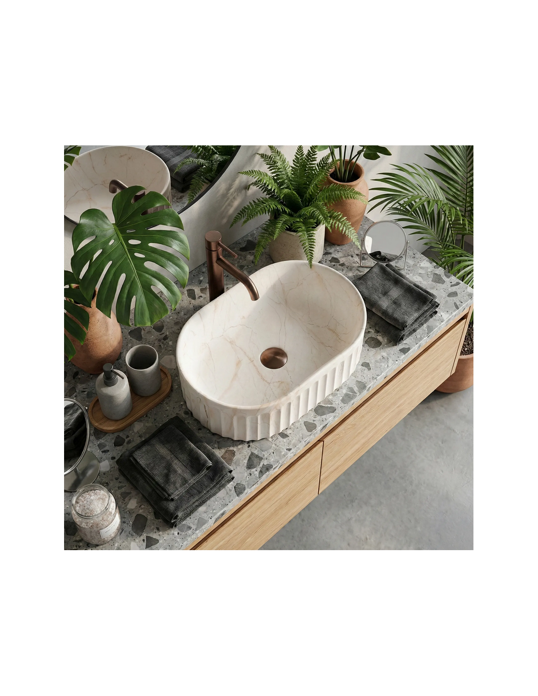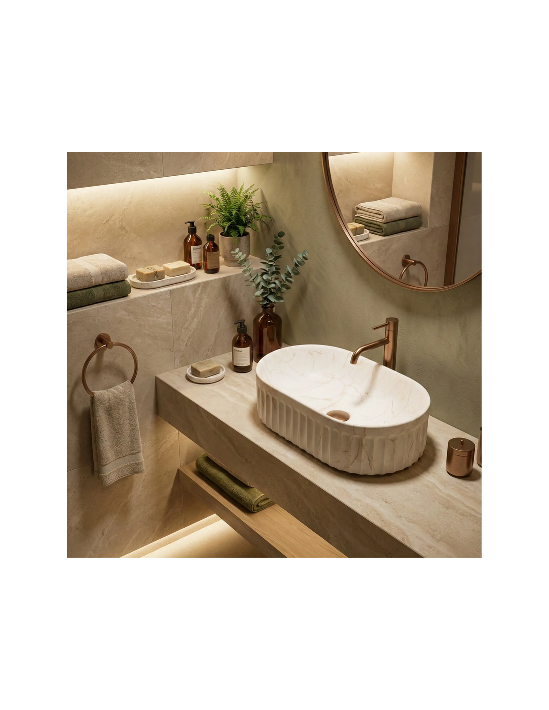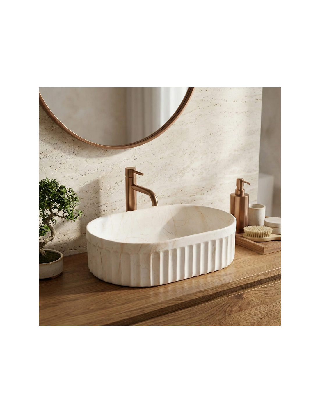Bordmonteret oval håndvask i keramik 52 x 35 cm - Beige marmor