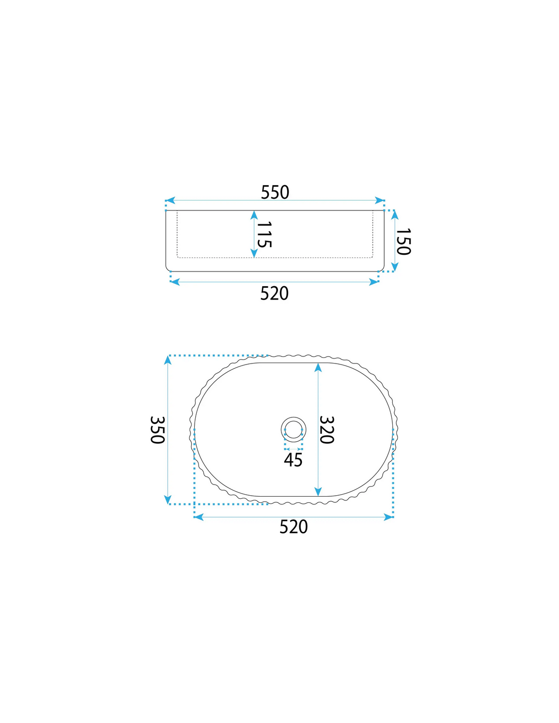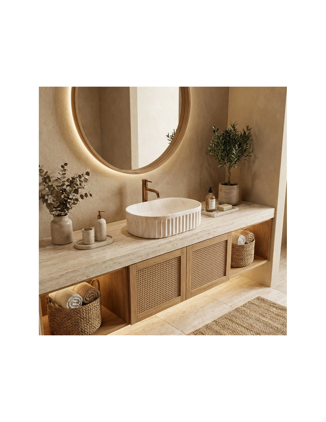 Bordmonteret oval håndvask udført i et moderne design af beige marmoriseret sanitær keramik. Håndvasken måler 52 x 35 cm i bredde og dybde. Håndvasken leveres uden bundventil og andet vist tilbehør.