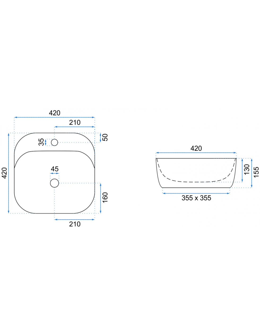 Bordmonteret håndvask udført i et moderne design af mat lysegrå sanitær keramik. Håndvasken måler 42 x 42 cm i bredde og dybde. Håndvasken leveres uden bundventil og andet vist tilbehør. Denne håndvask har hanehul.