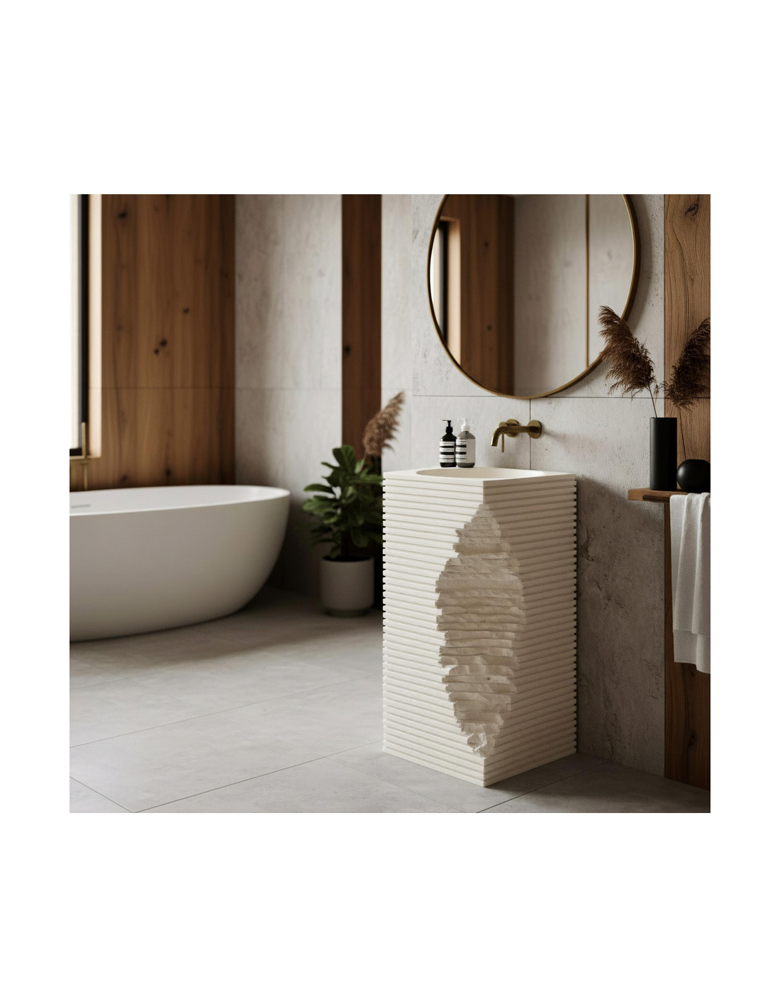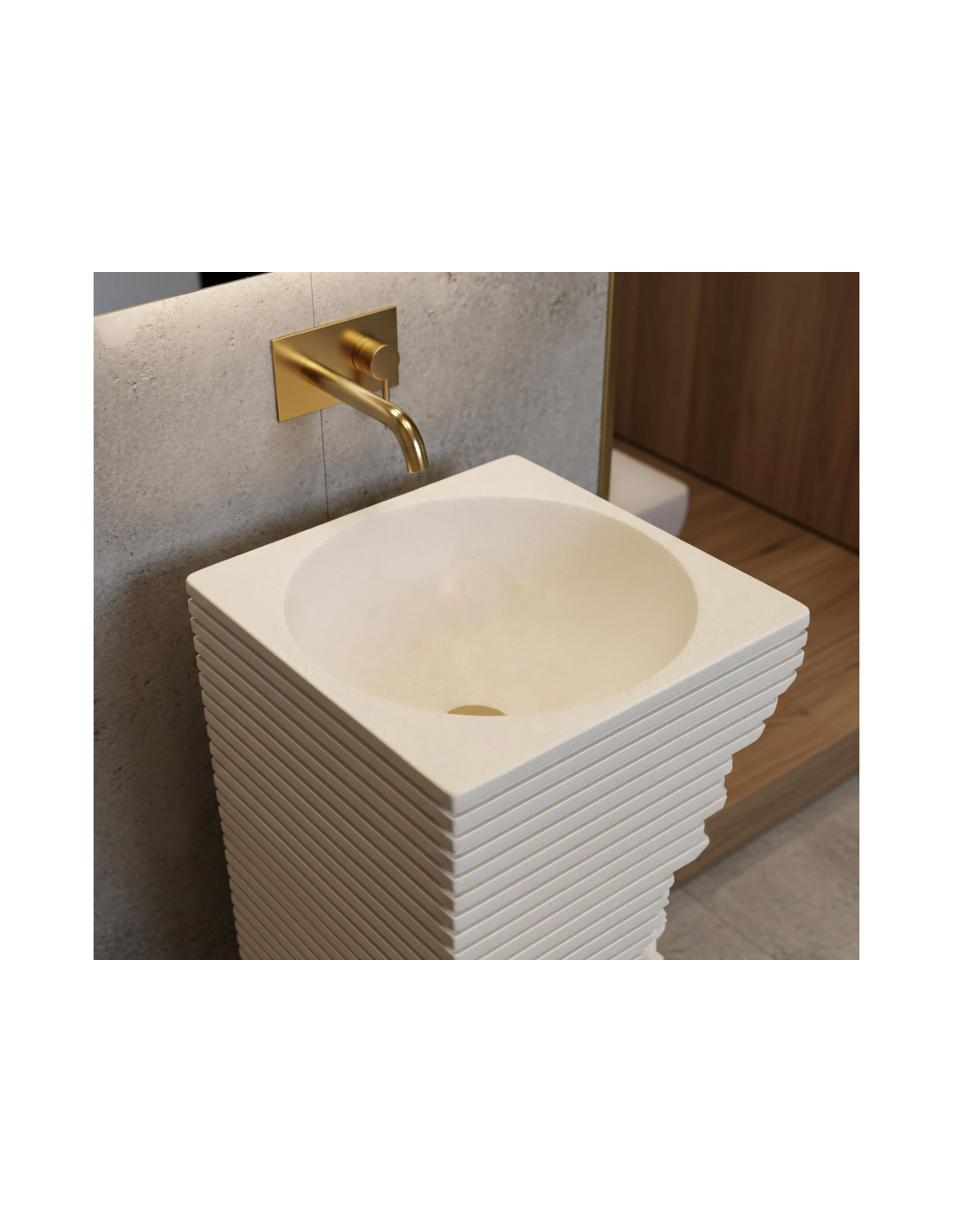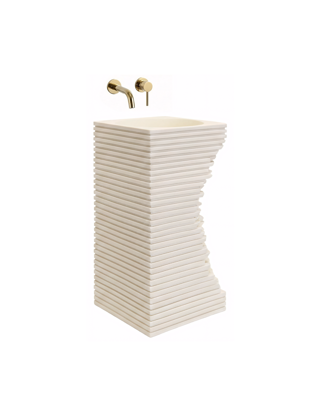 Gulvmonteret firkantet håndvask udført i et rustikt design af mat naturfarvet kompositsten. Håndvasken måler 84 cm i højden og 40 x 40 cm i bredde og dybde. Håndvasken leveres uden bundventil og andet vist tilbehør. På bagsiden af vasken forefindes åbninger til rørudføring.