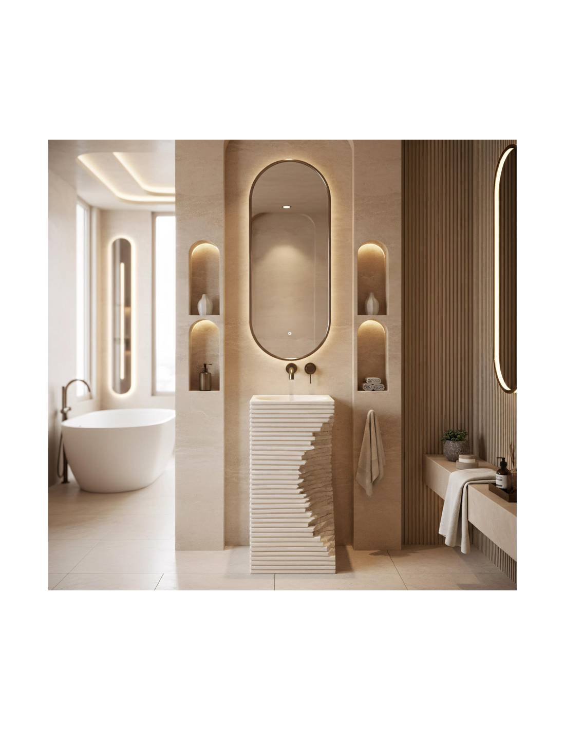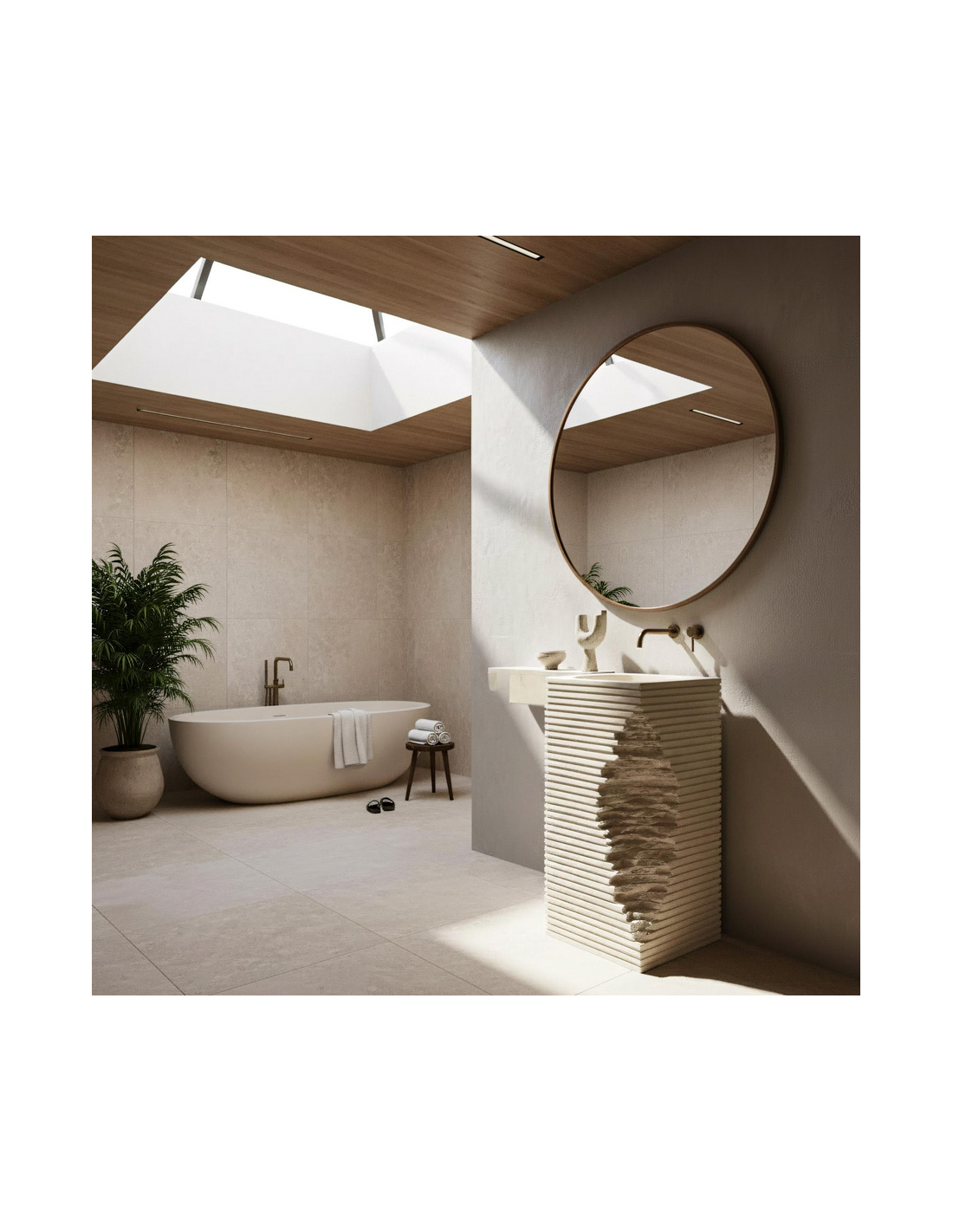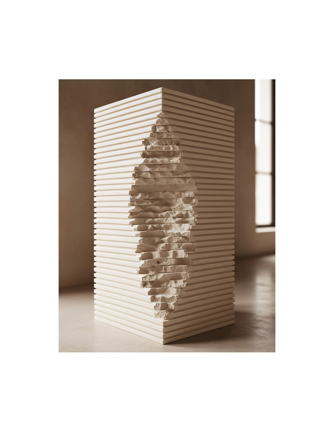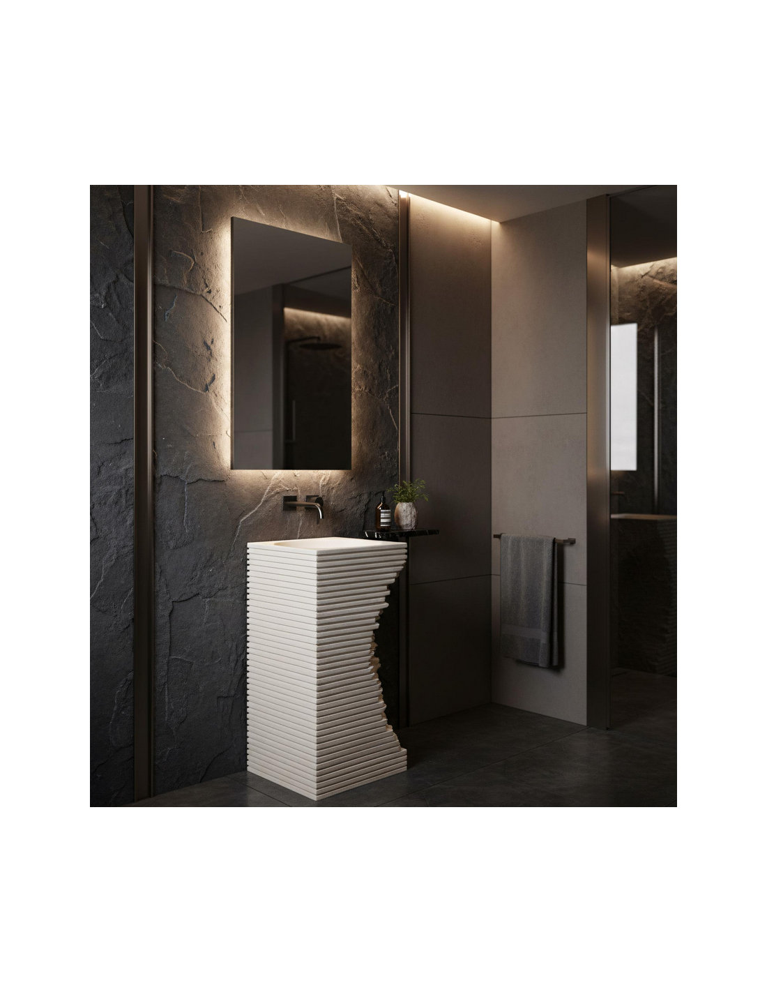 Gulvmonteret firkantet håndvask udført i et rustikt design af mat naturfarvet kompositsten. Håndvasken måler 84 cm i højden og 40 x 40 cm i bredde og dybde. Håndvasken leveres uden bundventil og andet vist tilbehør. På bagsiden af vasken forefindes åbninger til rørudføring.