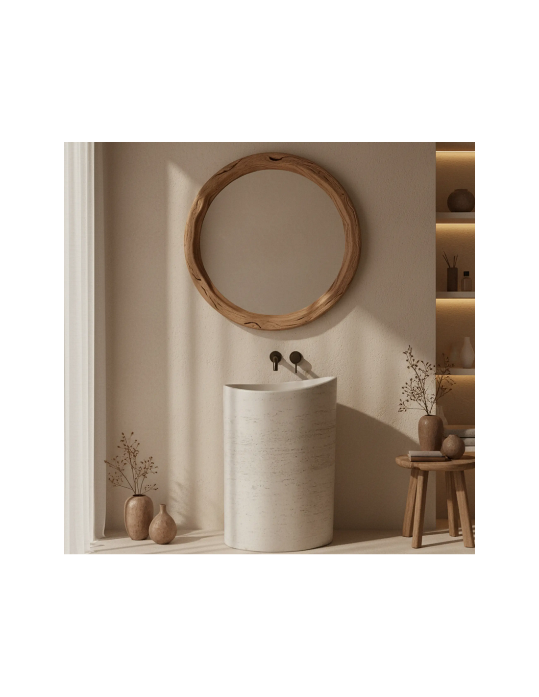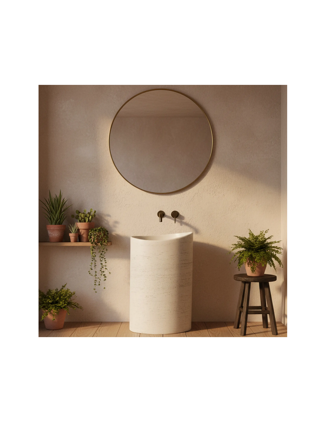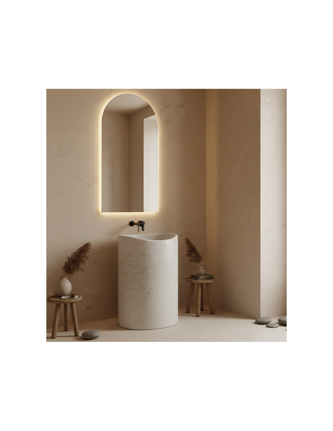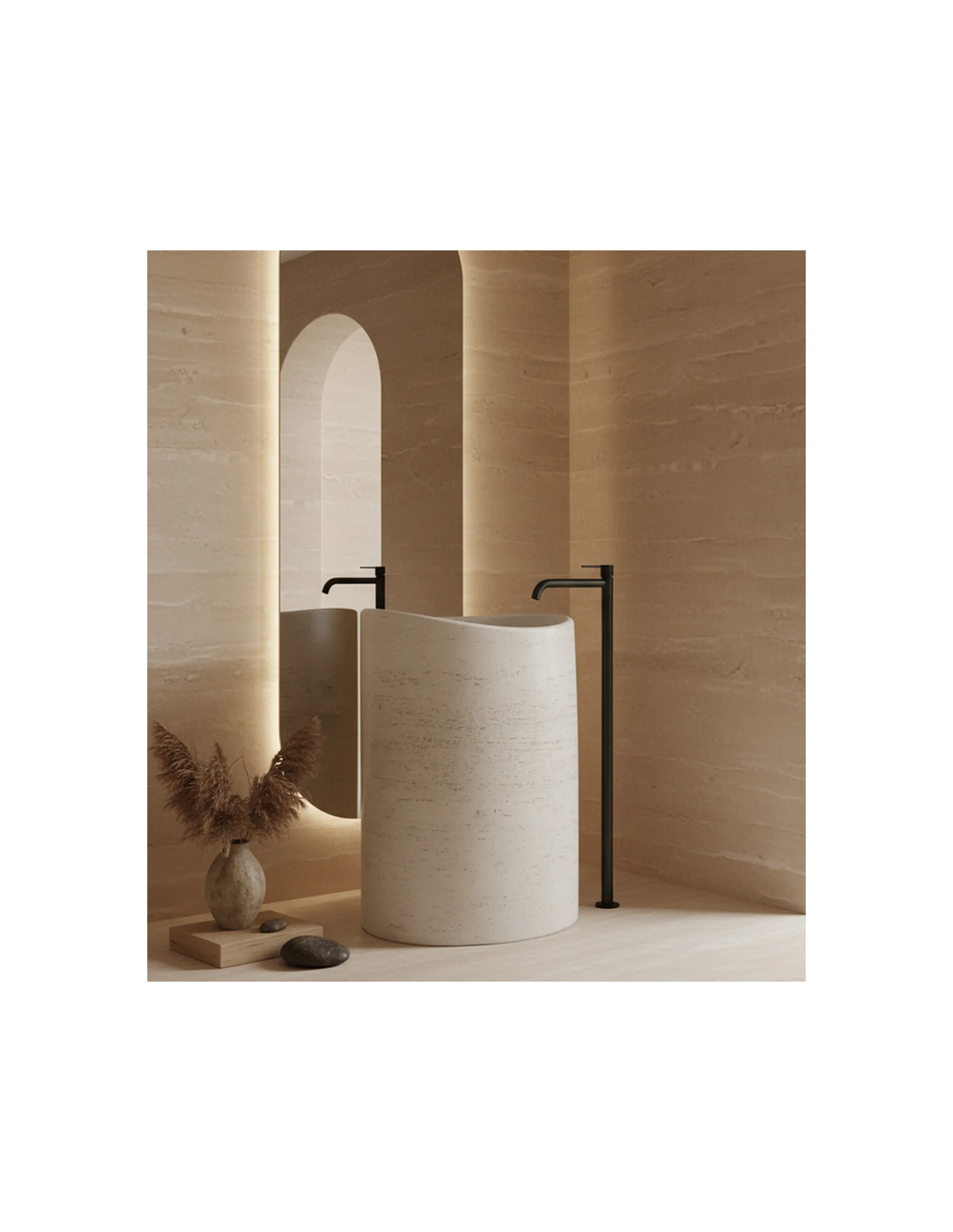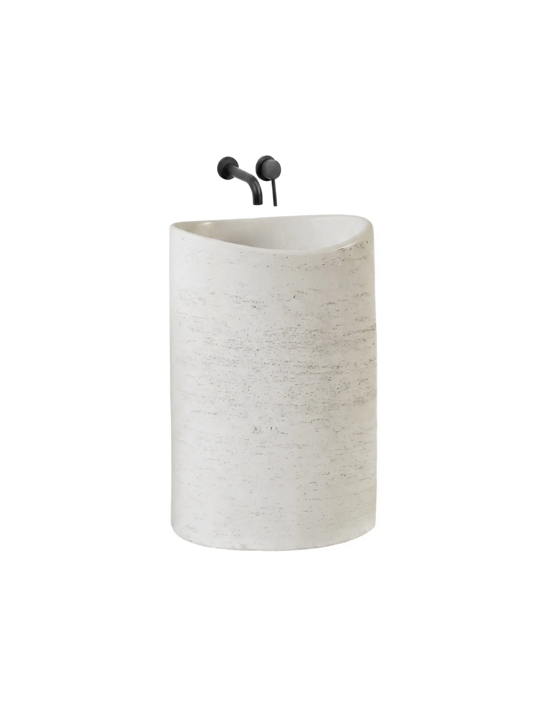 Gulvmonteret oval håndvask udført i et rustikt design af mat naturfarvet kompositsten. Håndvasken måler 85,5 cm i højden og 55 x 34 cm i bredde og dybde. Håndvasken leveres uden bundventil og andet vist tilbehør. På bagsiden af vasken forefindes åbninger til rørudføring.