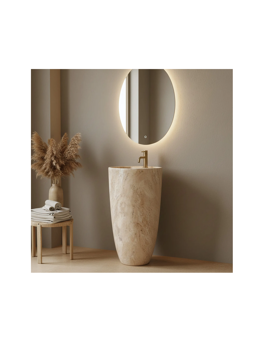 Gulvmonteret rund håndvask udført i et moderne design af mat travertin farvet keramik. Håndvasken måler 83,5 cm i højden og 45 cm i diameter. Håndvasken leveres uden bundventil og andet vist tilbehør. På bagsiden af vasken forefindes åbninger til rørudføring.