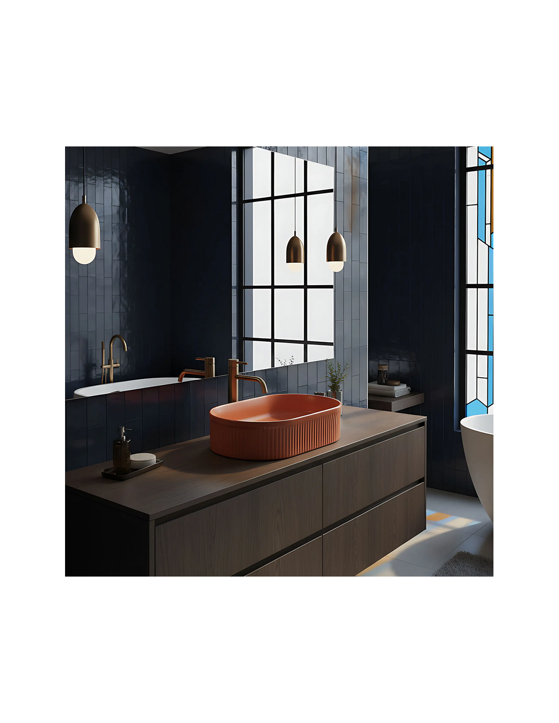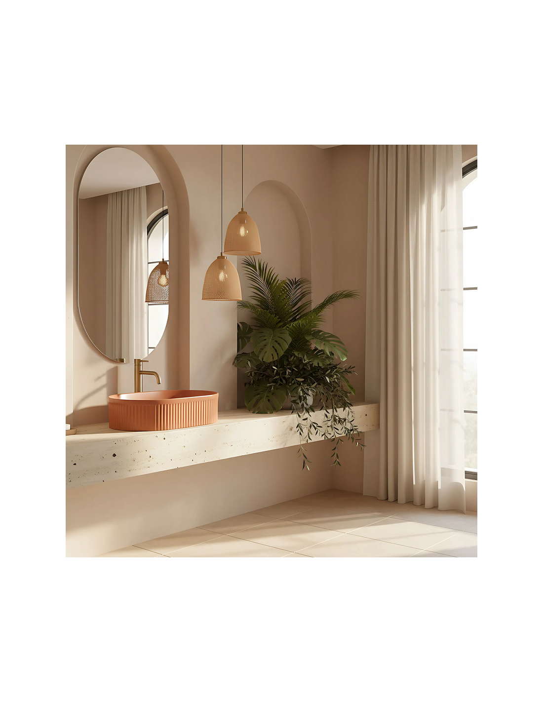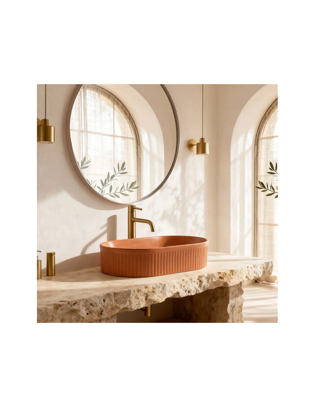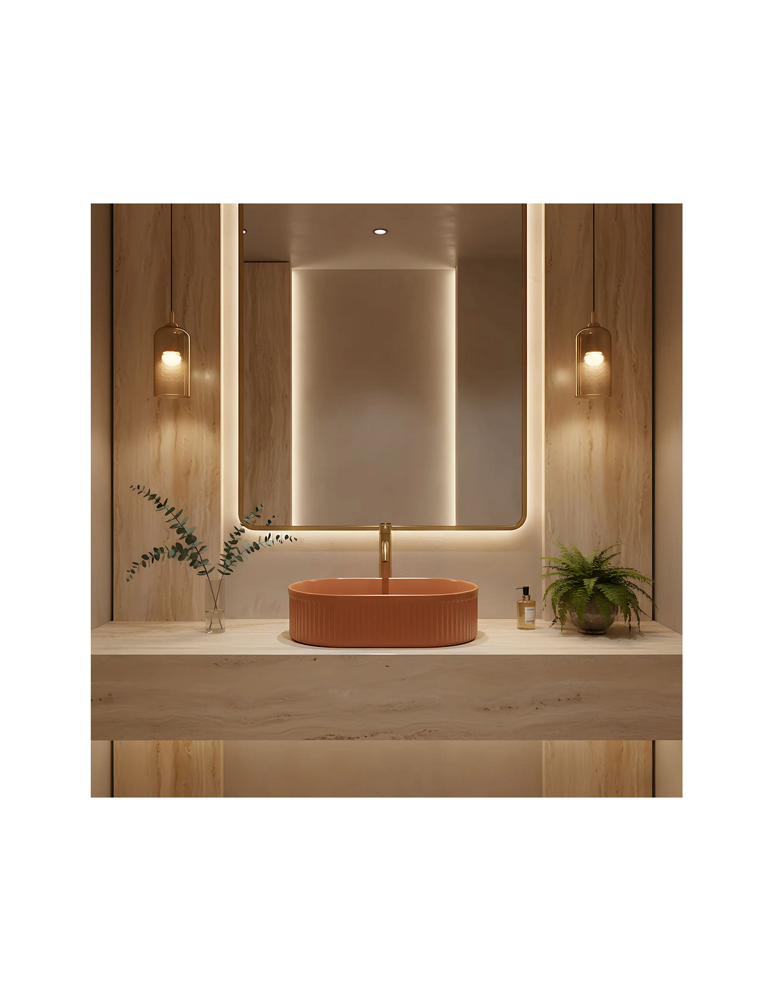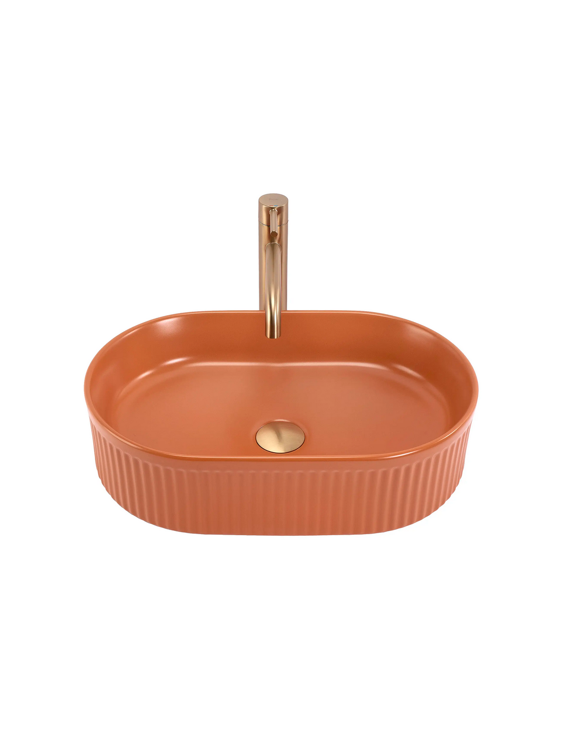 Bordmonteret oval håndvask udført i et moderne design af mat kanelfarvet sanitær keramik. Håndvasken måler 49 x 31 cm i bredde og dybde. Håndvasken leveres uden bundventil og andet vist tilbehør.