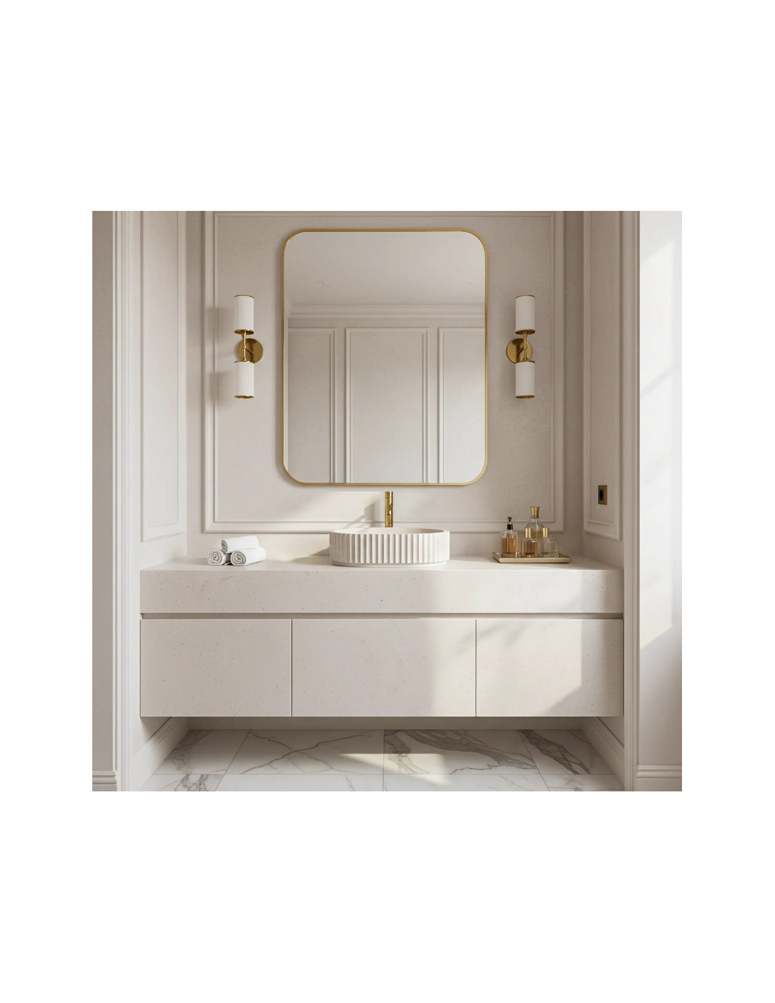 MARGARET Bordmonteret håndvask udført i et let rustikt design af beige stenkomposit. Håndvasken måler 48,5 x 35,5 cm i bredde og dybde. Håndvasken leveres uden bundventil og andet vist tilbehør.