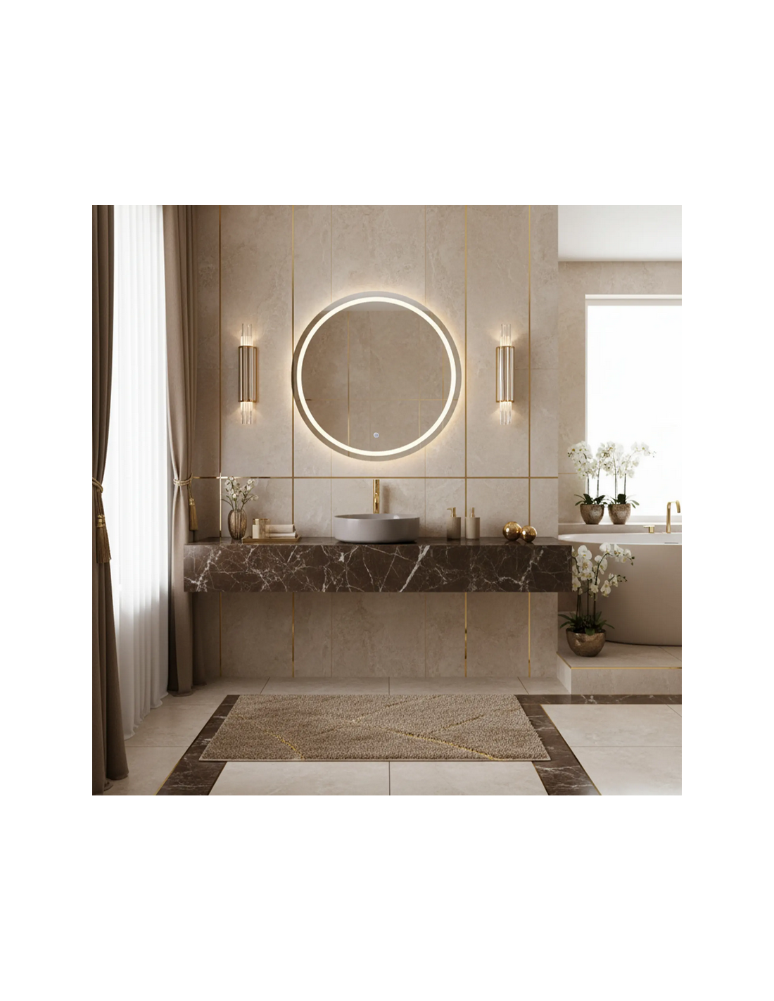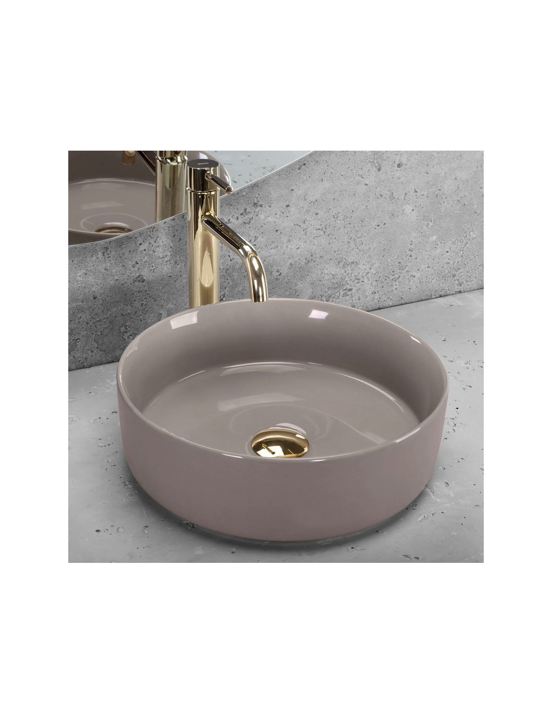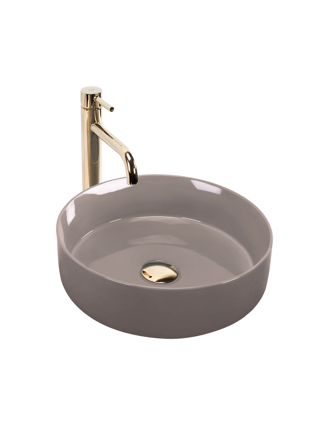 Bordmonteret håndvask udført i et moderne design af blank mokkafarvet sanitær keramik. Håndvasken måler 36 cm i diameter. Håndvasken leveres uden bundventil og andet vist tilbehør.
