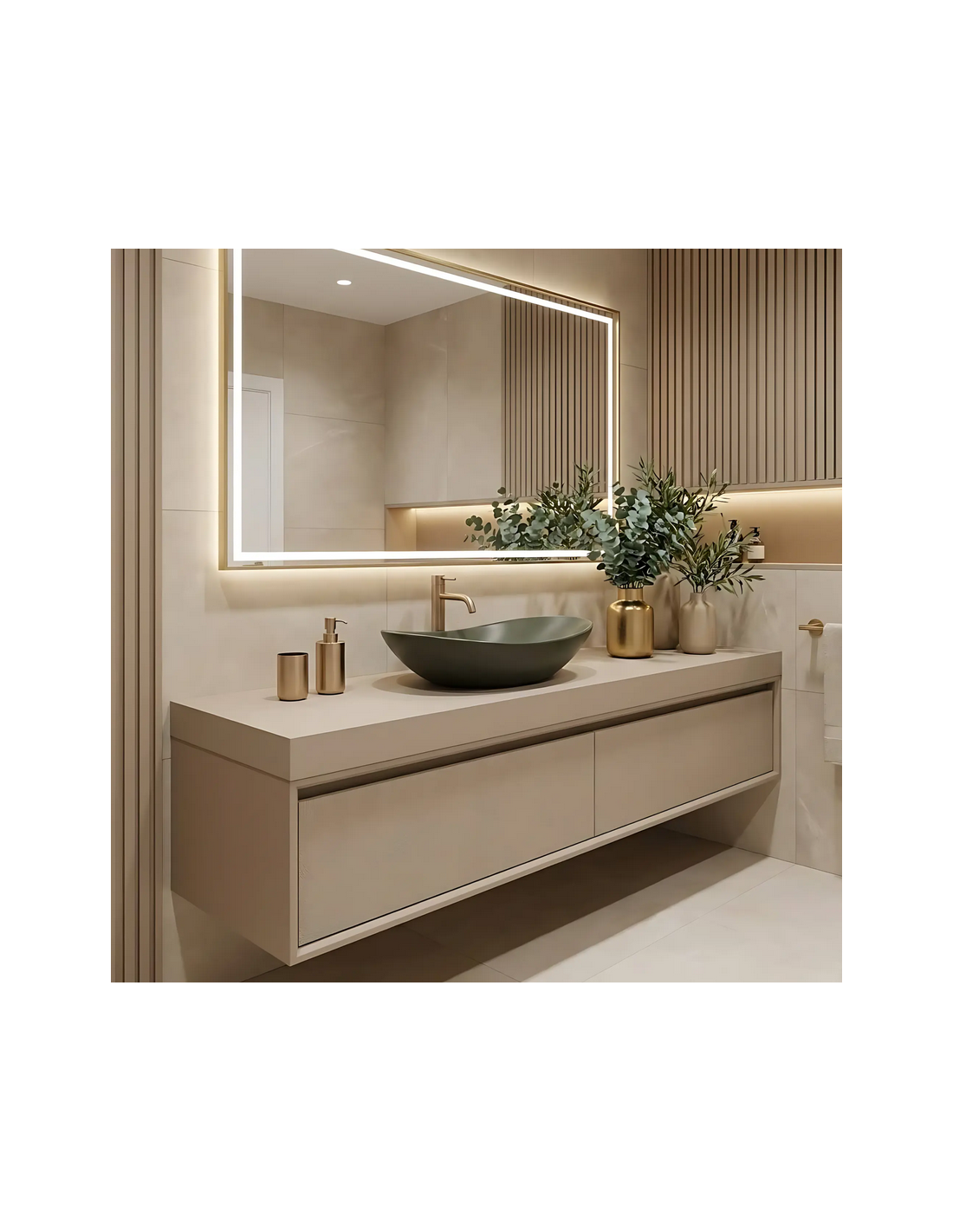 Bordmonteret håndvask udført i et moderne design af mat olivengrøn sanitær keramik. Håndvasken måler 61,5 x 35,5 cm i bredde og dybde. Håndvasken leveres uden bundventil og andet vist tilbehør.