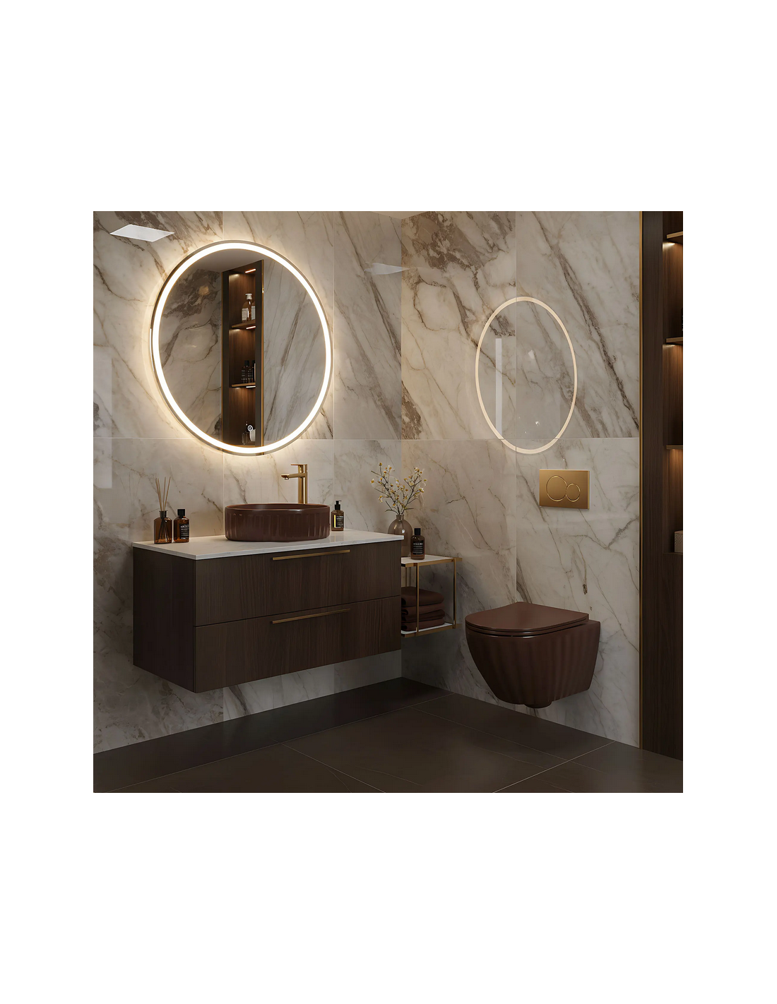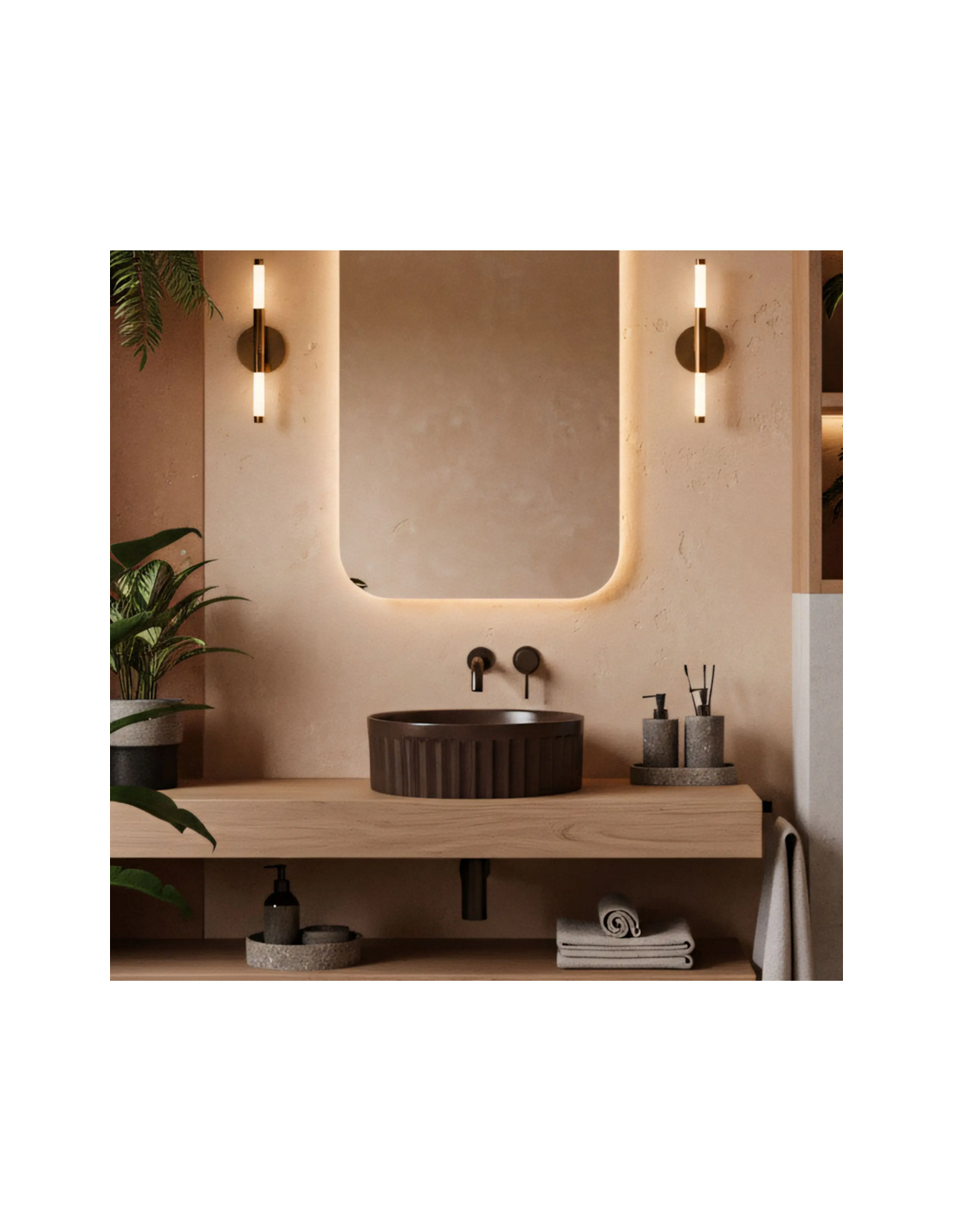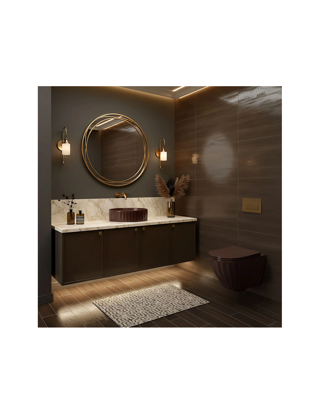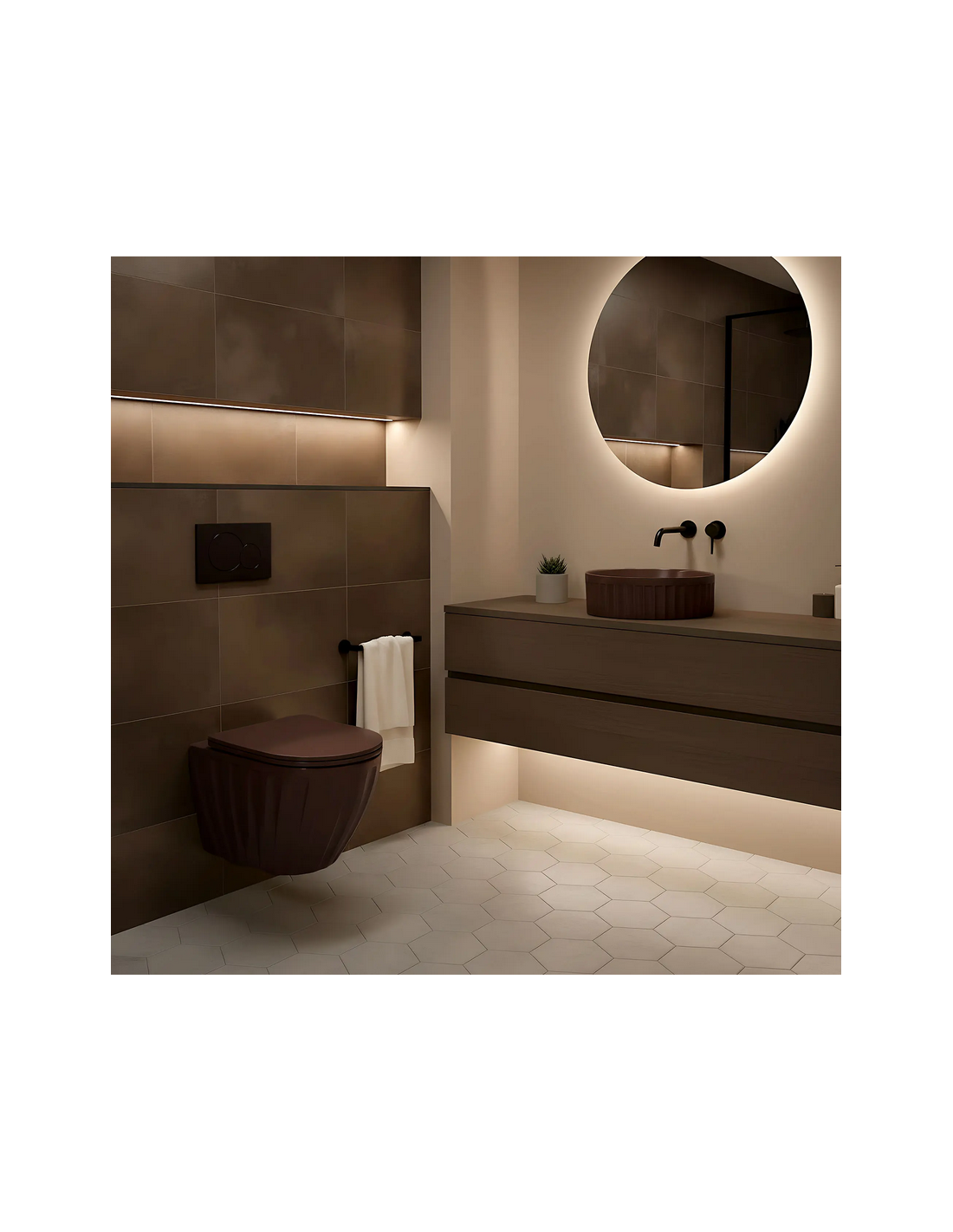 Bordmonteret håndvask udført i et moderne design af mat espressofarvet sanitær keramik. Håndvasken måler 38 cm i diameter. Håndvasken leveres uden bundventil og andet vist tilbehør.