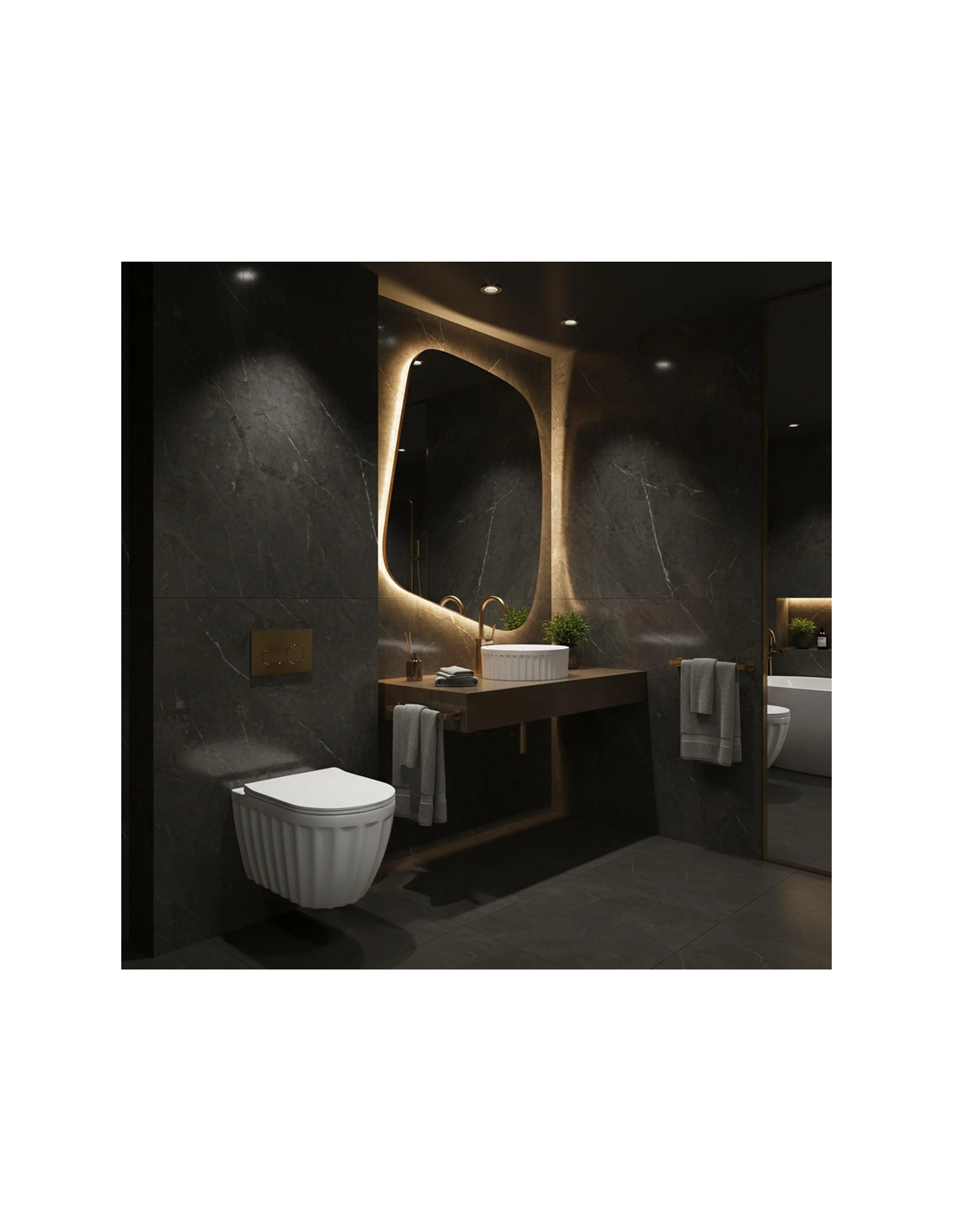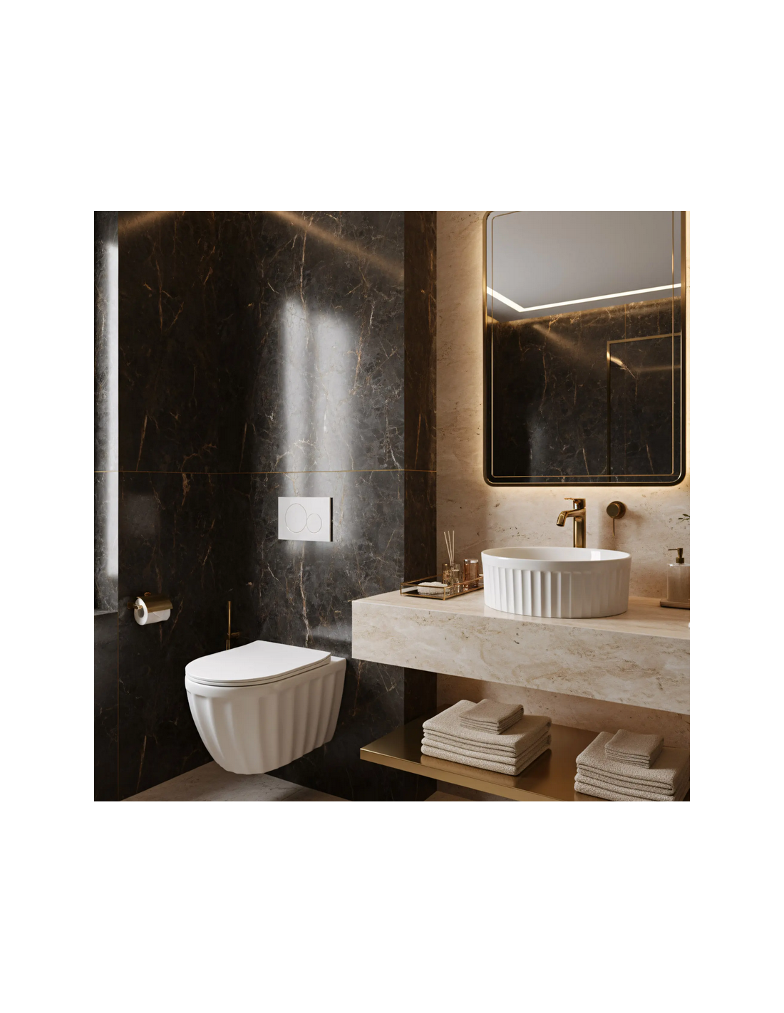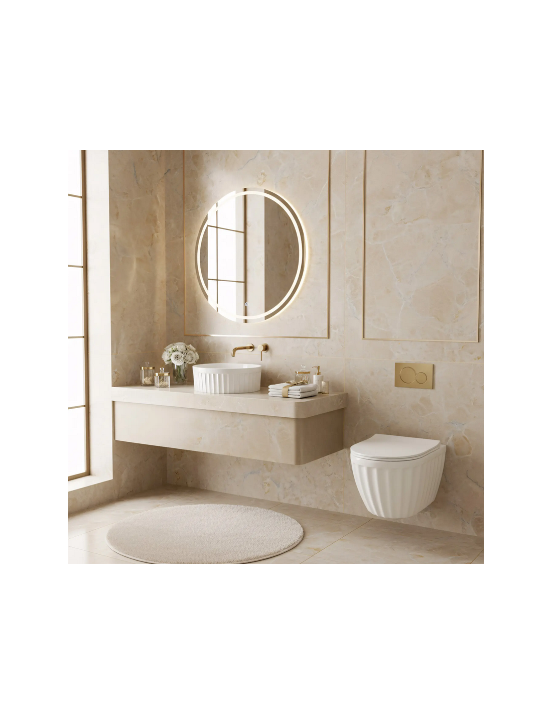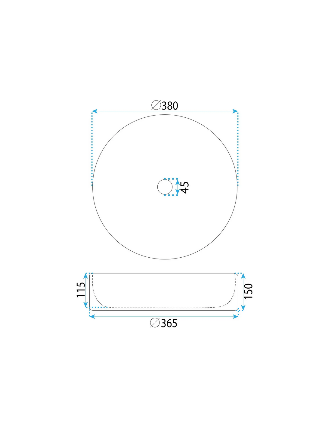 Bordmonteret håndvask udført i et moderne design af hvid sanitær keramik. Håndvasken måler 38 cm i diameter. Håndvasken leveres uden bundventil og andet vist tilbehør.